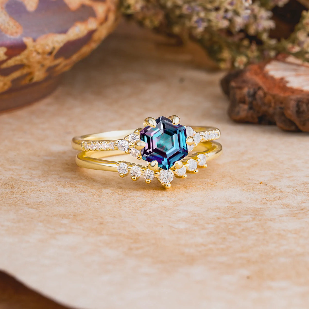 Classic 6-Prong Hexagonal-Cut Alexandrite Engagement Ring Set