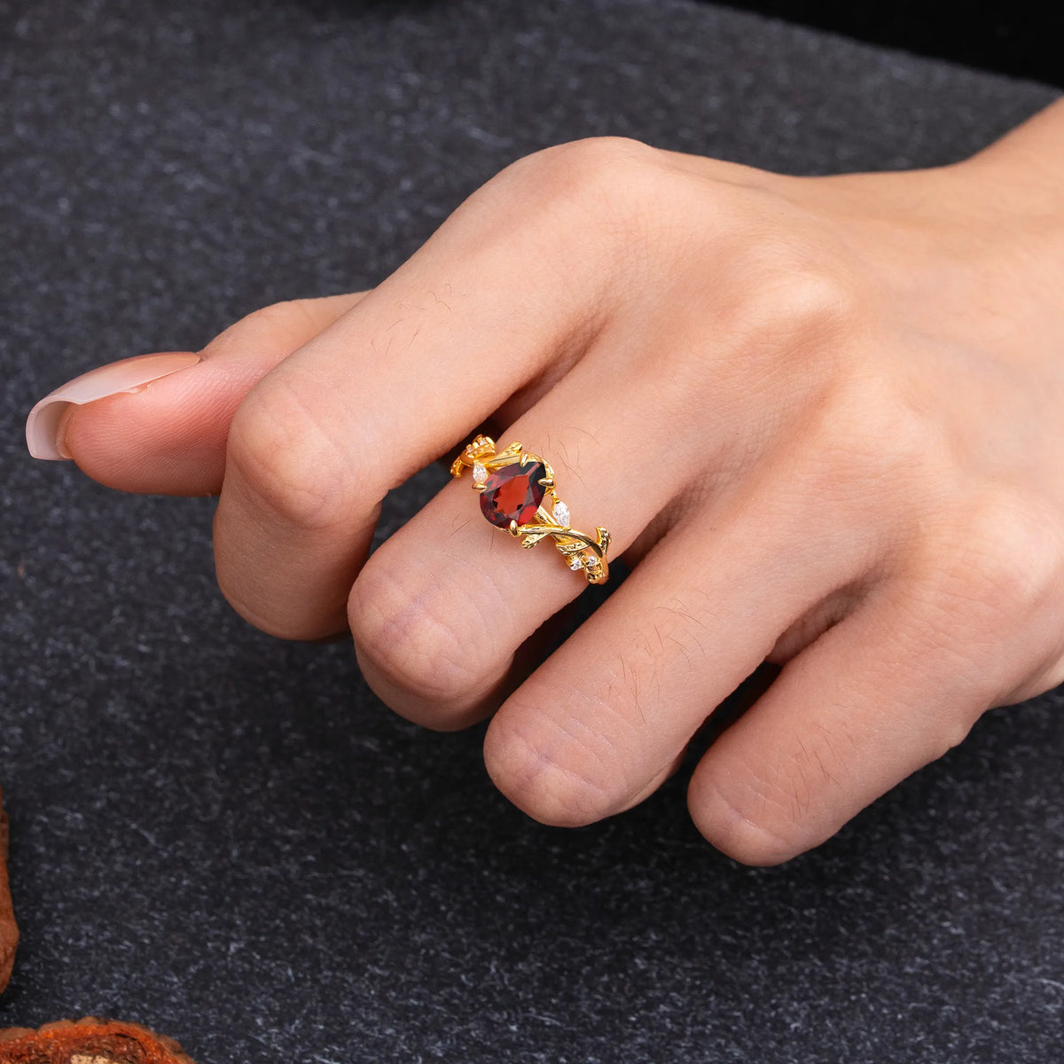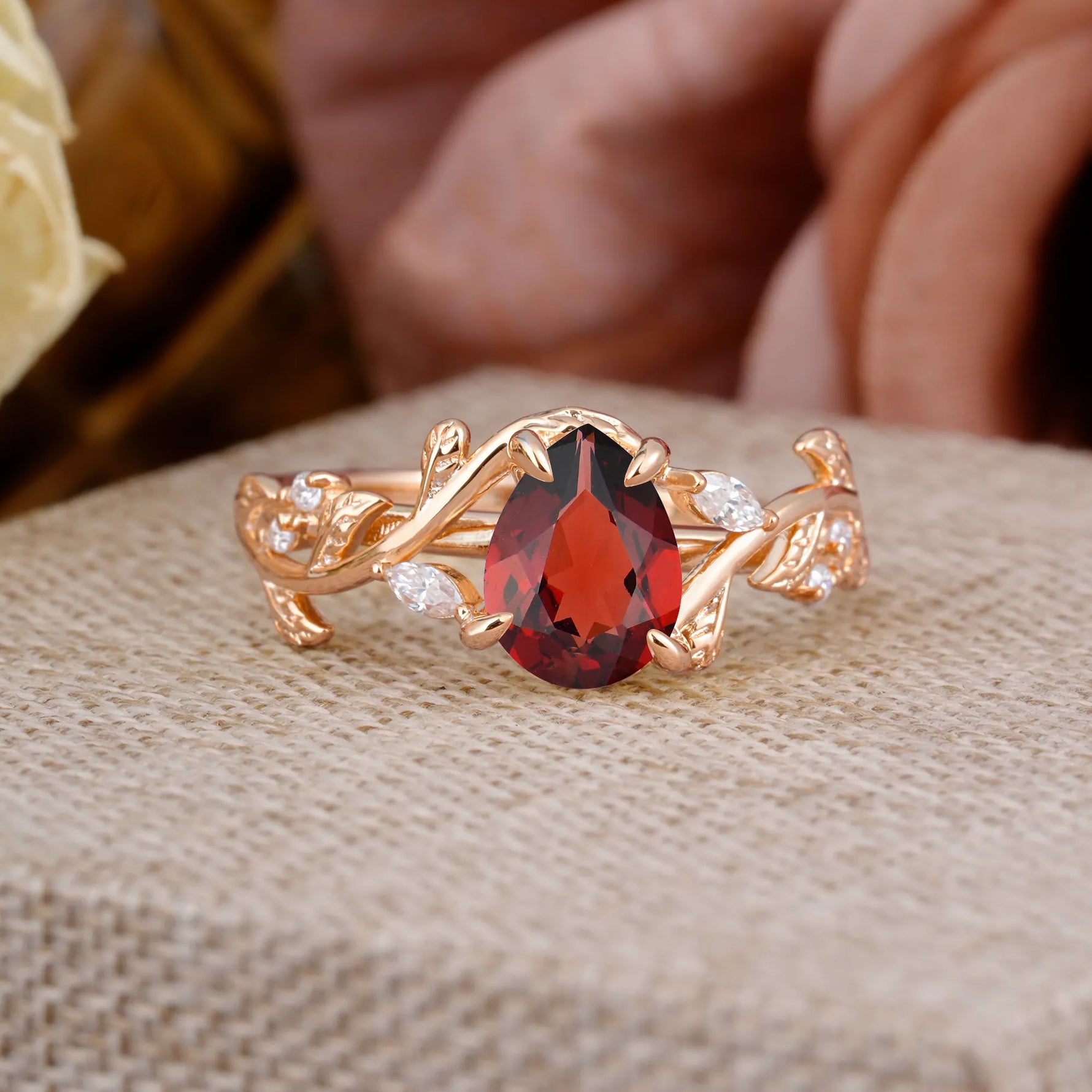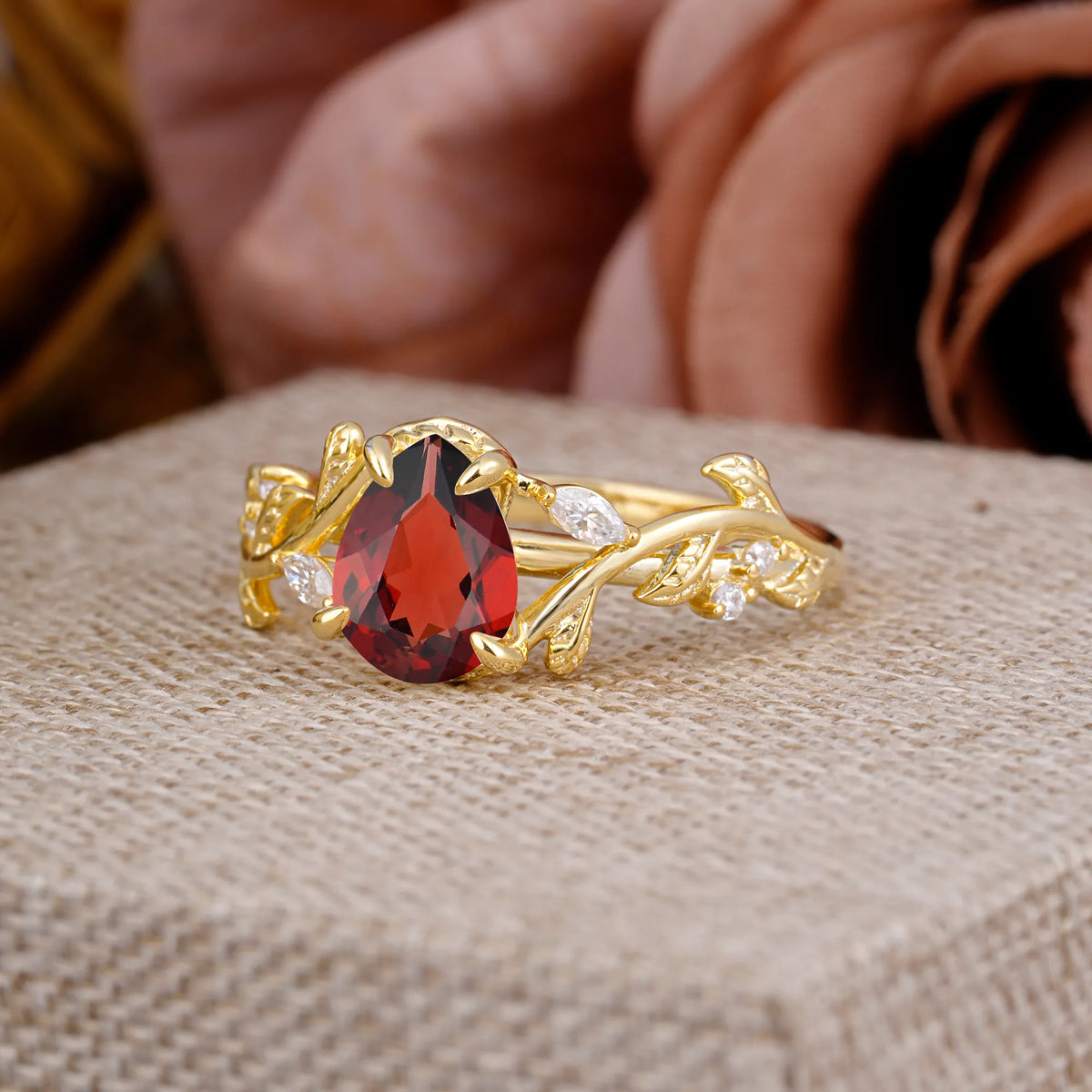 4 Prong Nature Inspired Pear Cut Natural Garnet Leaf Gold Engagement Ring