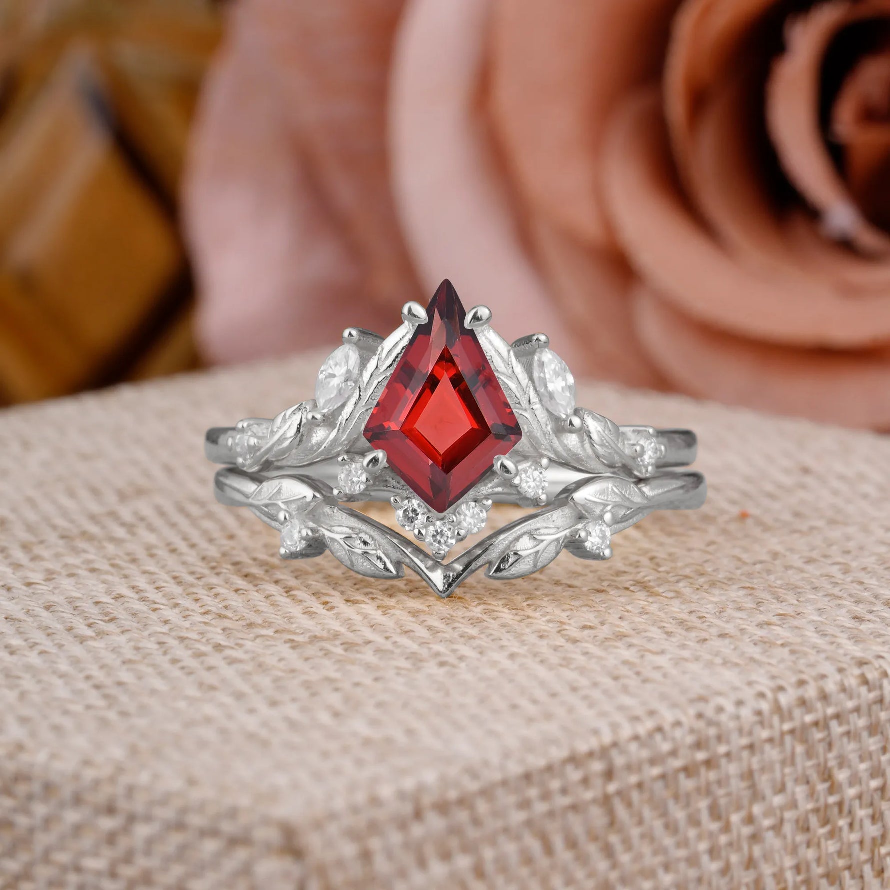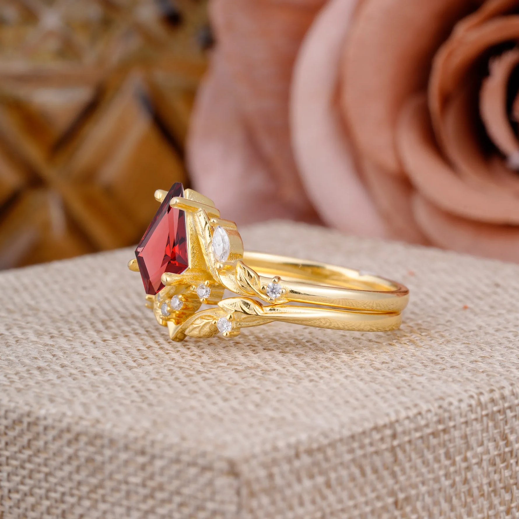 Nature Inspired The Dreamy Kite- Cut Natural Garnet with Fantasy Leaf Gold Ring Set