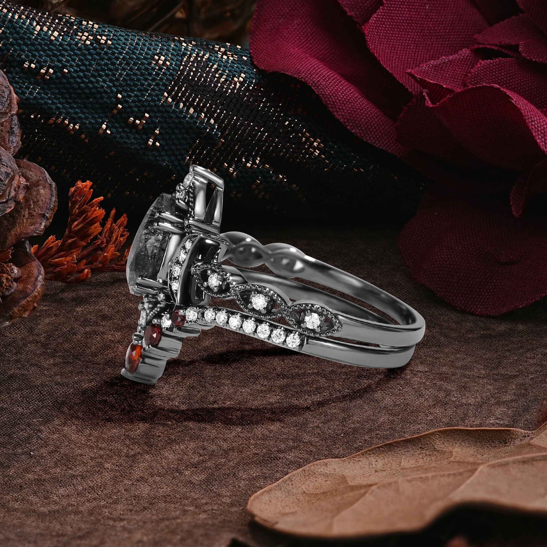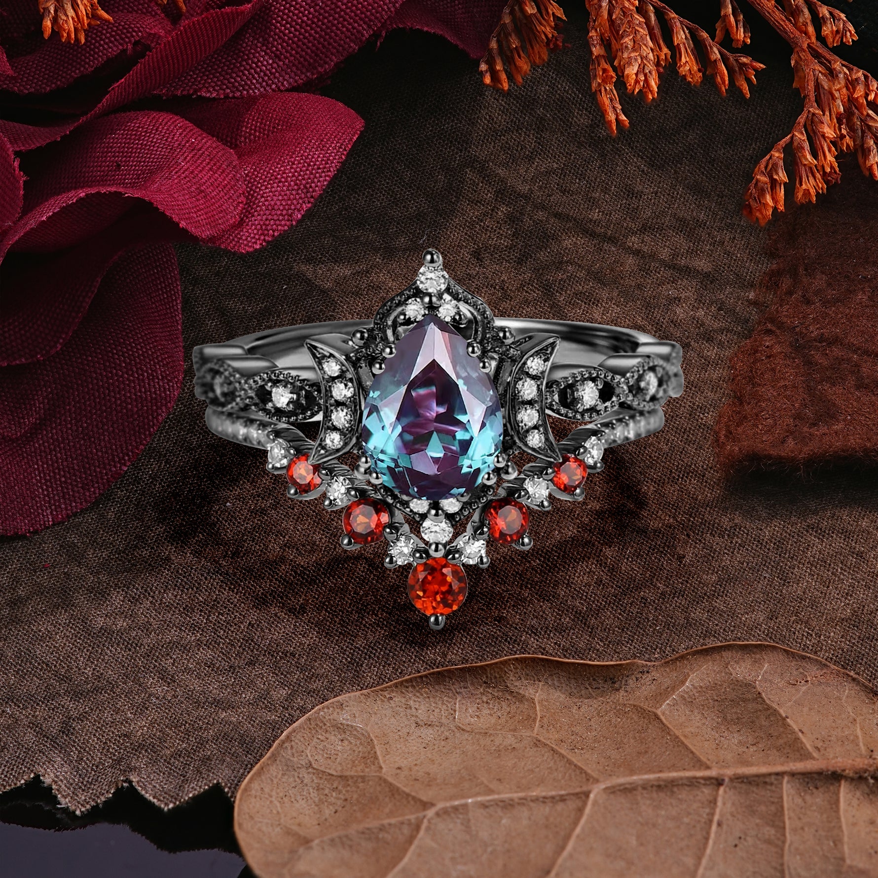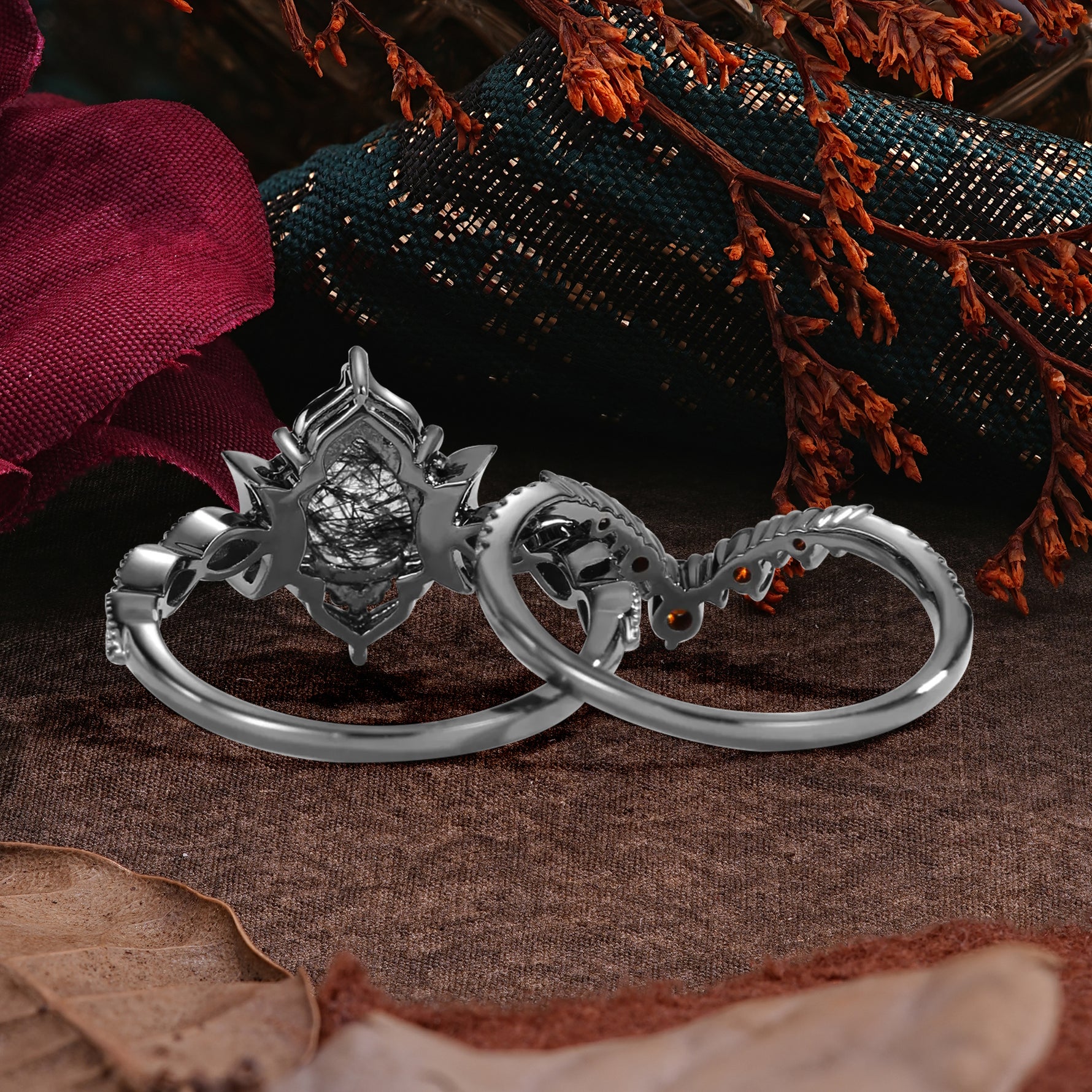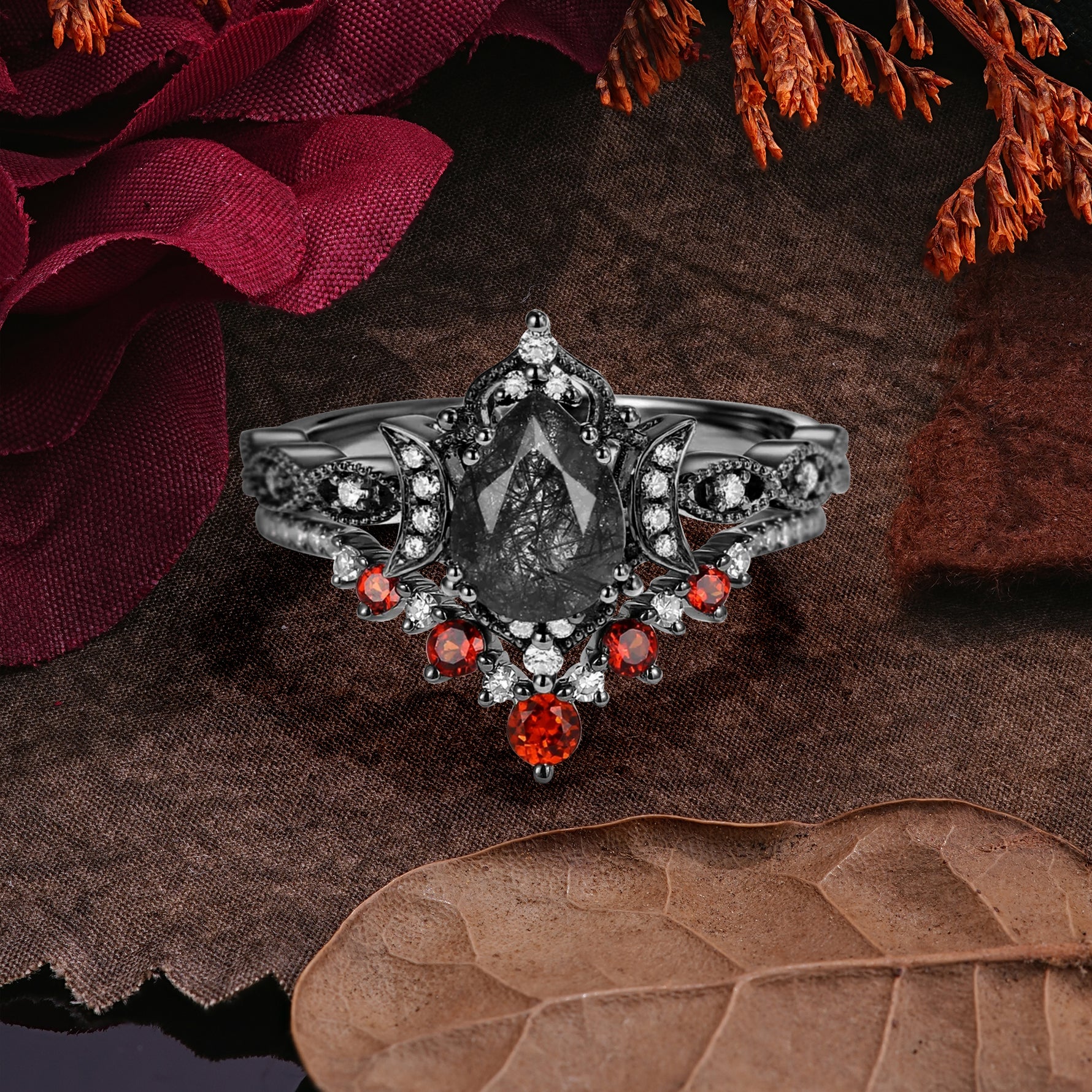 Halloween Limited-Crescent Moon | Luxury Pear Cut Black Rutilated Quartz Ring Set