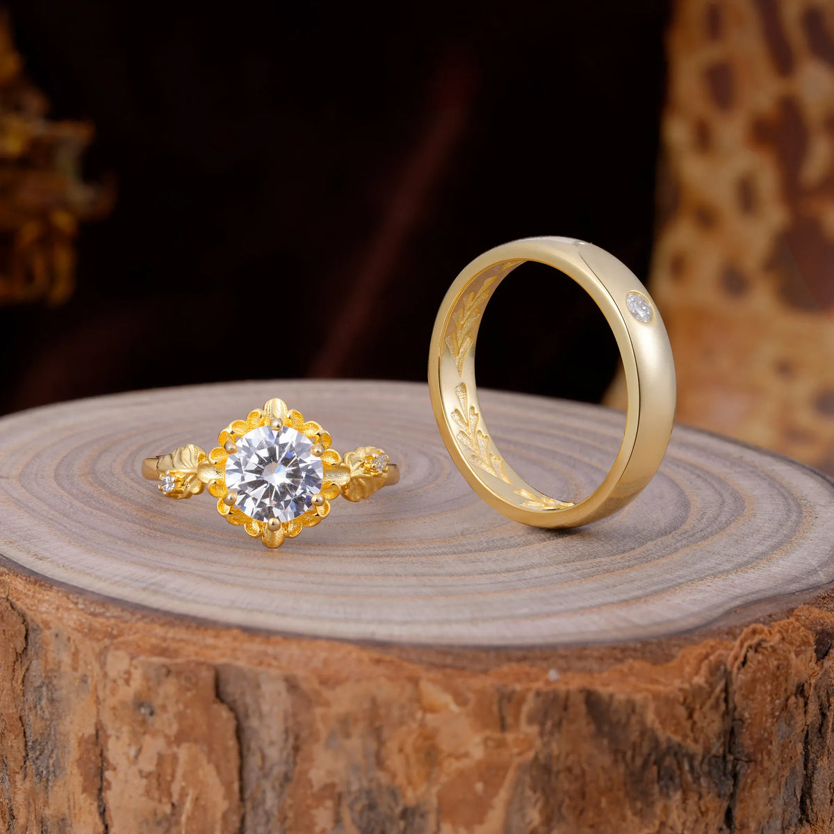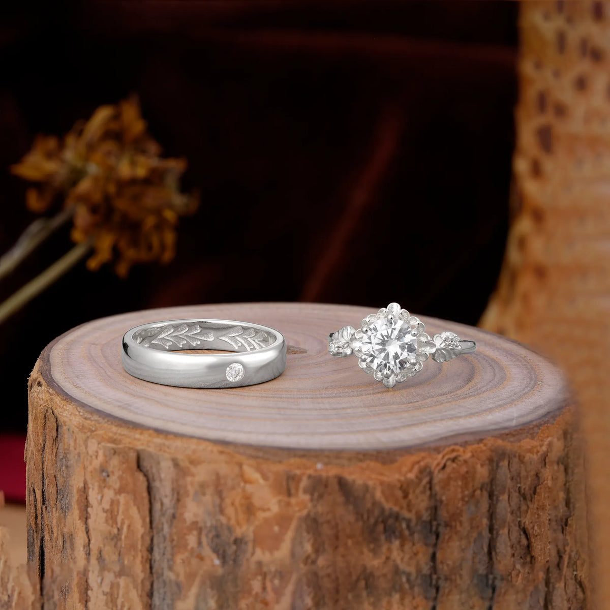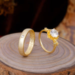 Elegant Floral Leaf Moissanite Center Wedding Couple Rings