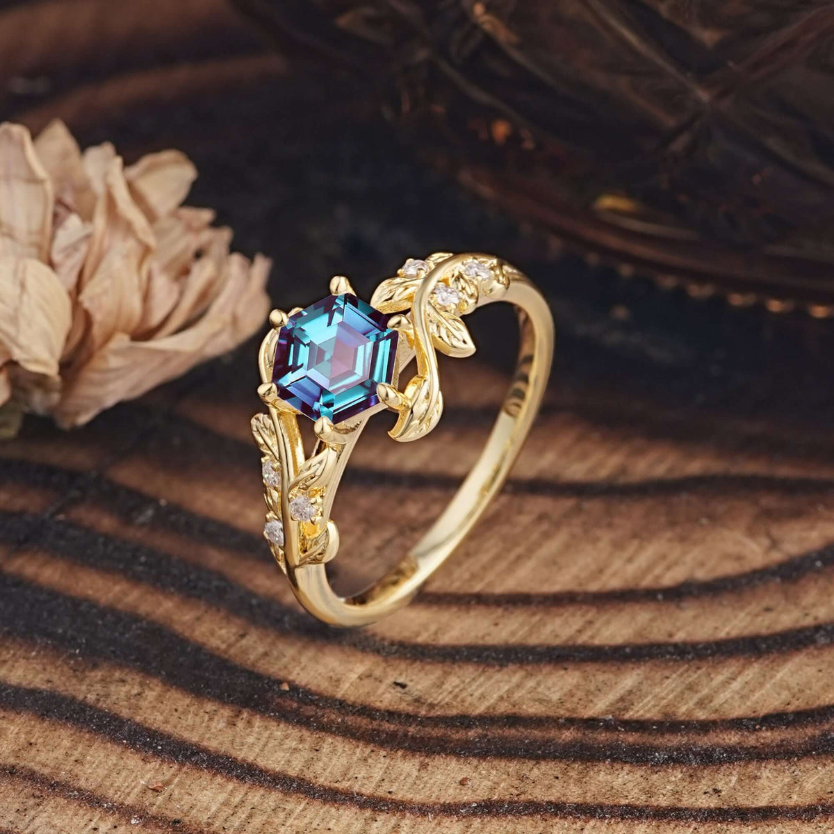 6 Prong Hexagon Cut Alexandrite Vine Flower Ring