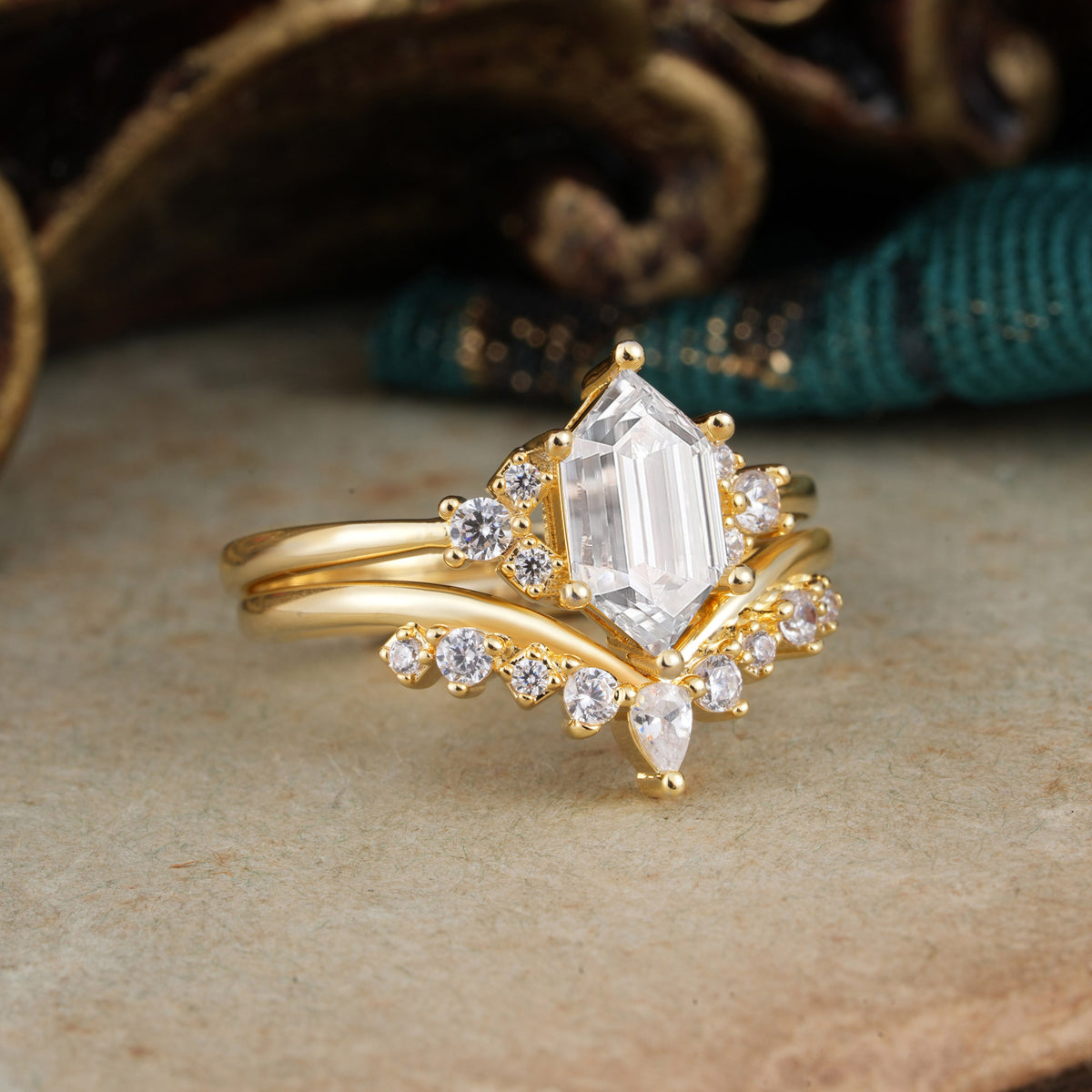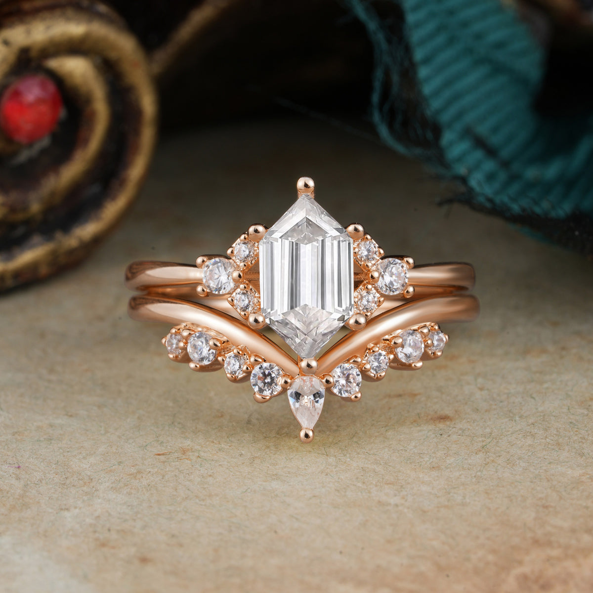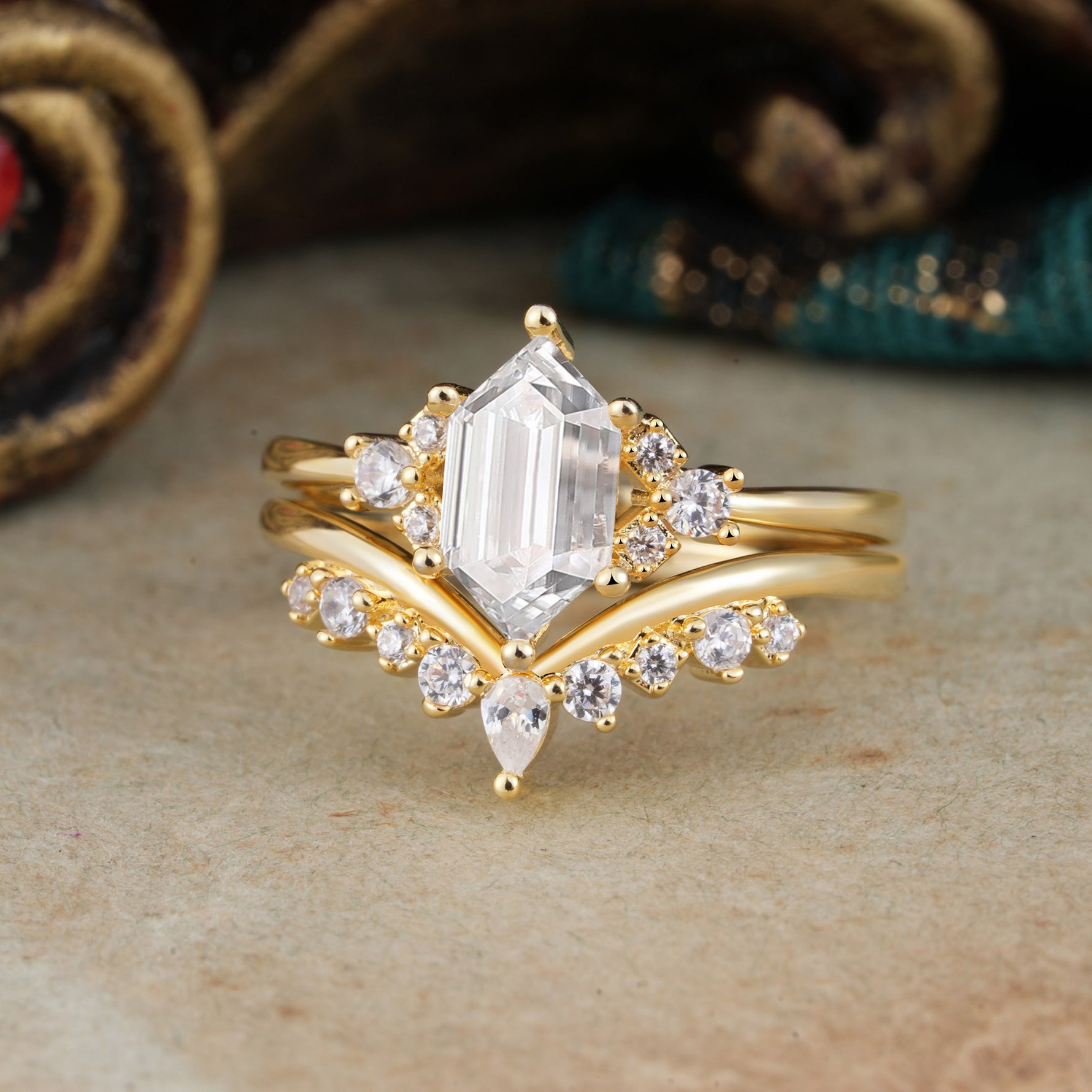 Luxury Vintage Classic 6-Prong Hexagonal-Cut Moissanite Engagement Ring Set