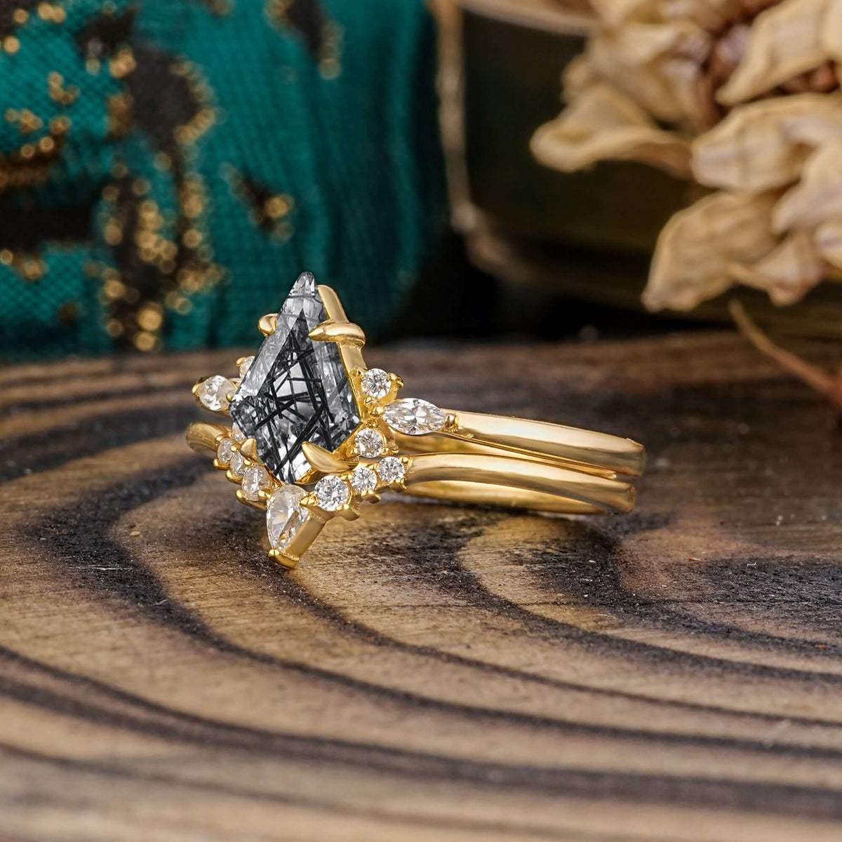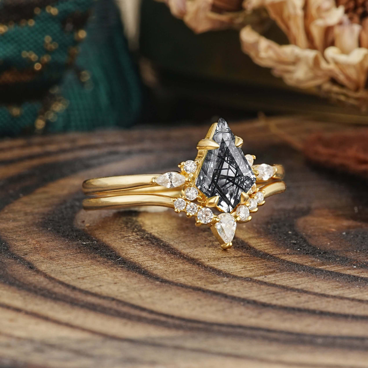 Classic Retro Luxury 4-Prong Kite-Cut Natural Black Rutilated Quartz Stackable Ring Set
