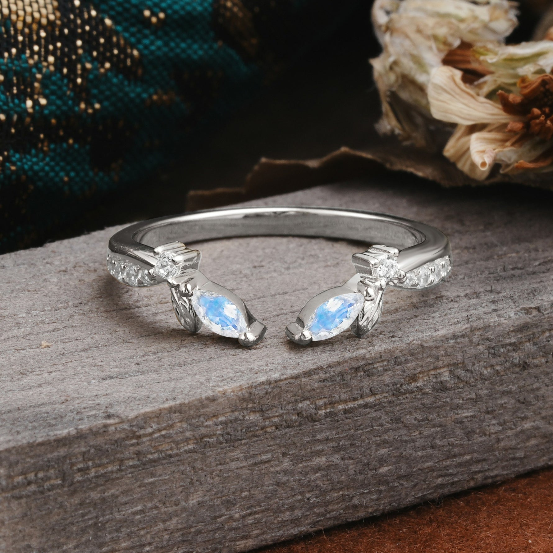 Crown Marquise Cut Moonstone Ring Wedding Band