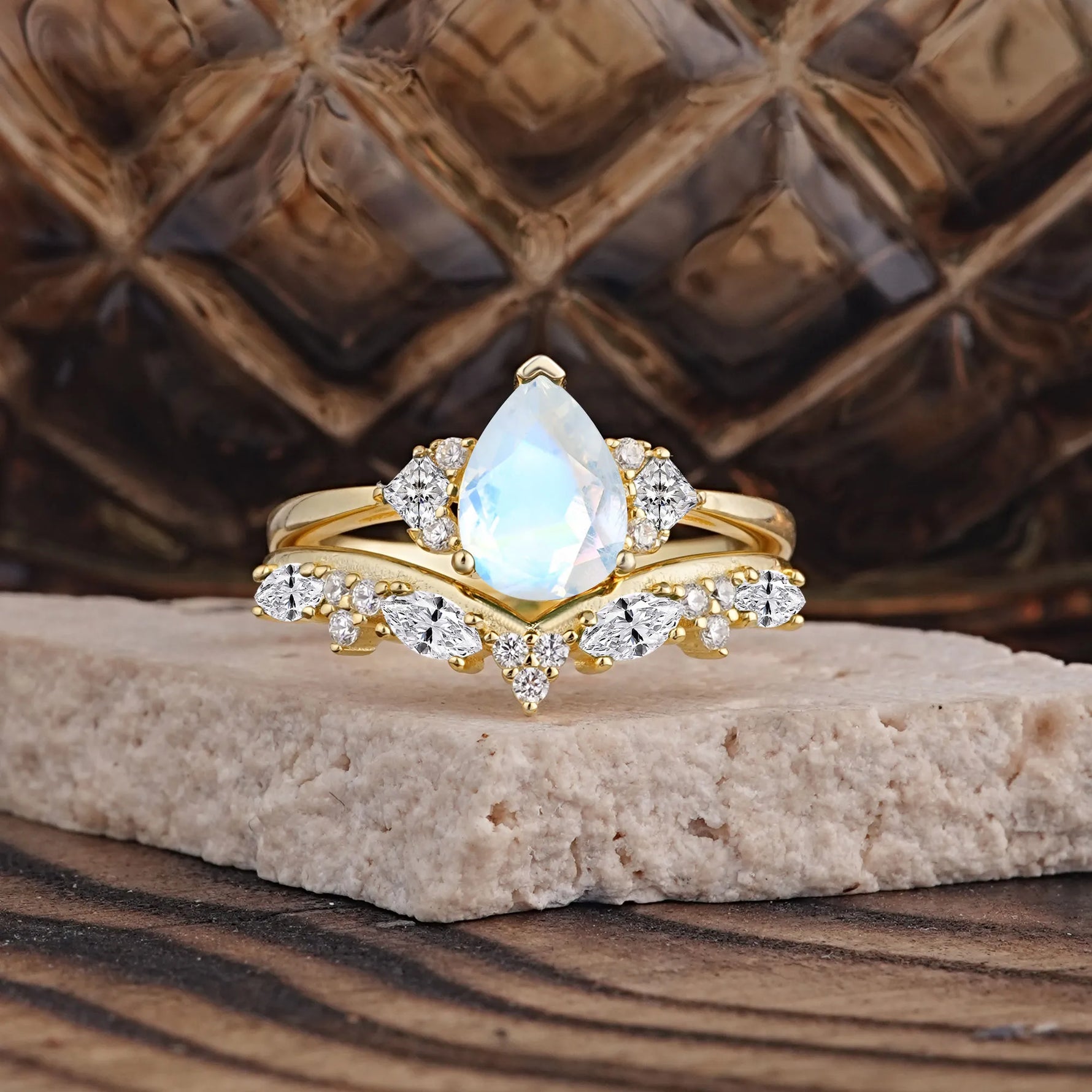 Luxury 3-Prong Pear-Cut Moonstone Engagement Ring Set