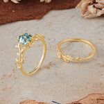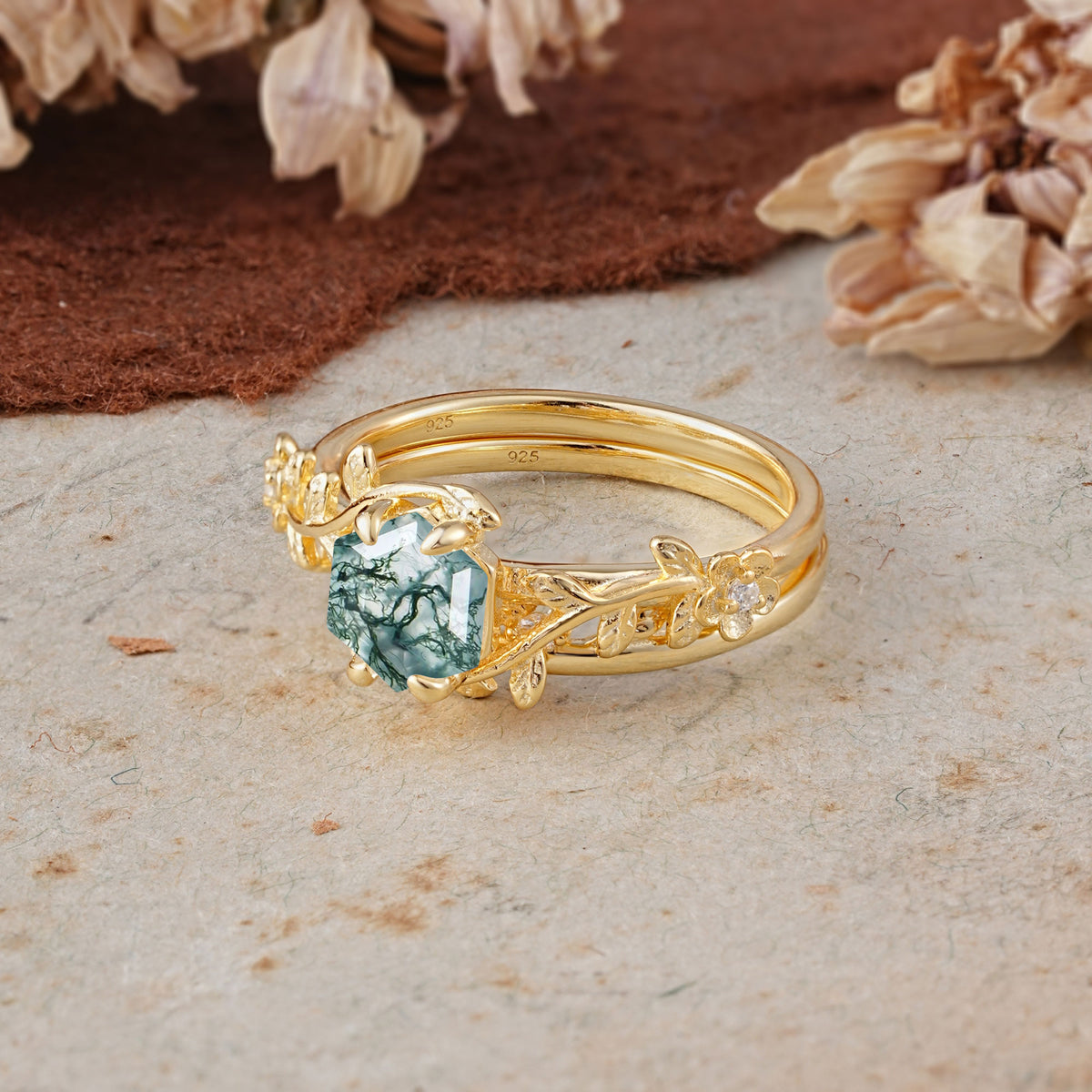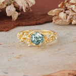 Naturalistic 4 - Prong Hexagon - Cut Natural Moss Agate Ring Sets