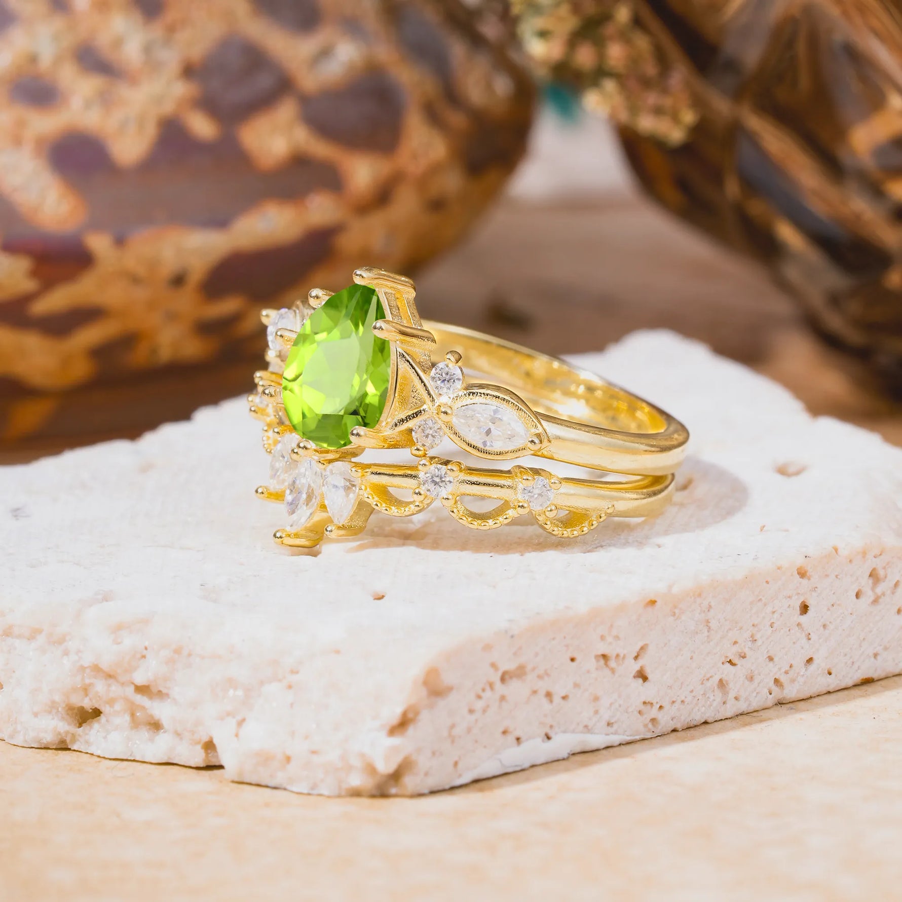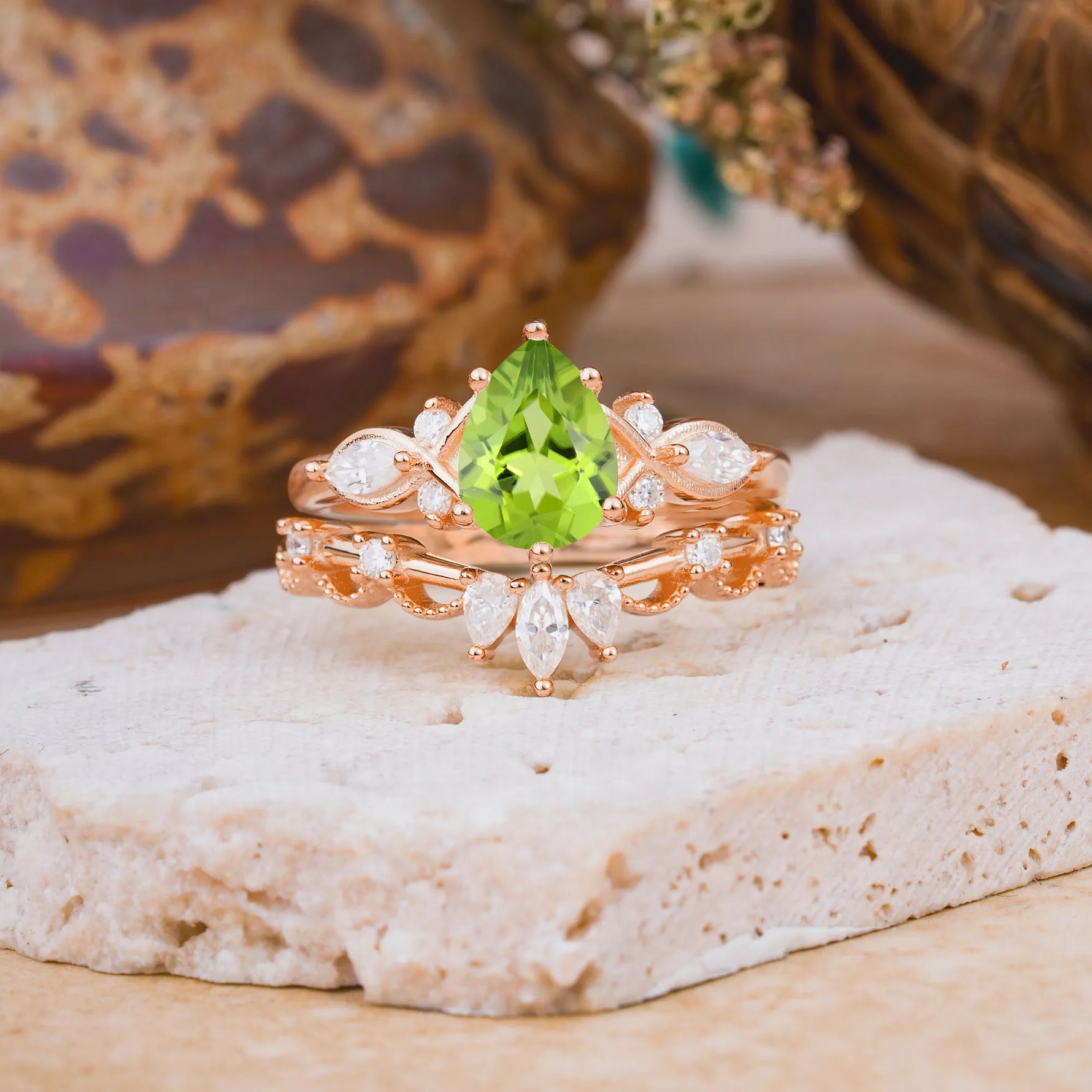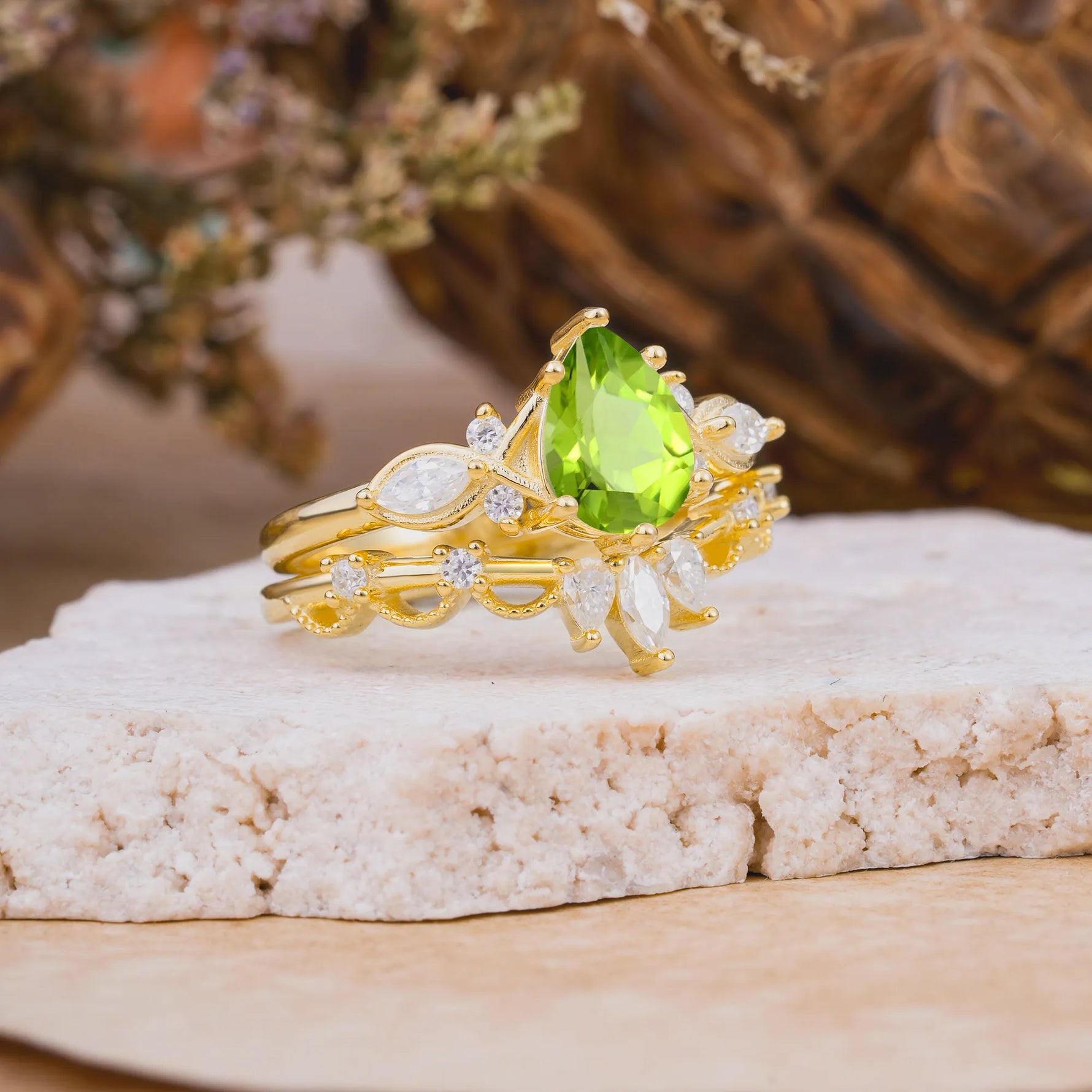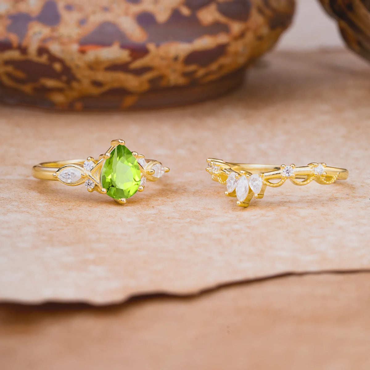 6 Prong Romantic Vine Themed Pear Cut Peridot Rings