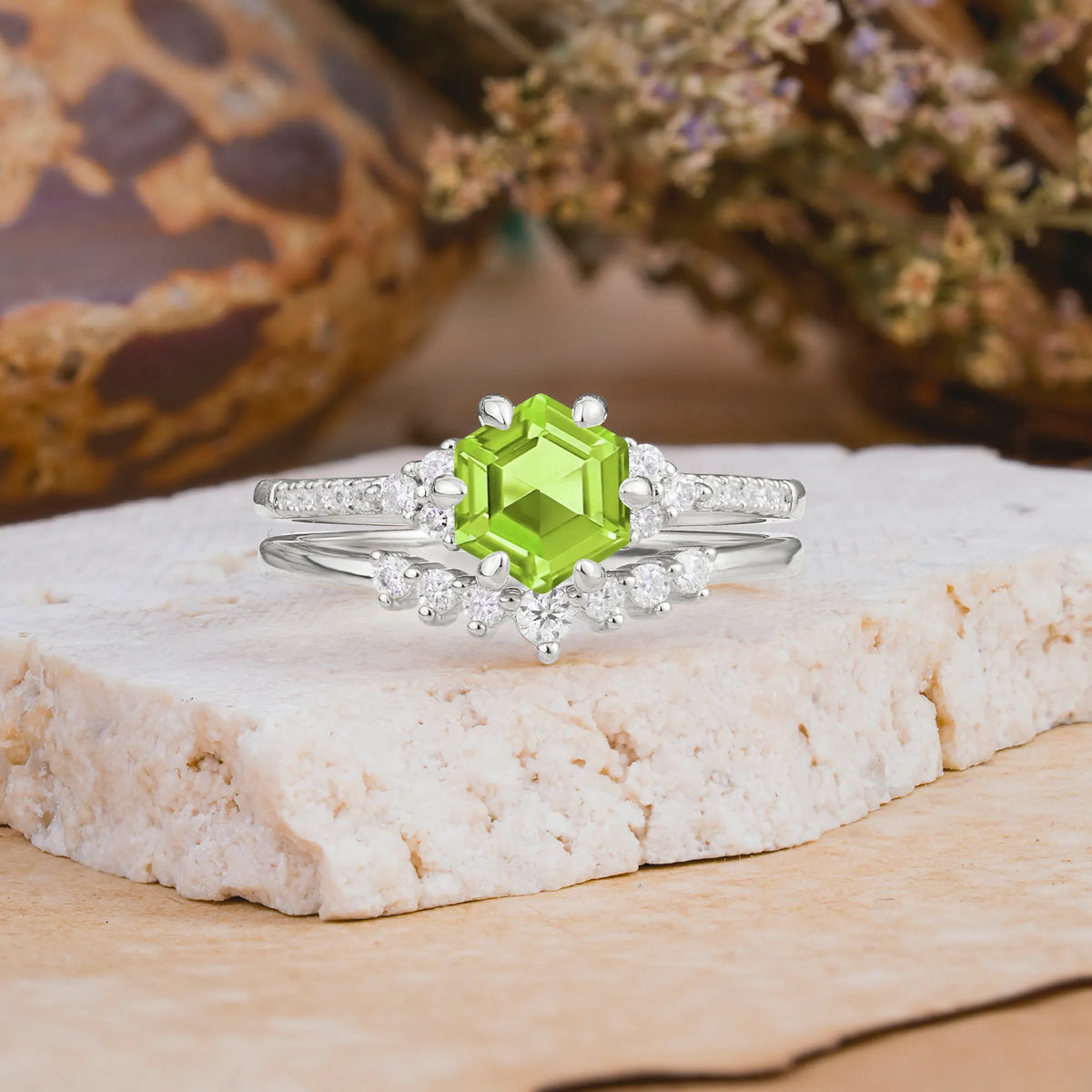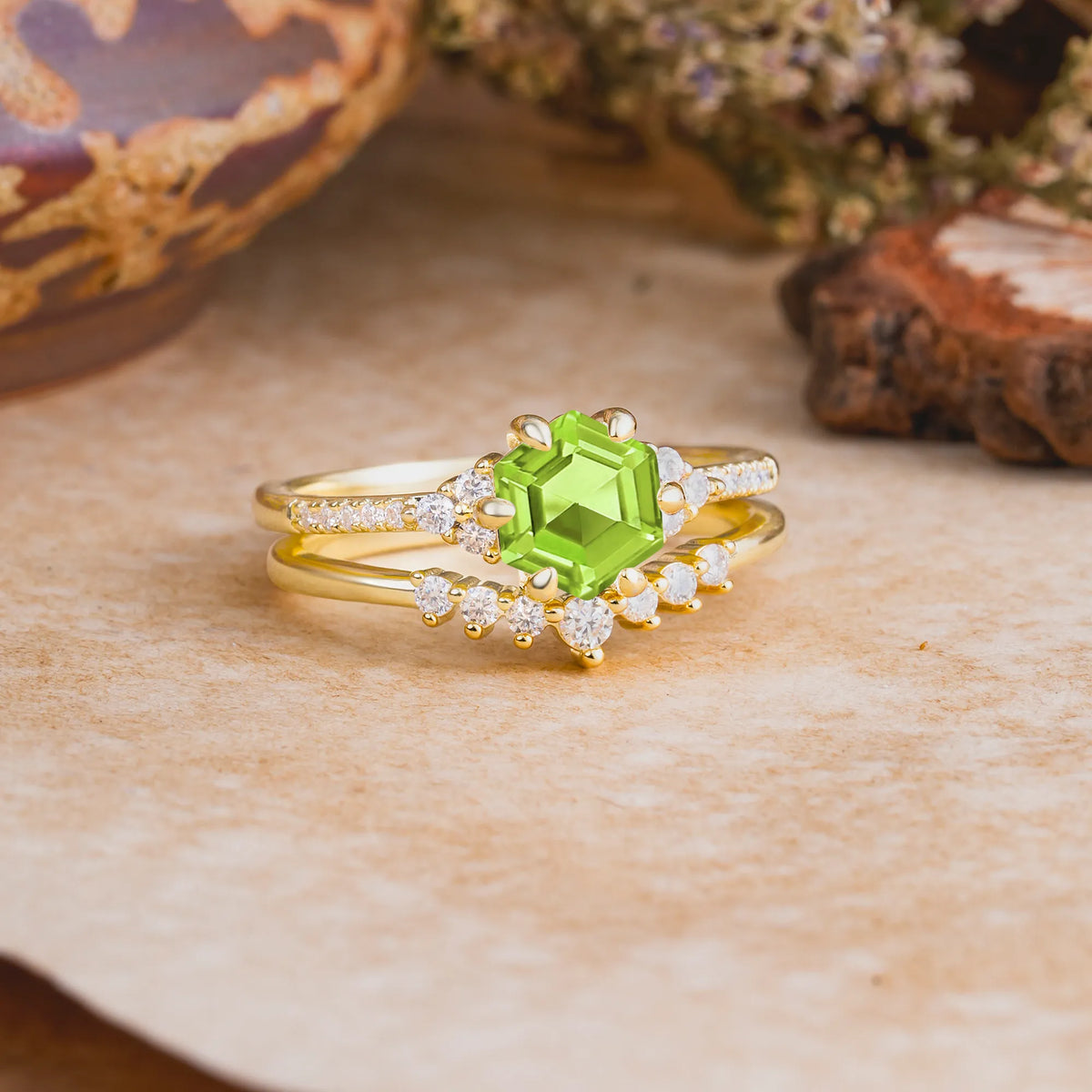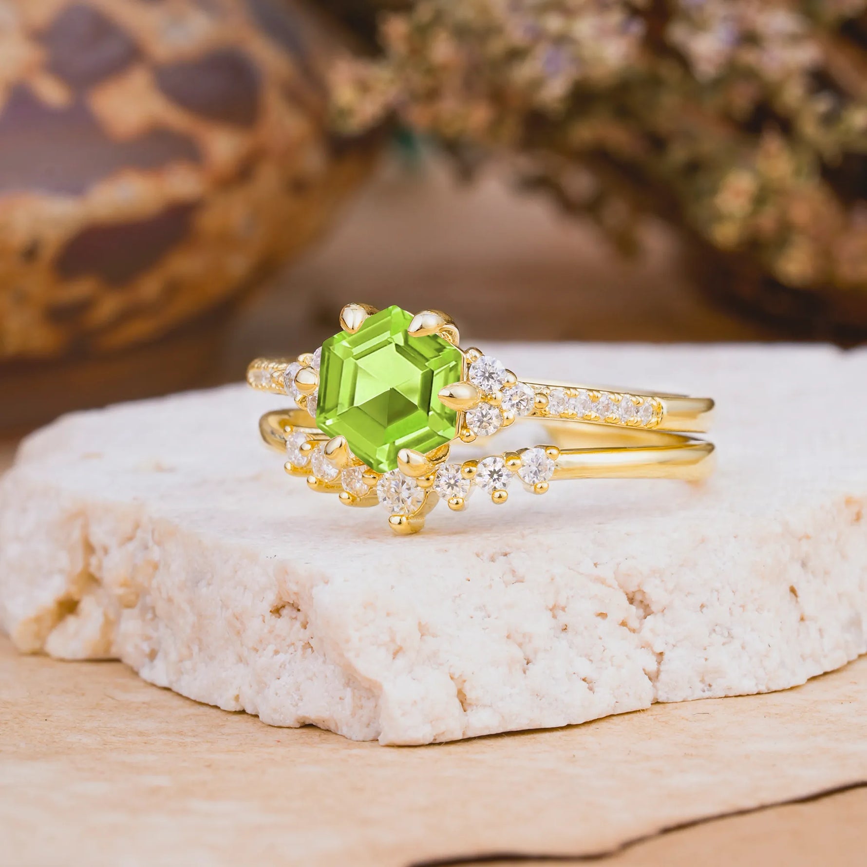 Classic 6-Prong Hexagonal-Cut Peridot Engagement Ring Set
