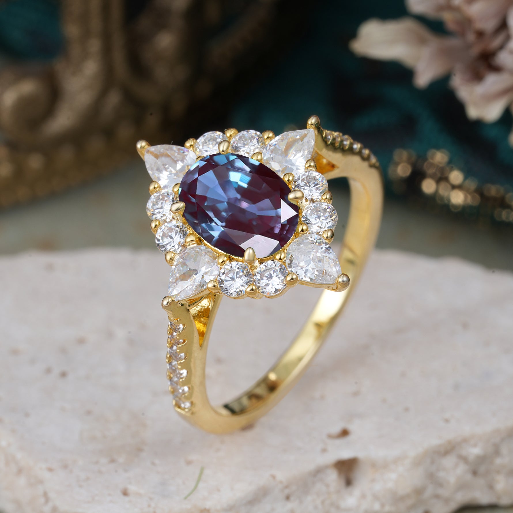 1.5CT Oval Cut Alexandrite Classic Side Stone 4 Prong Engagement Ring Unique Halo Bridal Ring
