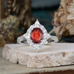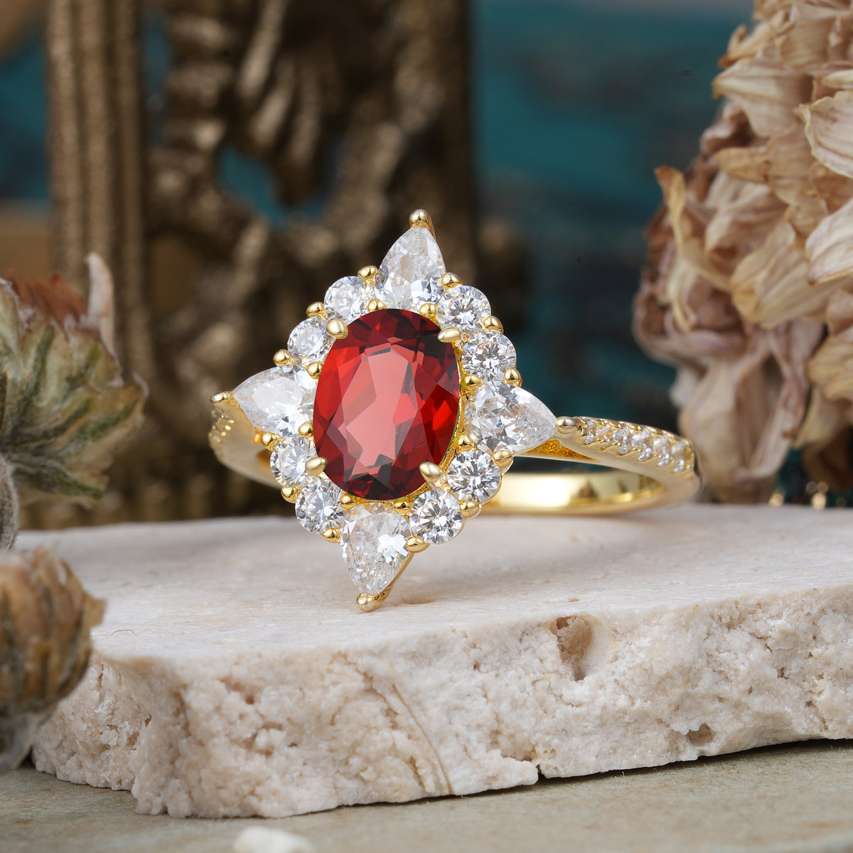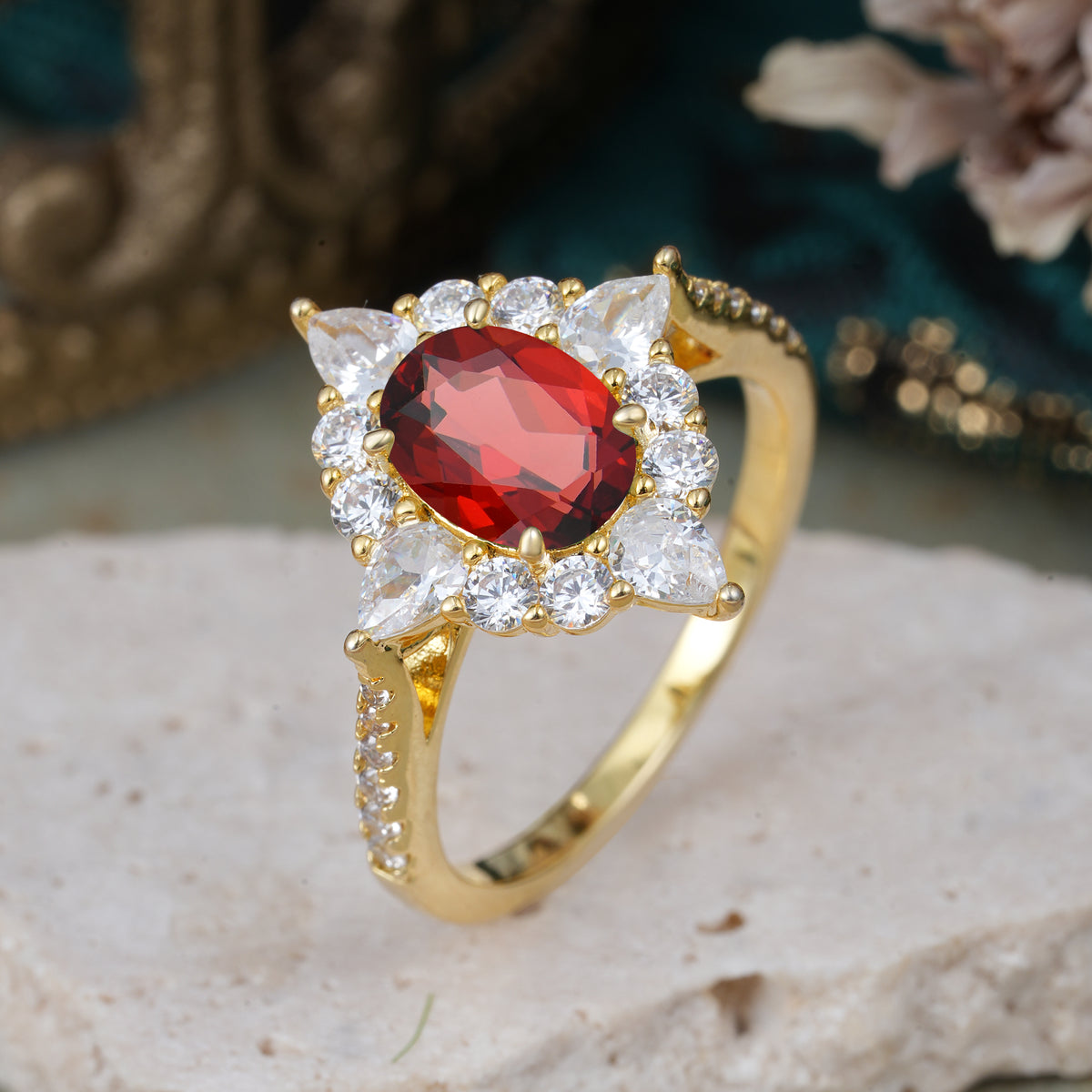 1.5CT Oval Cut Garnet Classic Side Stone 4 Prong Engagement Ring Unique Halo Bridal Ring