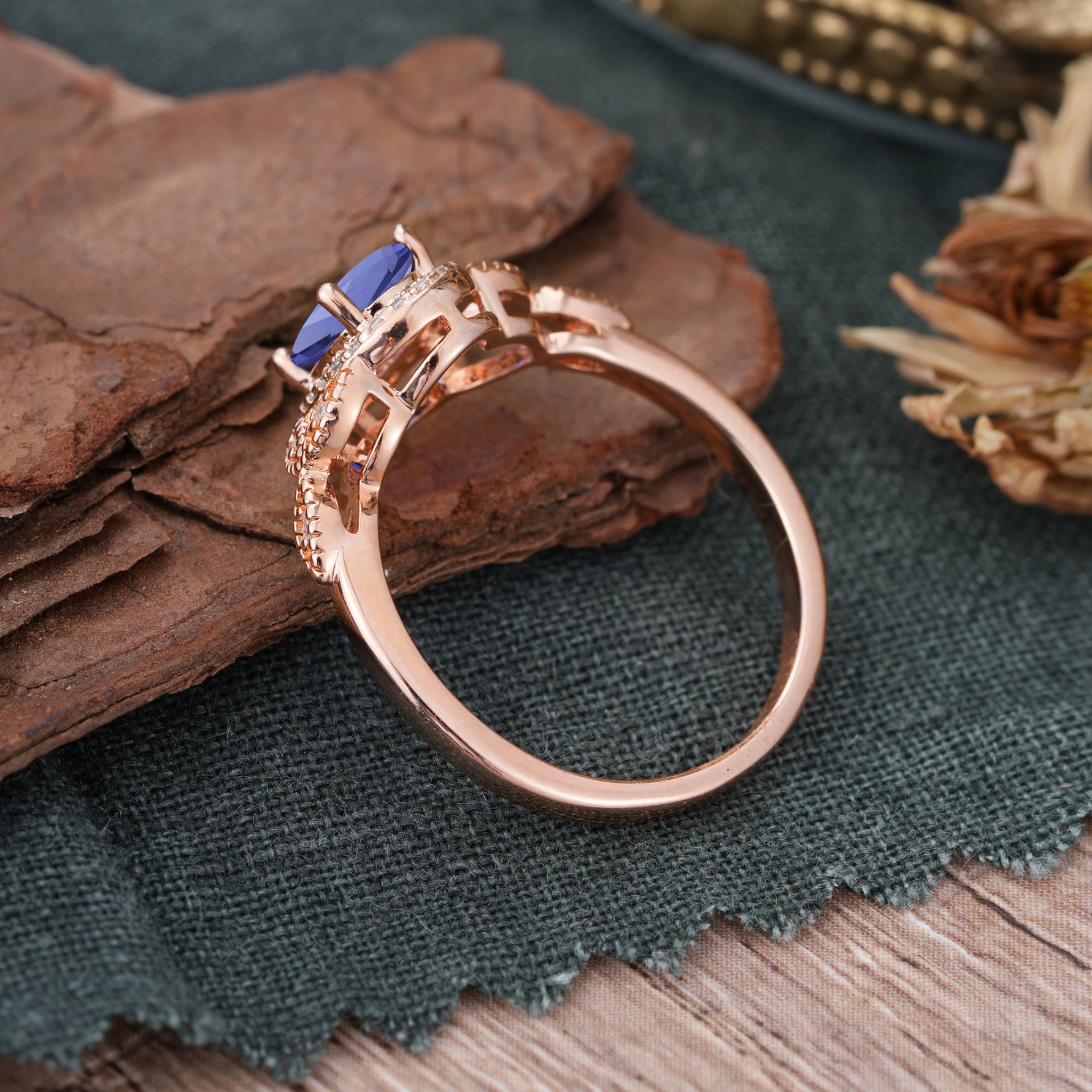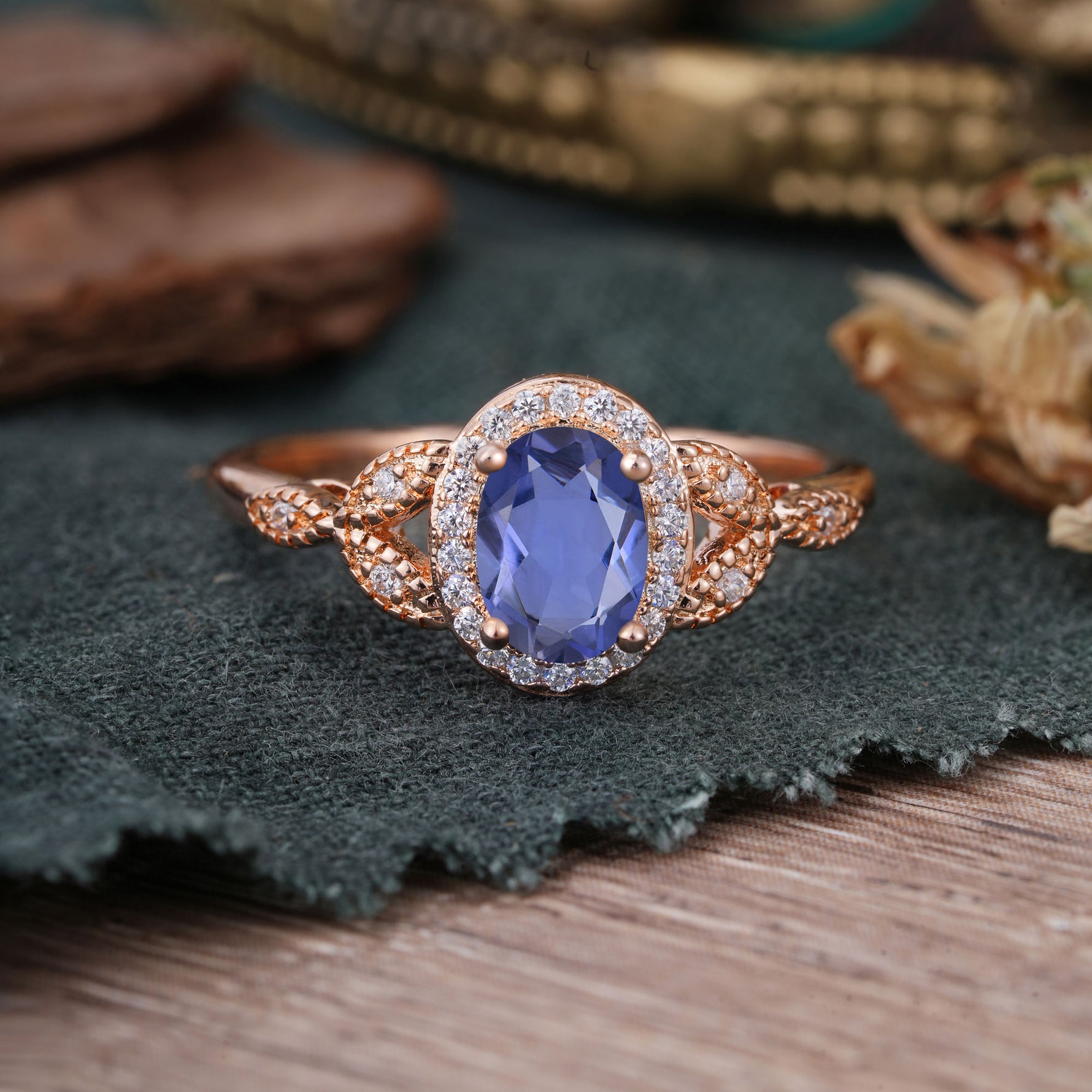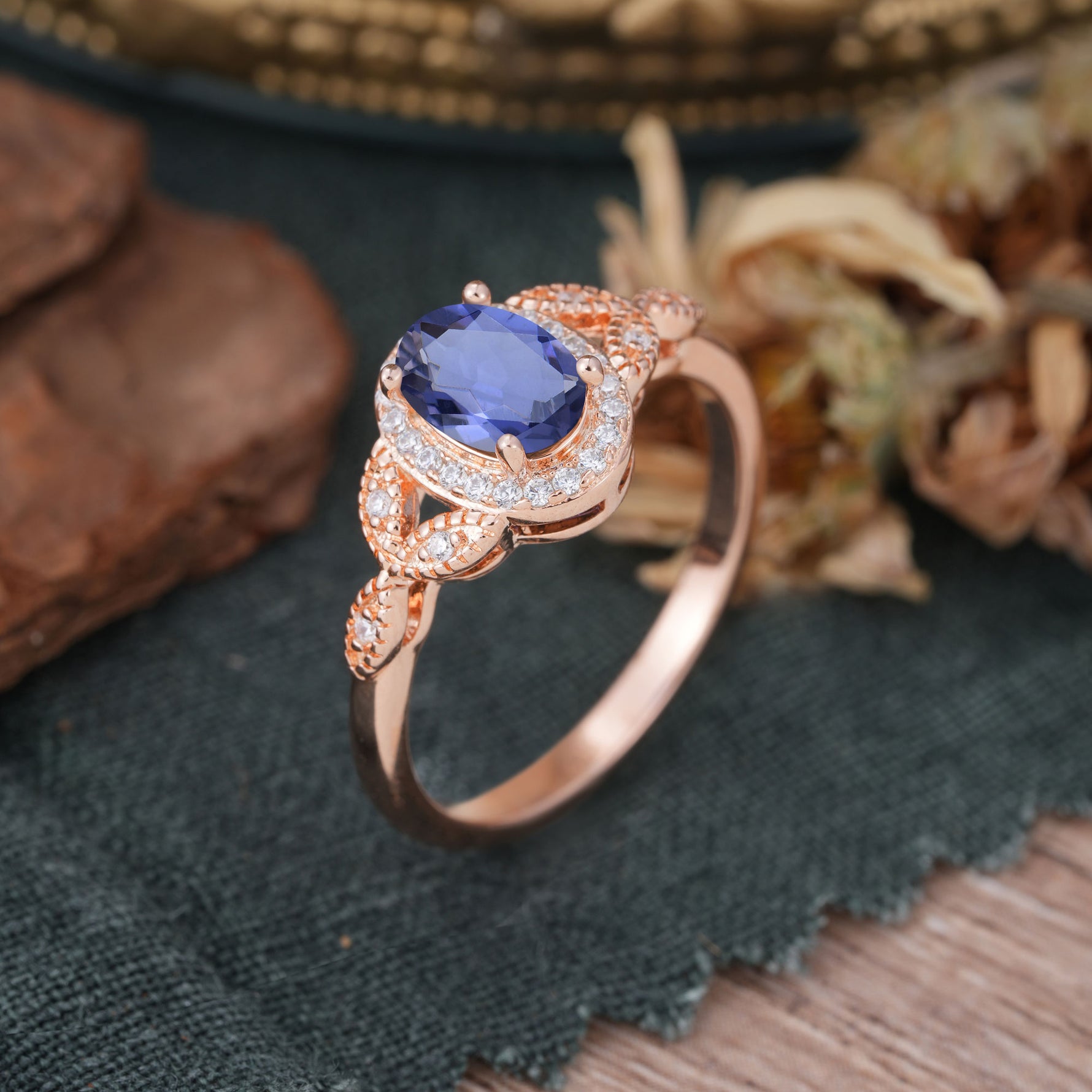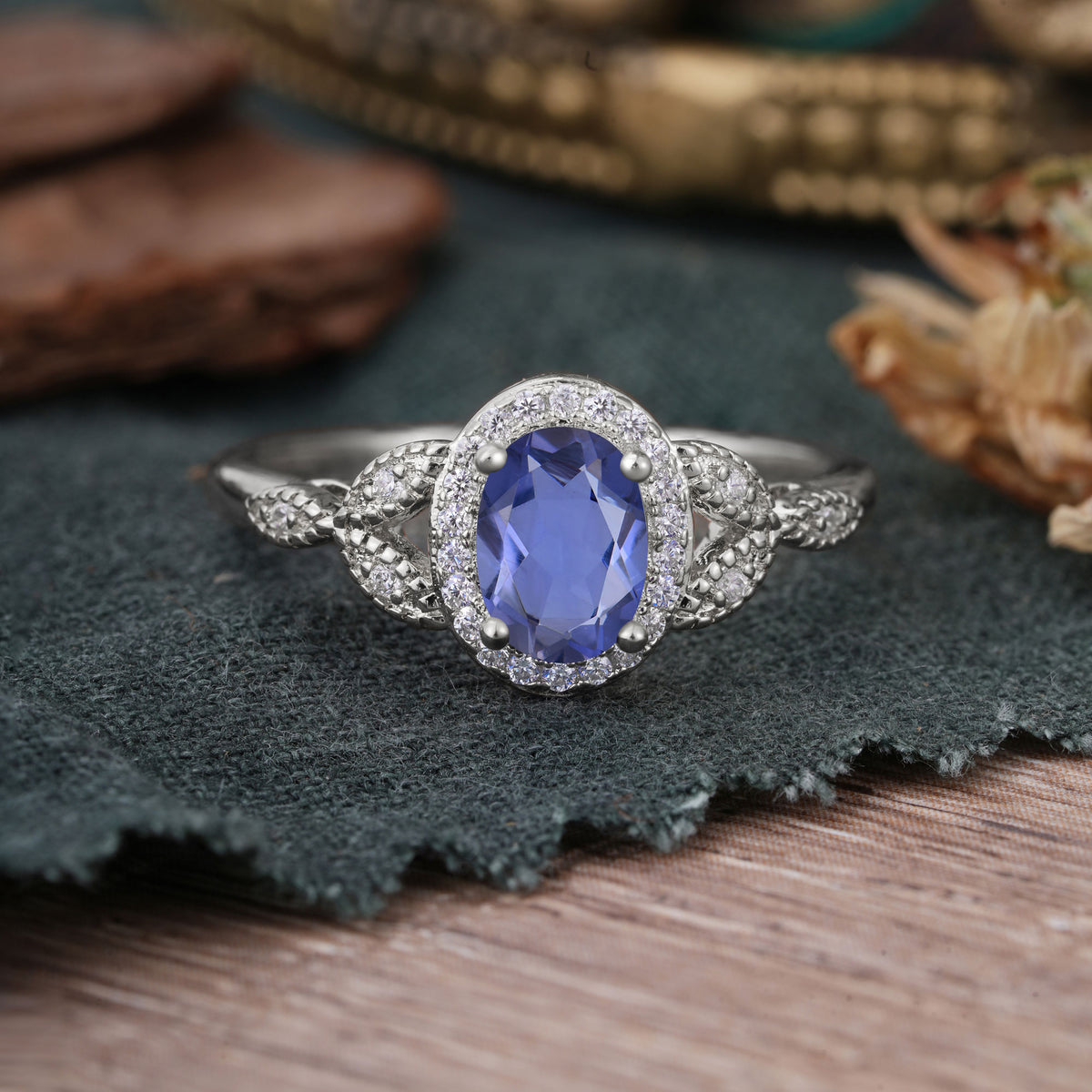 1 Carat Oval Cut Tanzanite Halo Ring Anniversary Bead Edge Unique Leaf Ring
