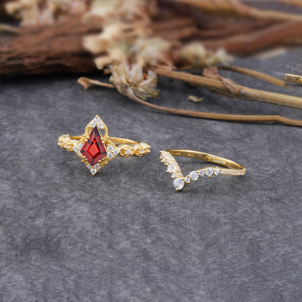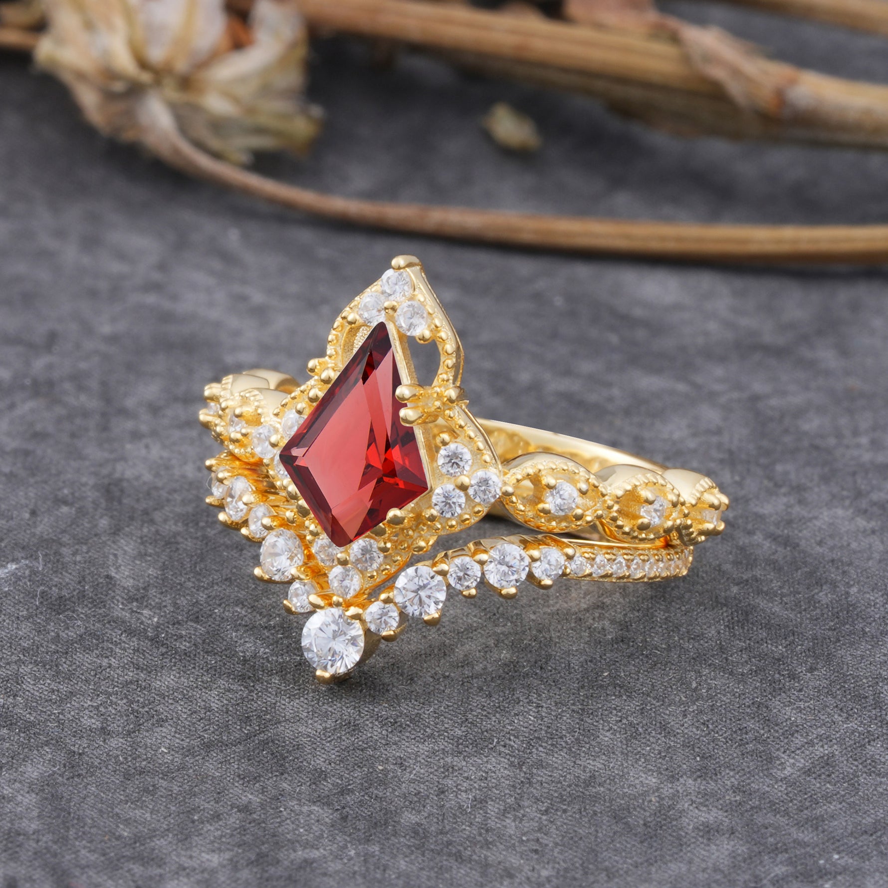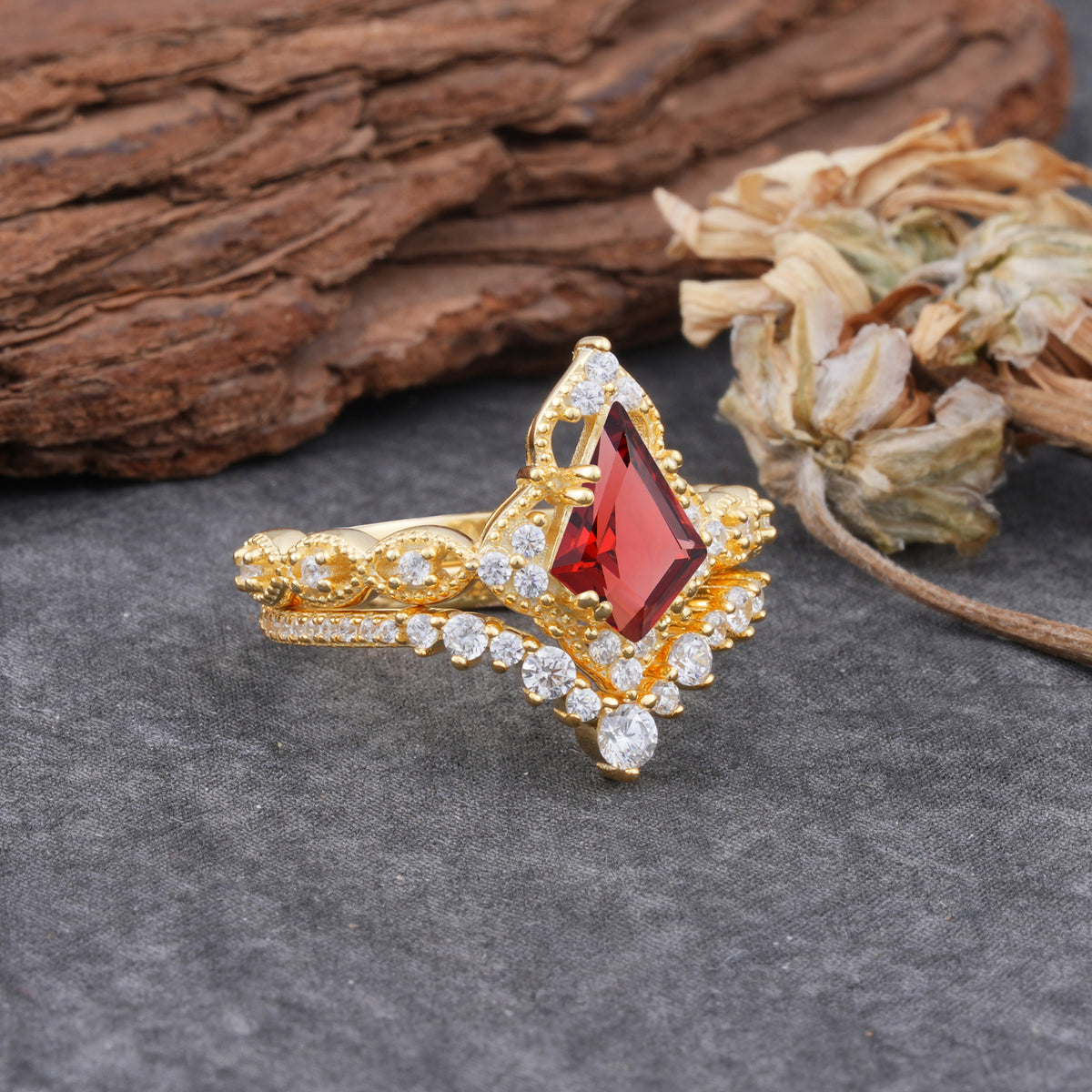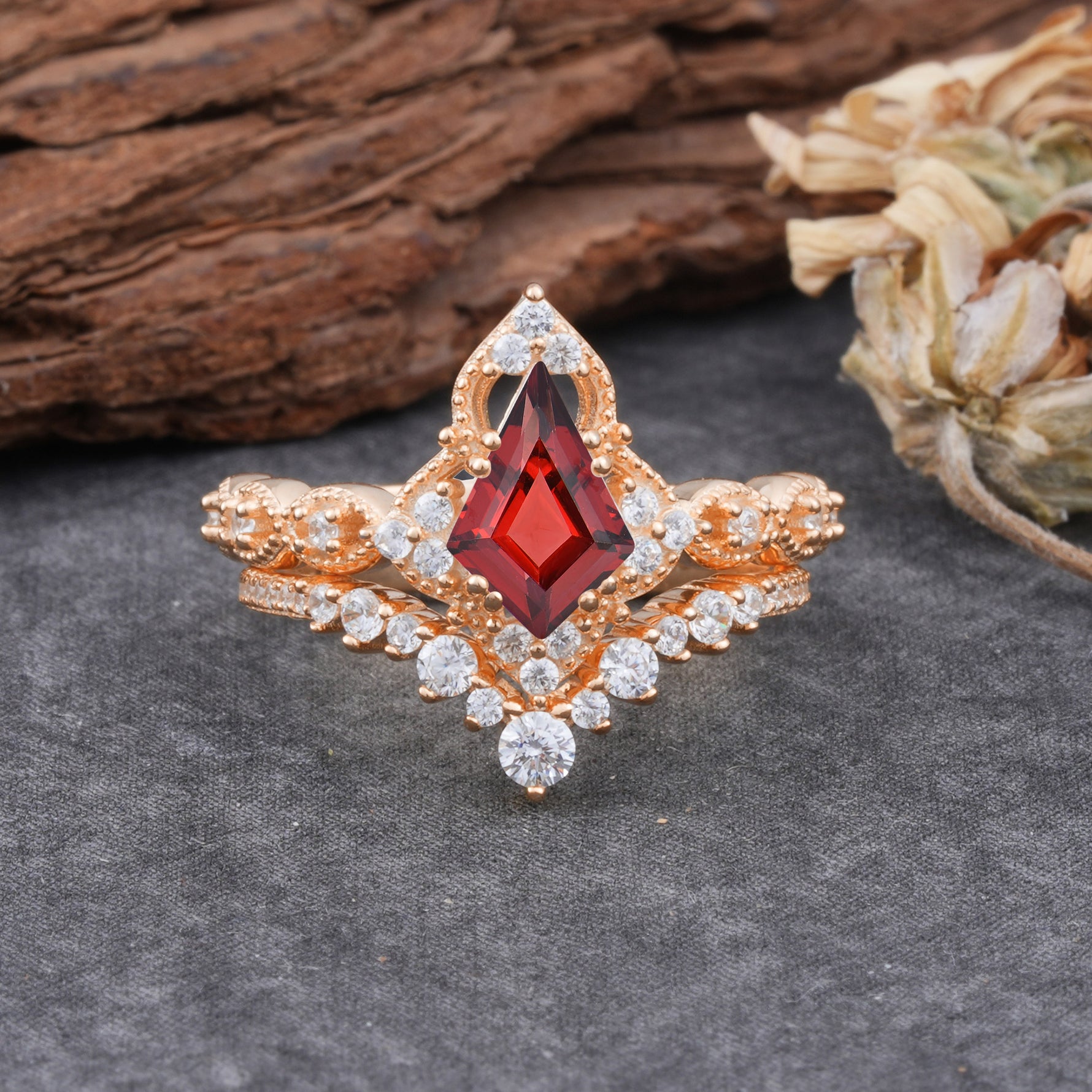 Unique Cut Kite Cut Natural Garnet Cluster Engagement Ring Set