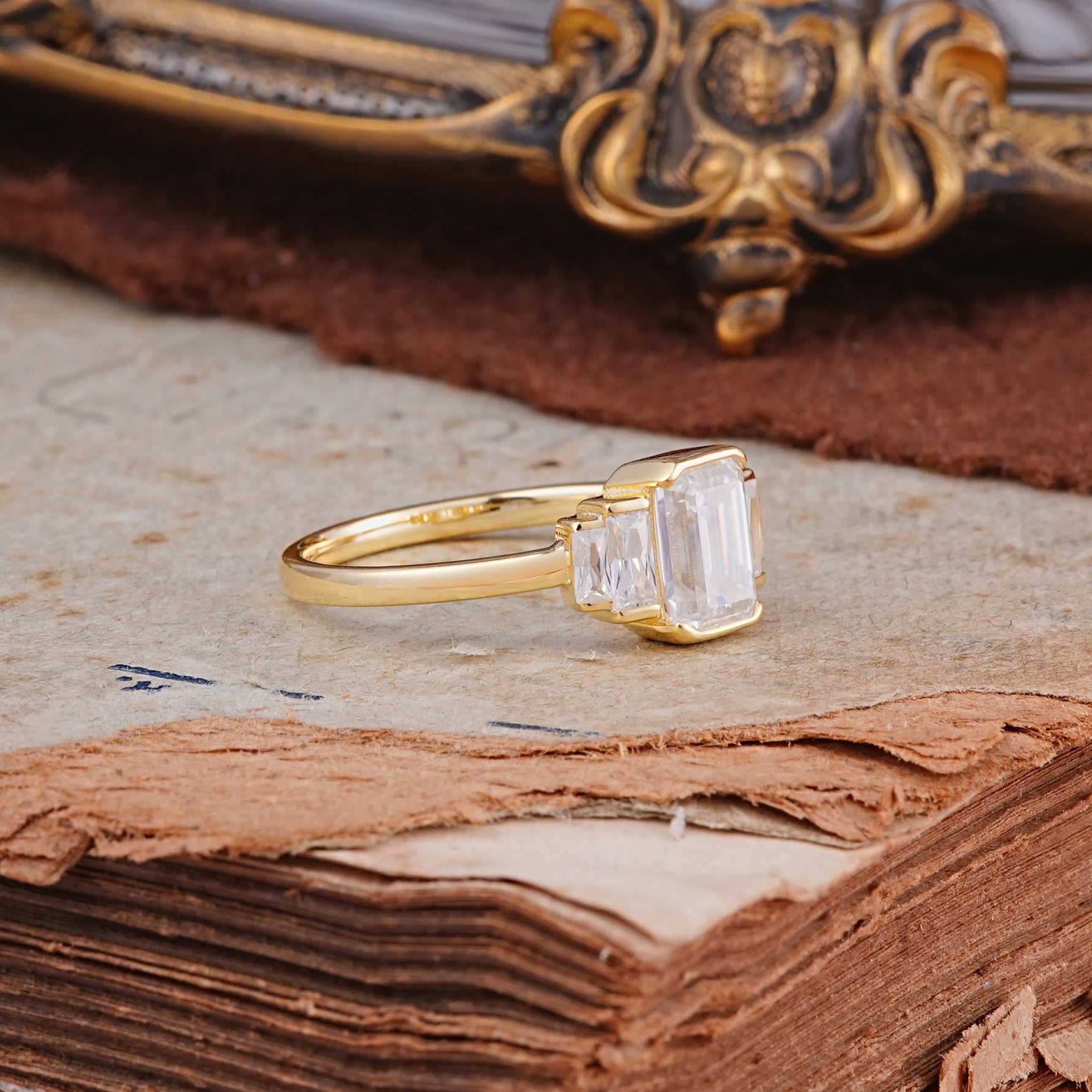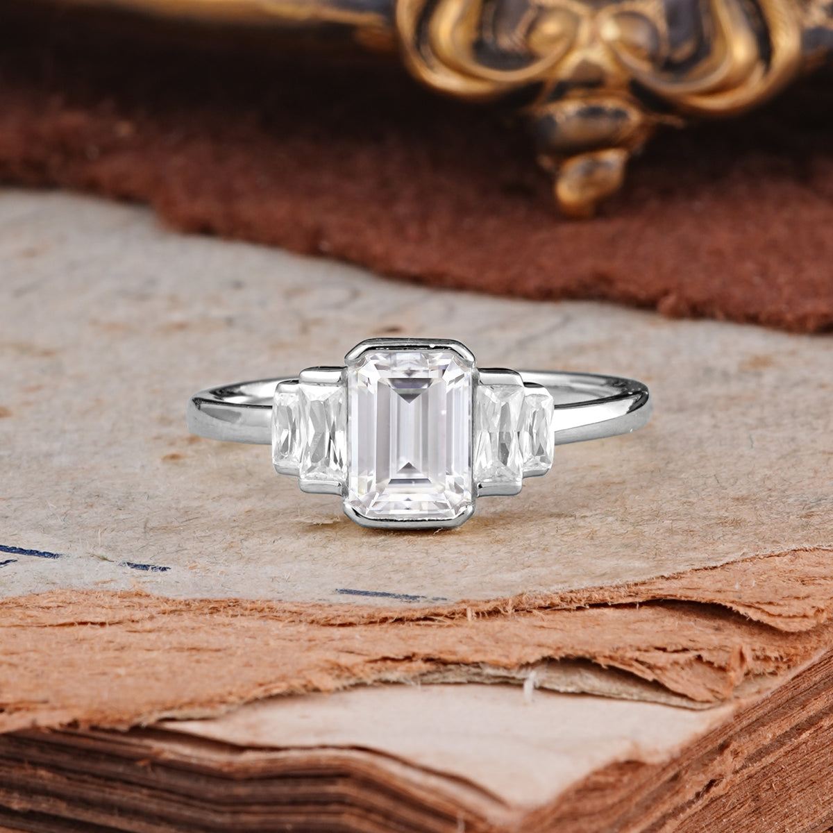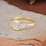 Emerald Cut Baguette Side Stones Moissanite Engagement Ring
