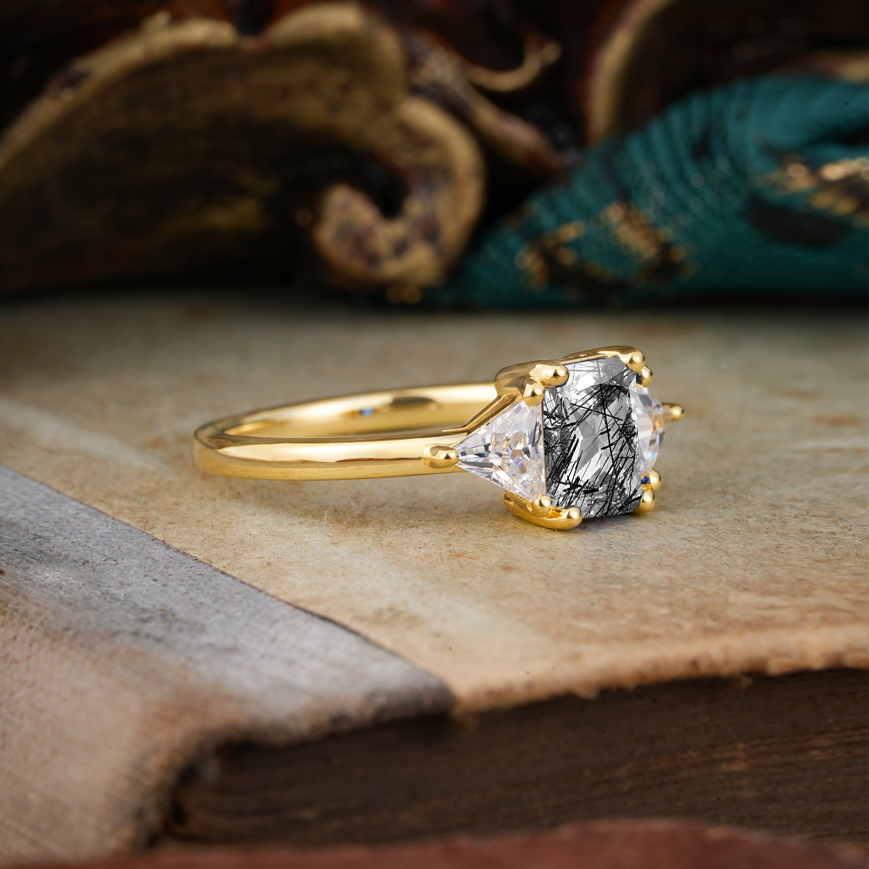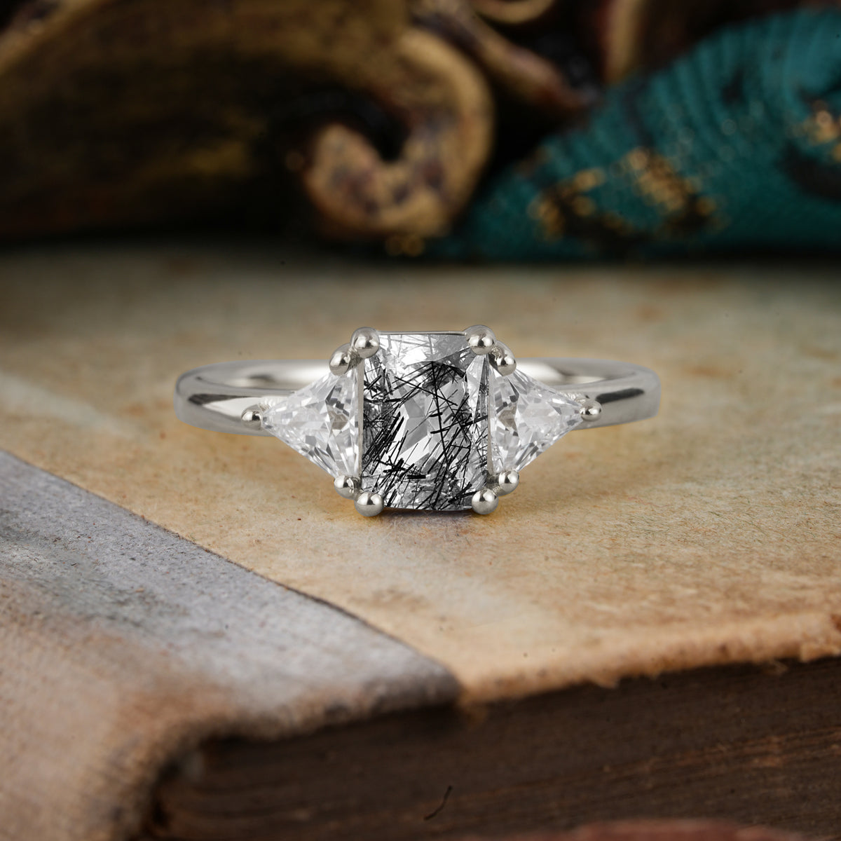 1CT Emerald Cut 4 Prong Black Rutilated Quartz Three Stone Engagement Ring