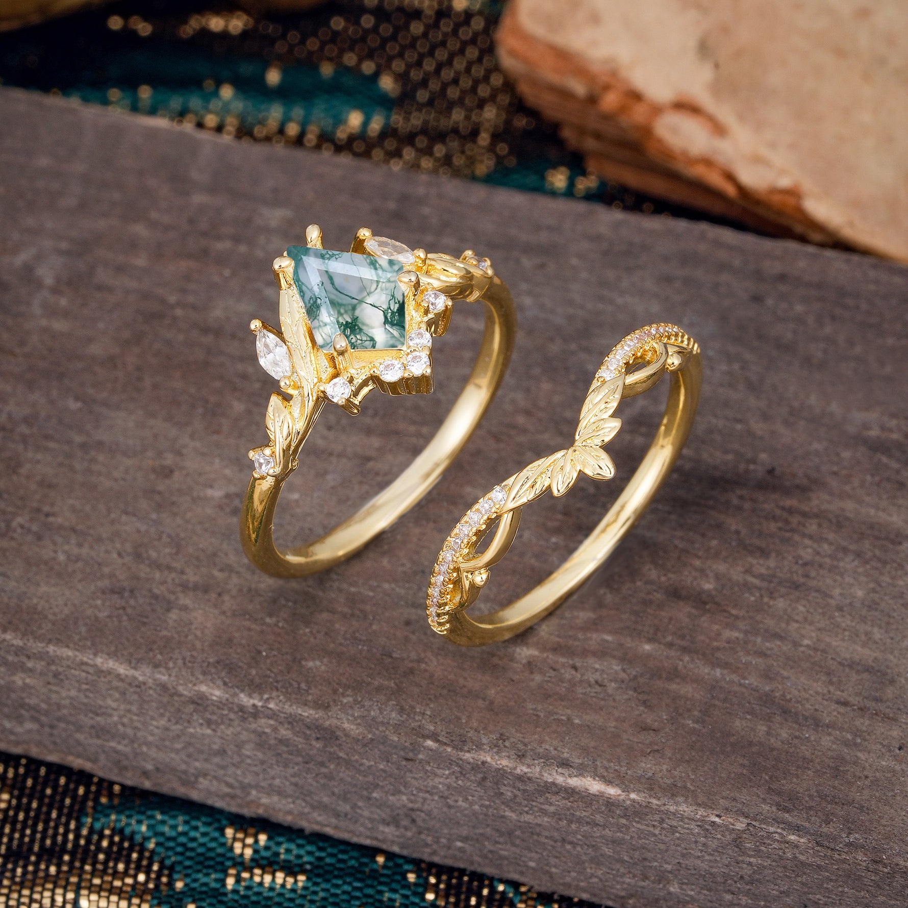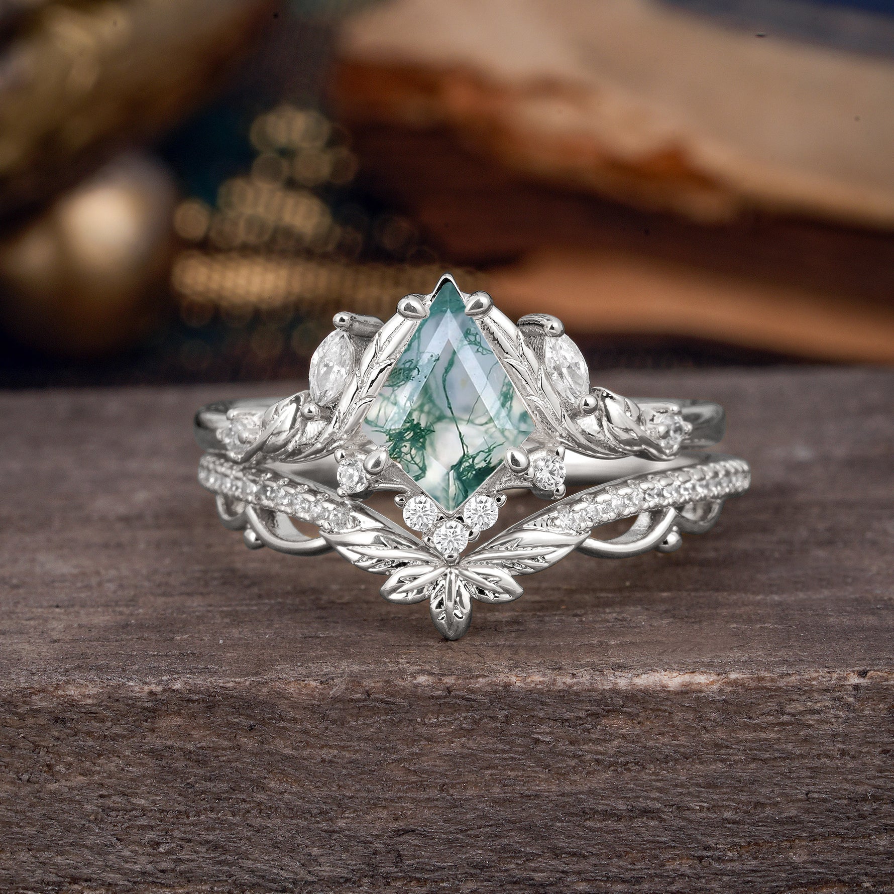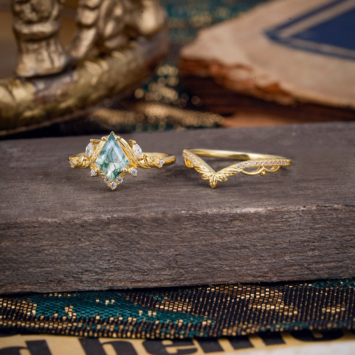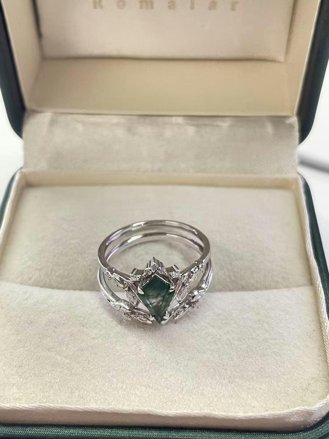 Kite Cut Natural Moss Agate Engagement Ring Set-2pc
