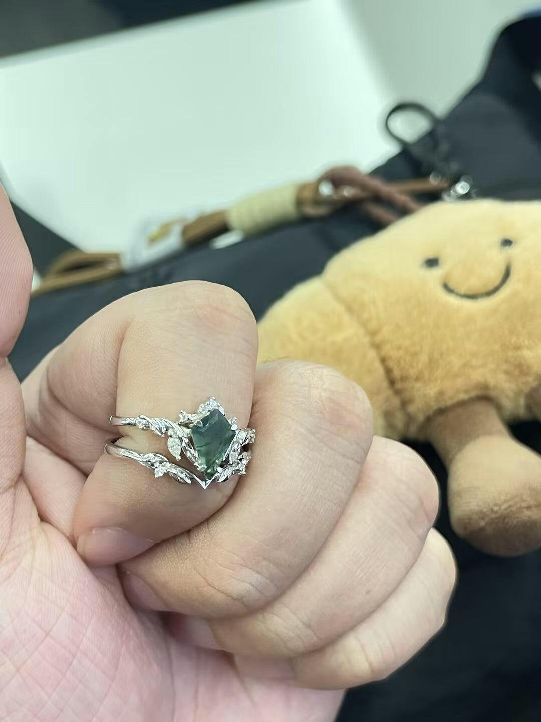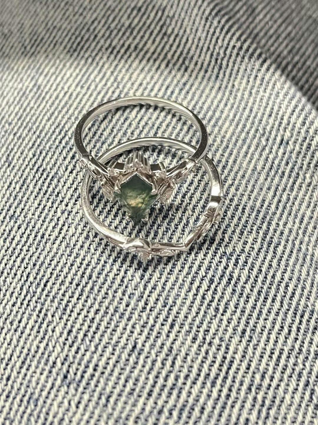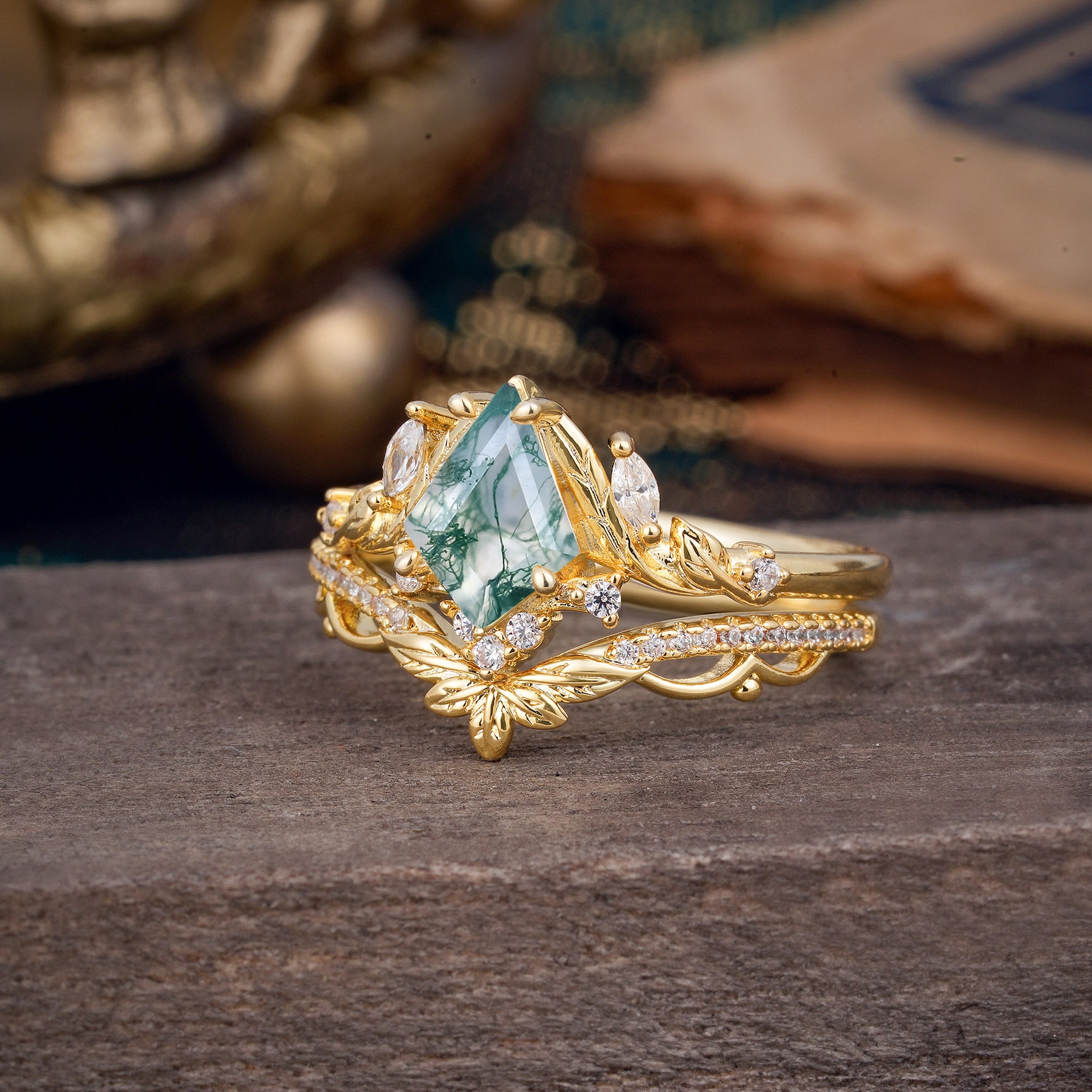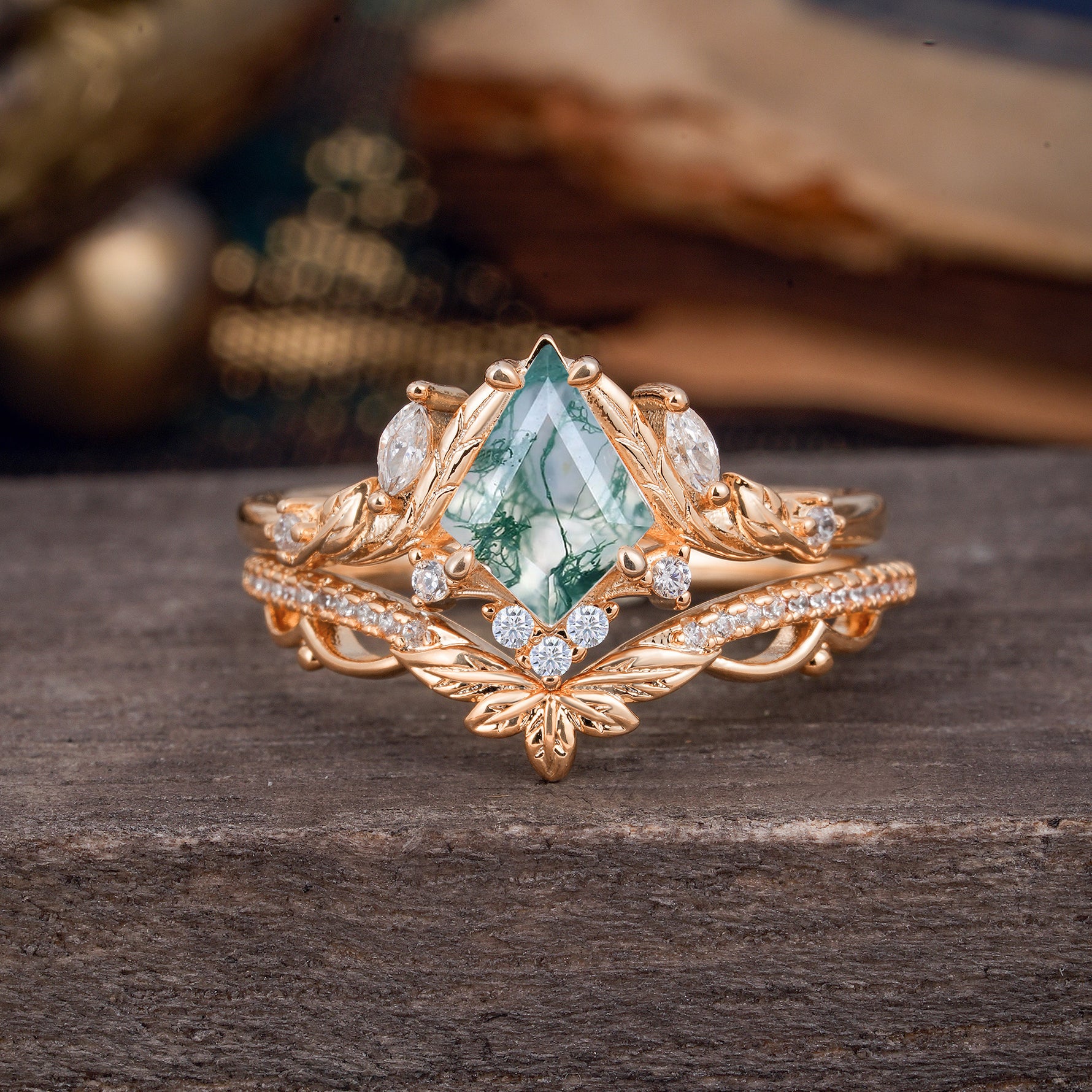 Kite Cut Natural Moss Agate Engagement Ring Set-2pc
