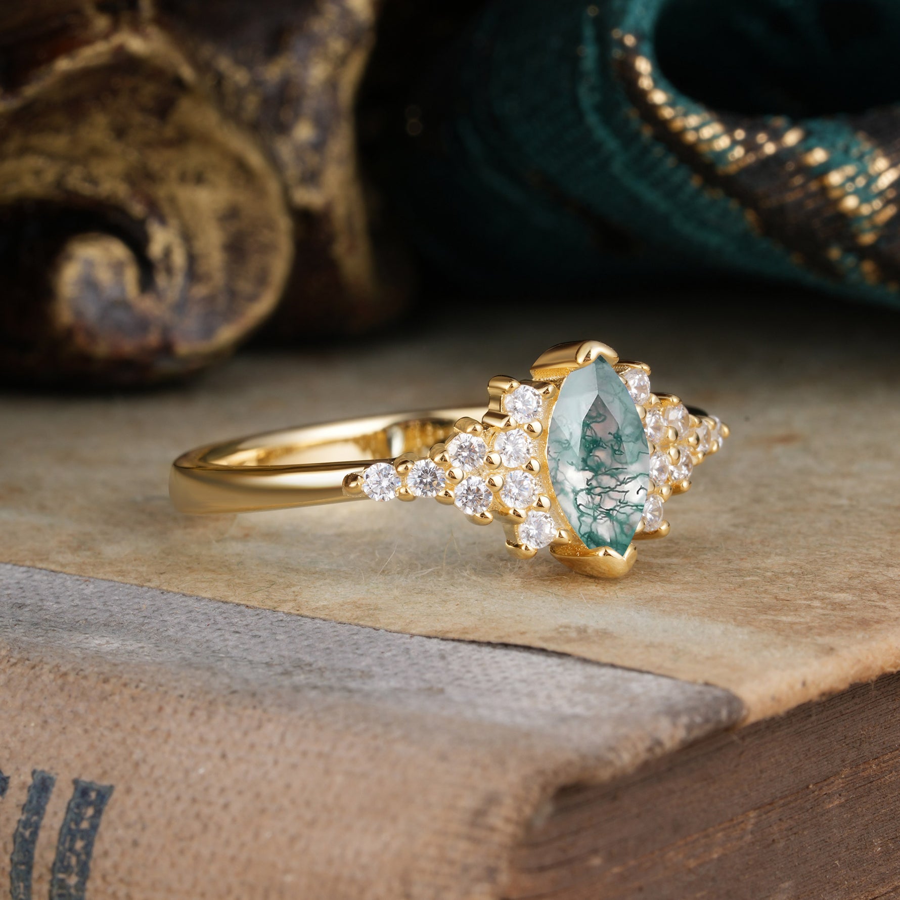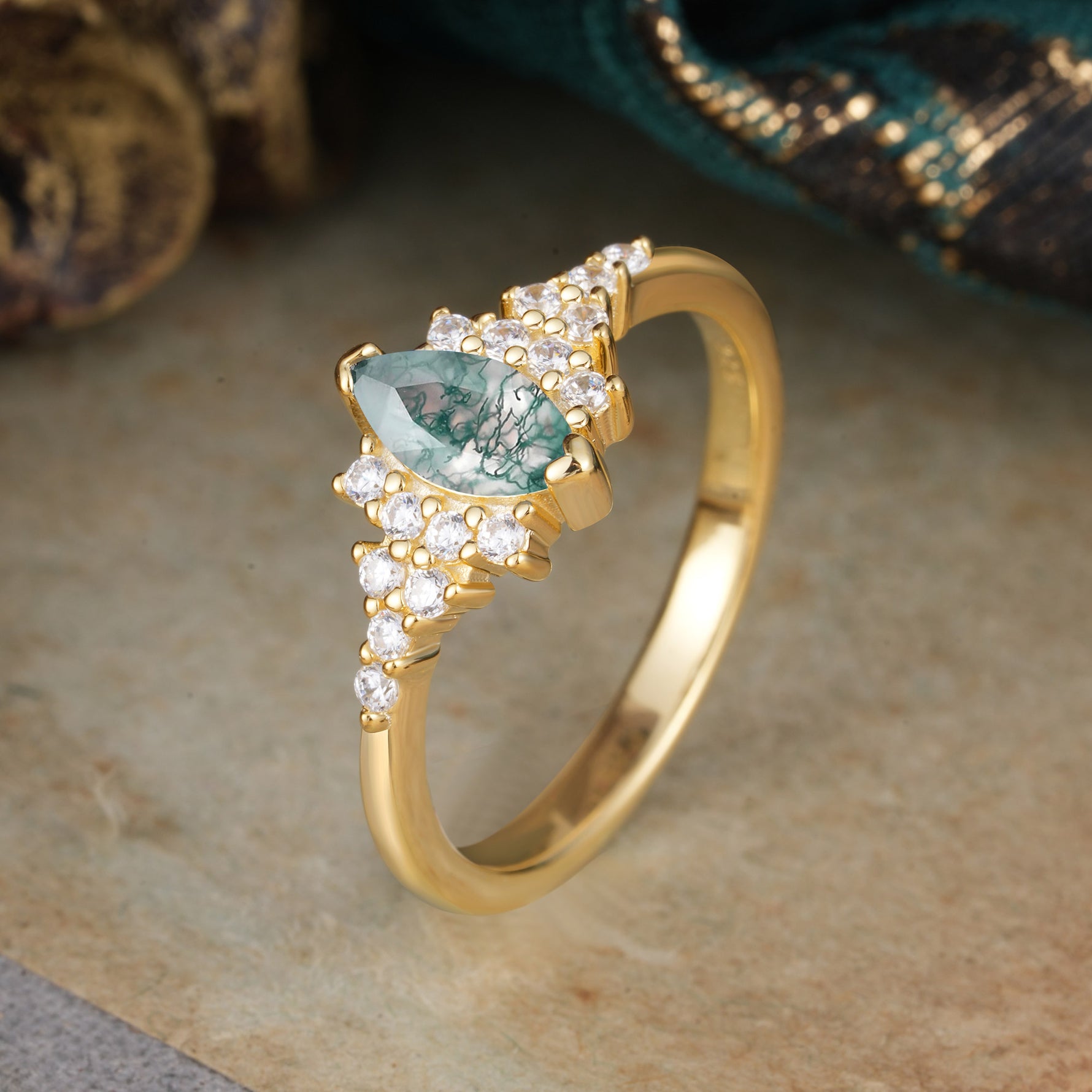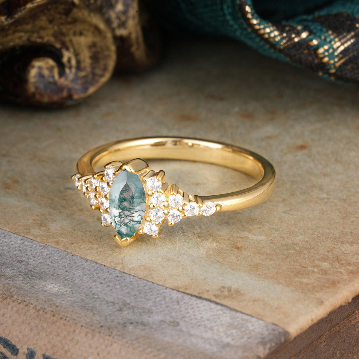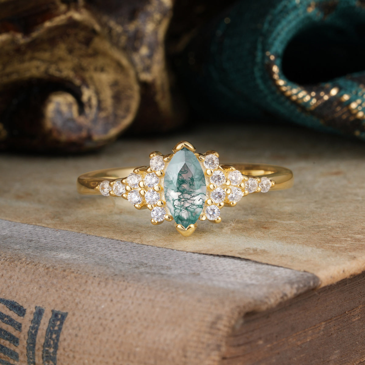 Marquise Cut Vintage Moss Agate Engagement Ring Wedding Ring