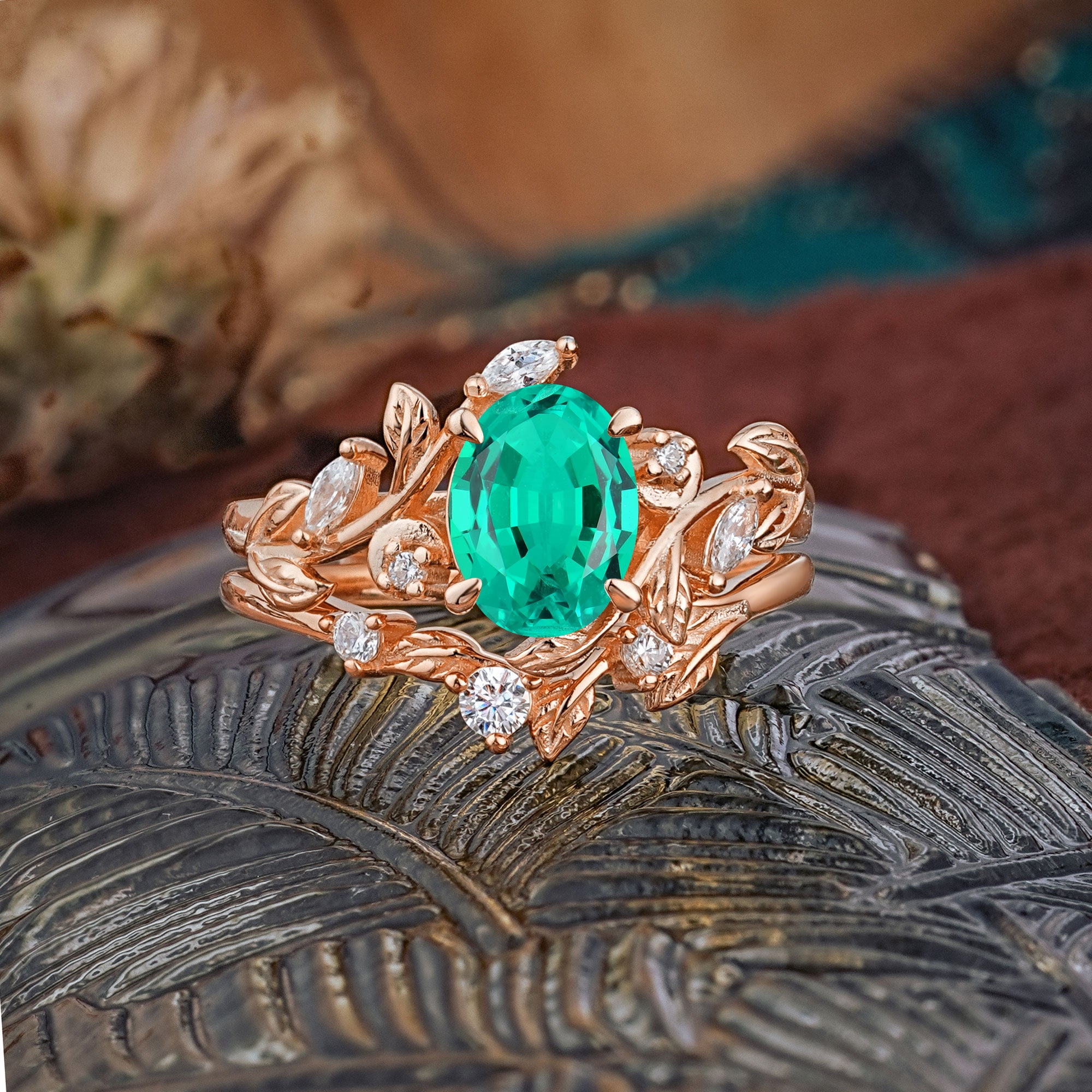 1.15 CT Delicate Leaf Accented 4 Prong Oval Shaped Emerald Ring Sets