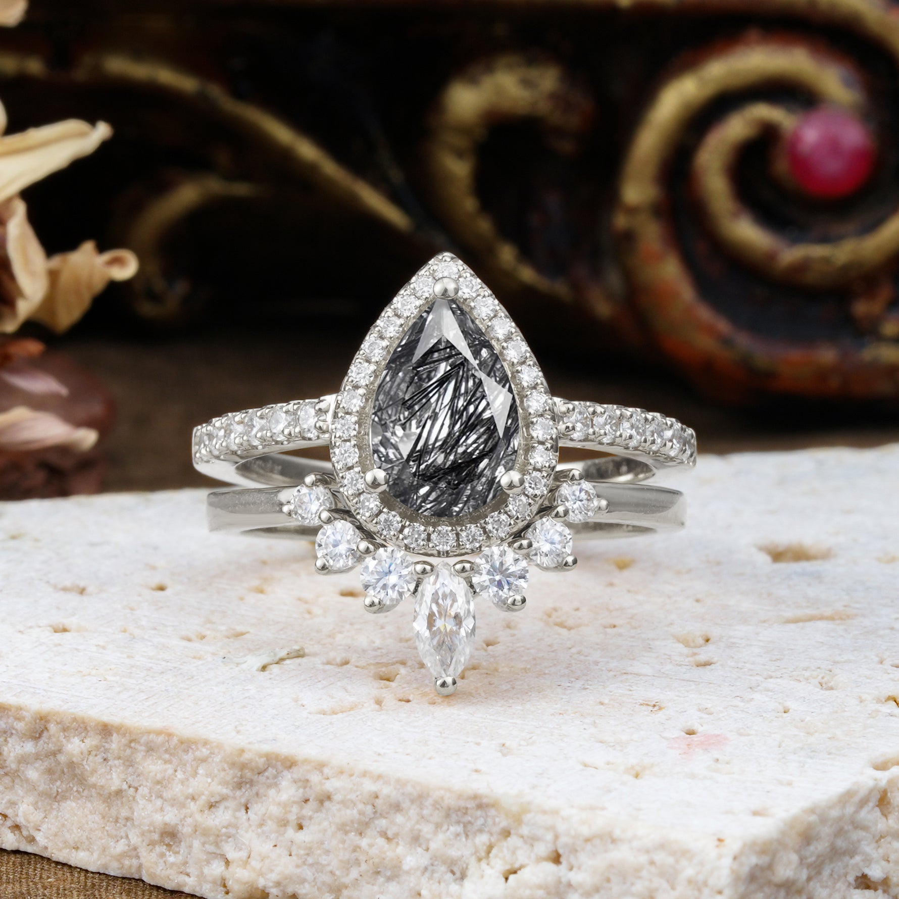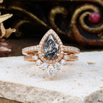 1.5 Carat Pear Shaped Black Rutilated Quartz Engagement Ring Bridal Set