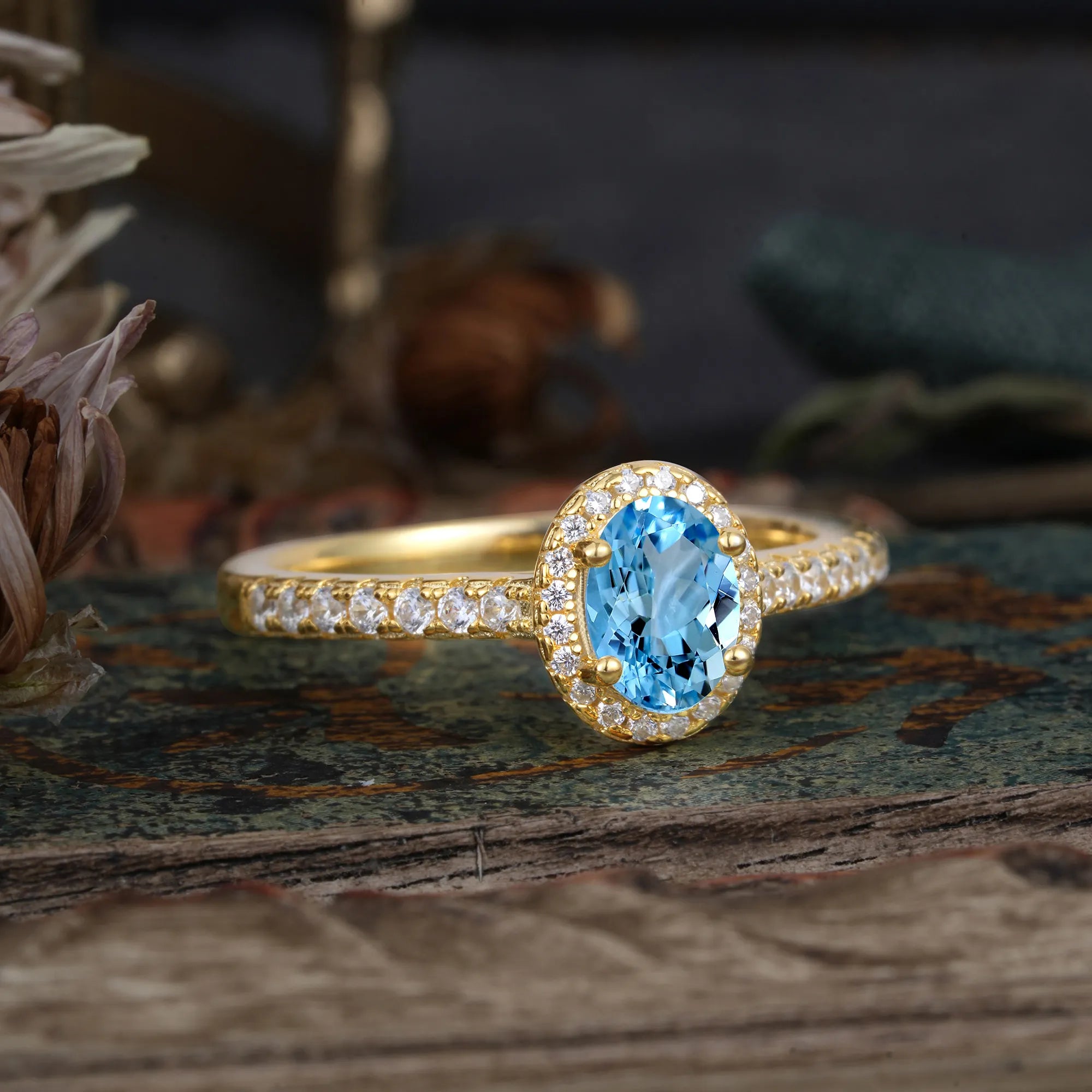 1 Carat Oval Cut Aquamarine Halo Ring with Pave Band
