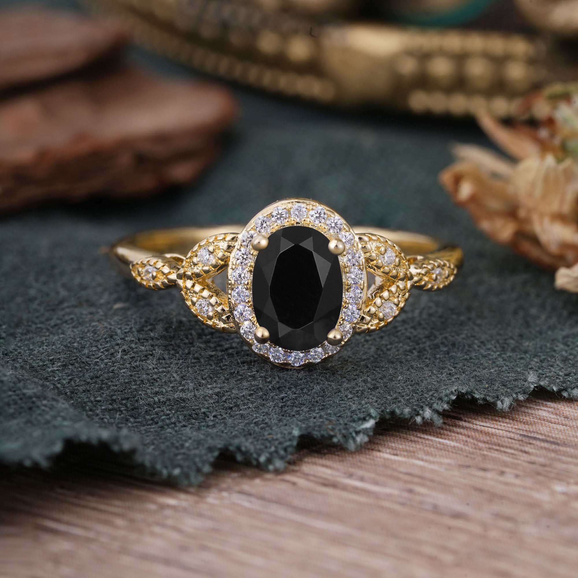 1 Carat Oval Cut Black Onyx Halo Ring Anniversary Bead Edge Unique Leaf Ring
