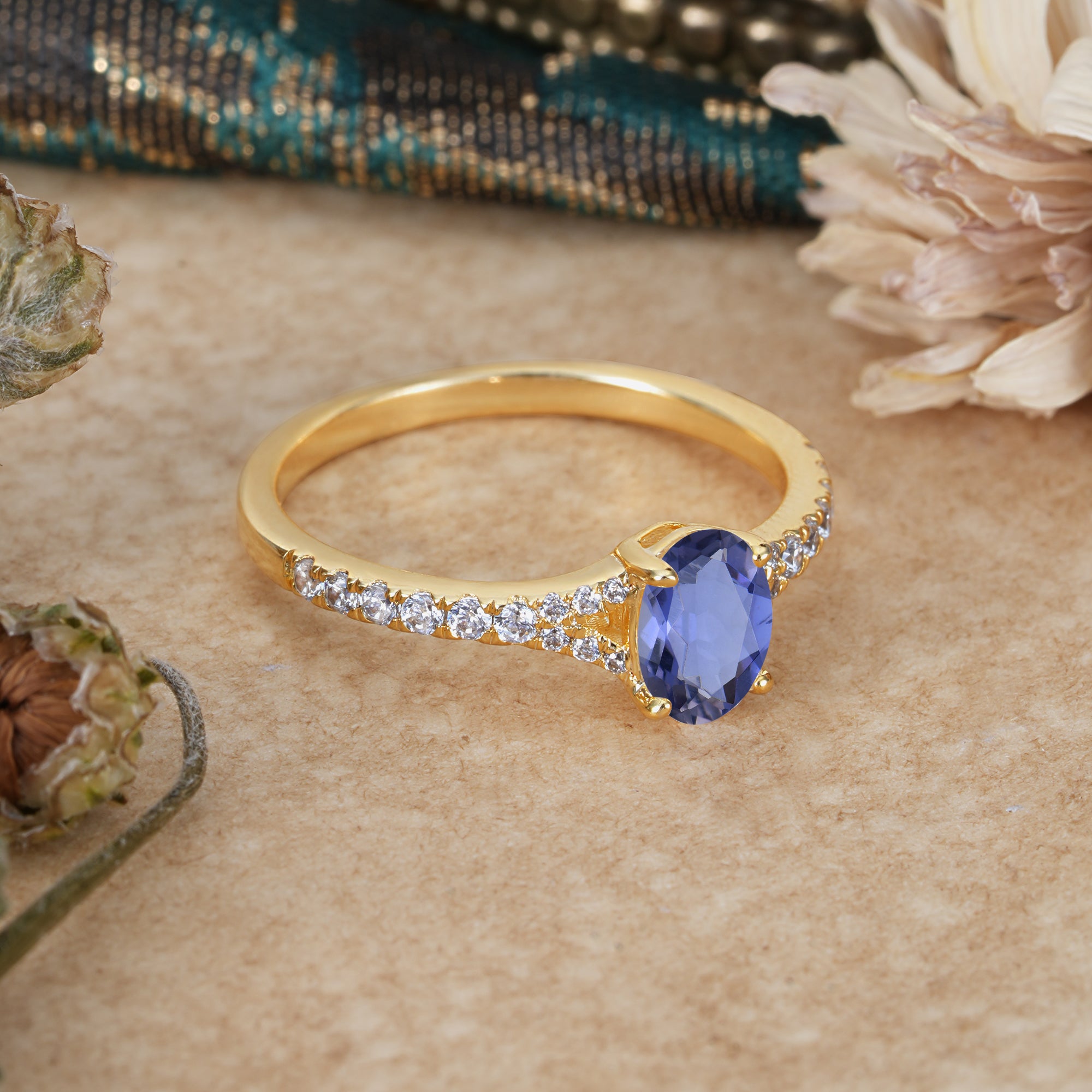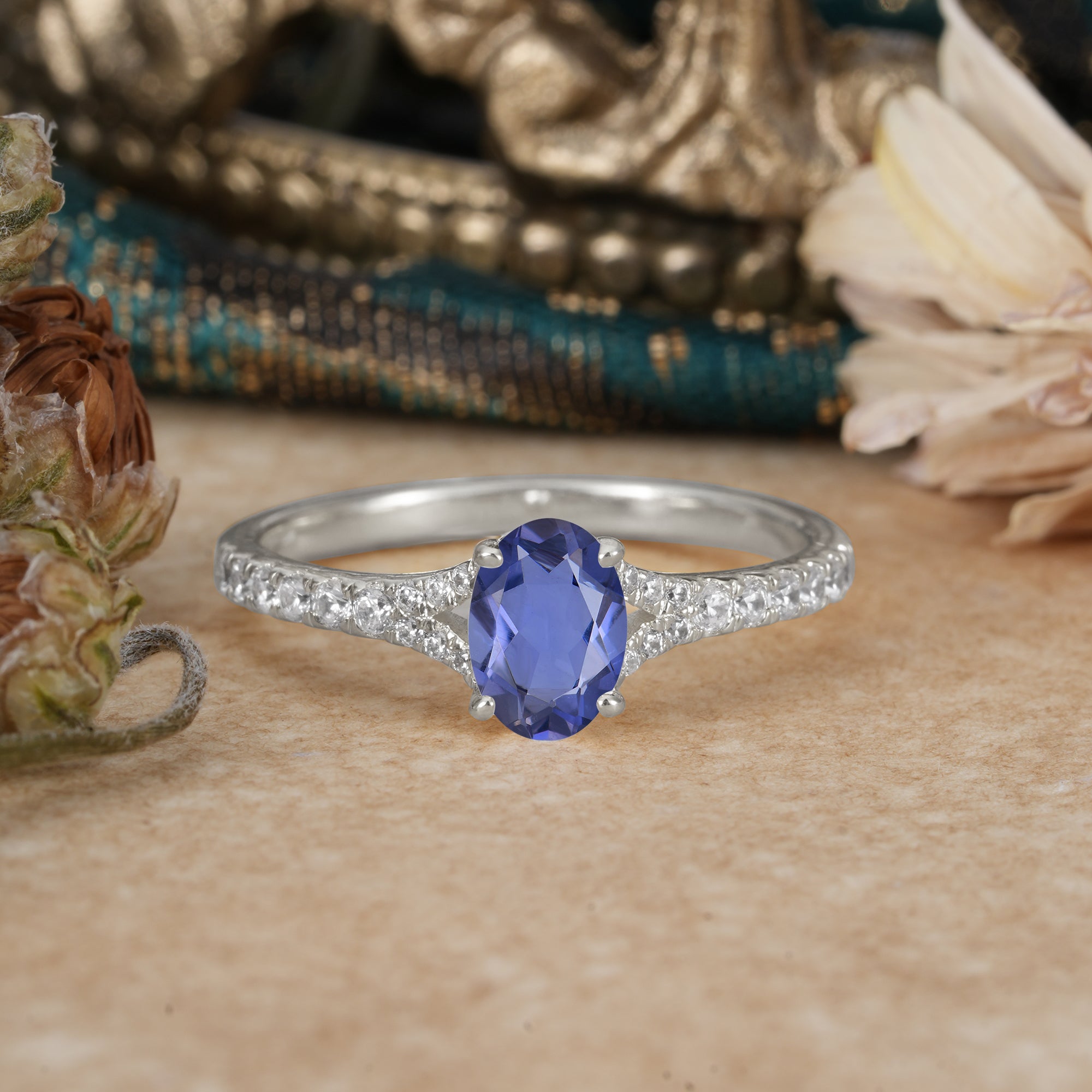 1 Carat Oval Cut Classic Tanzanite Promise Ring Pave Setting