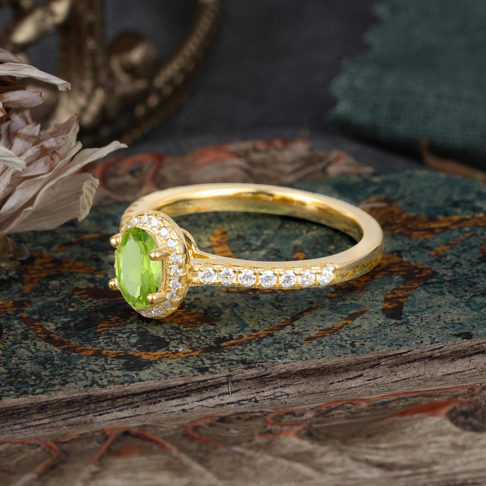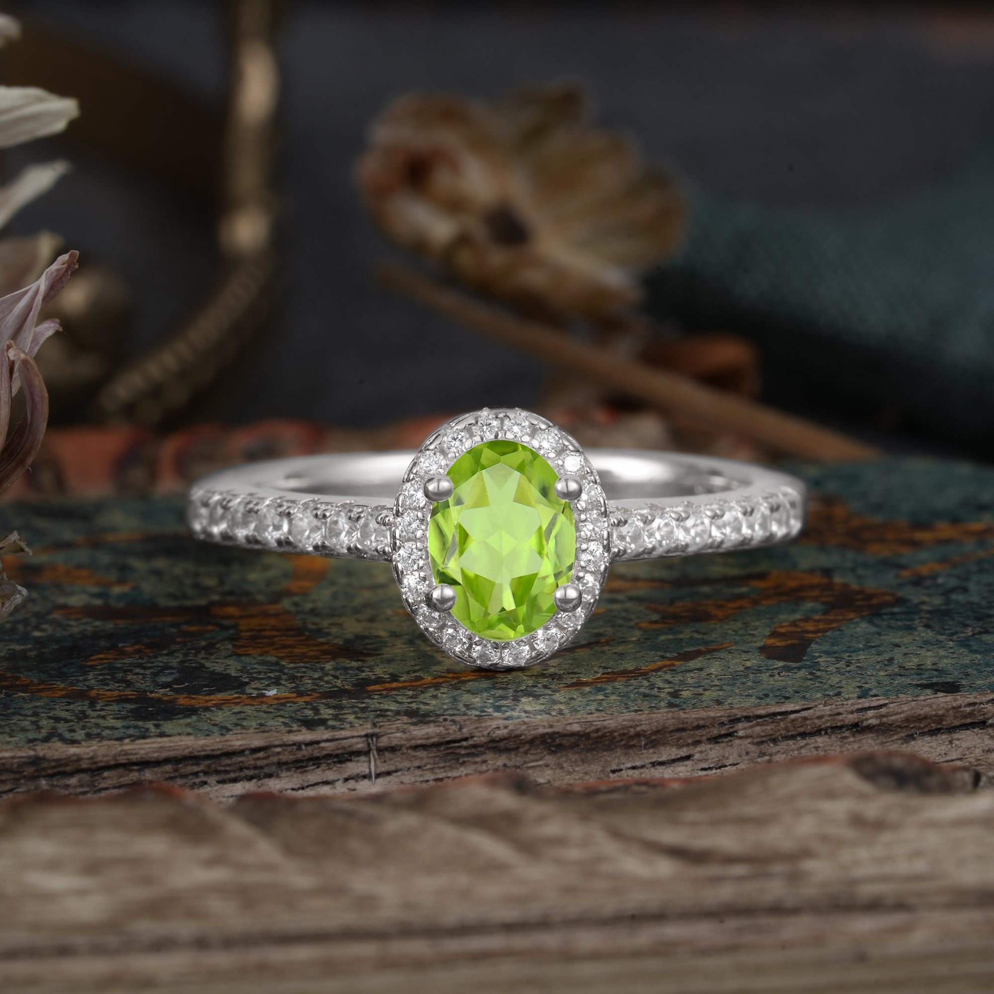 1 Carat Oval Cut Peridot Halo Ring with Pave Band