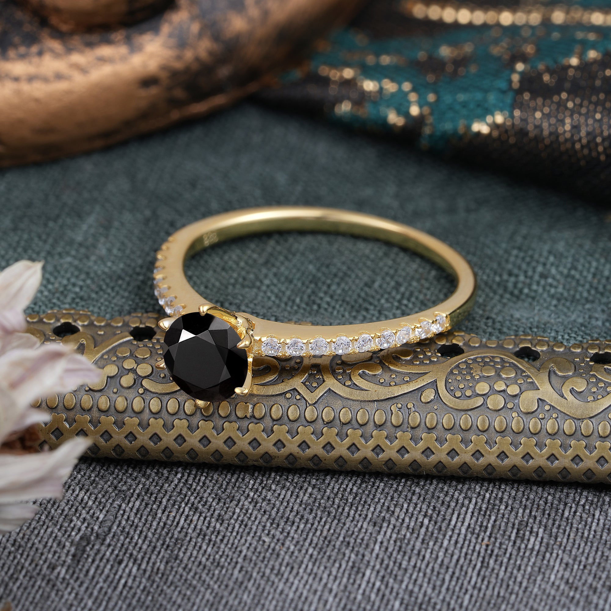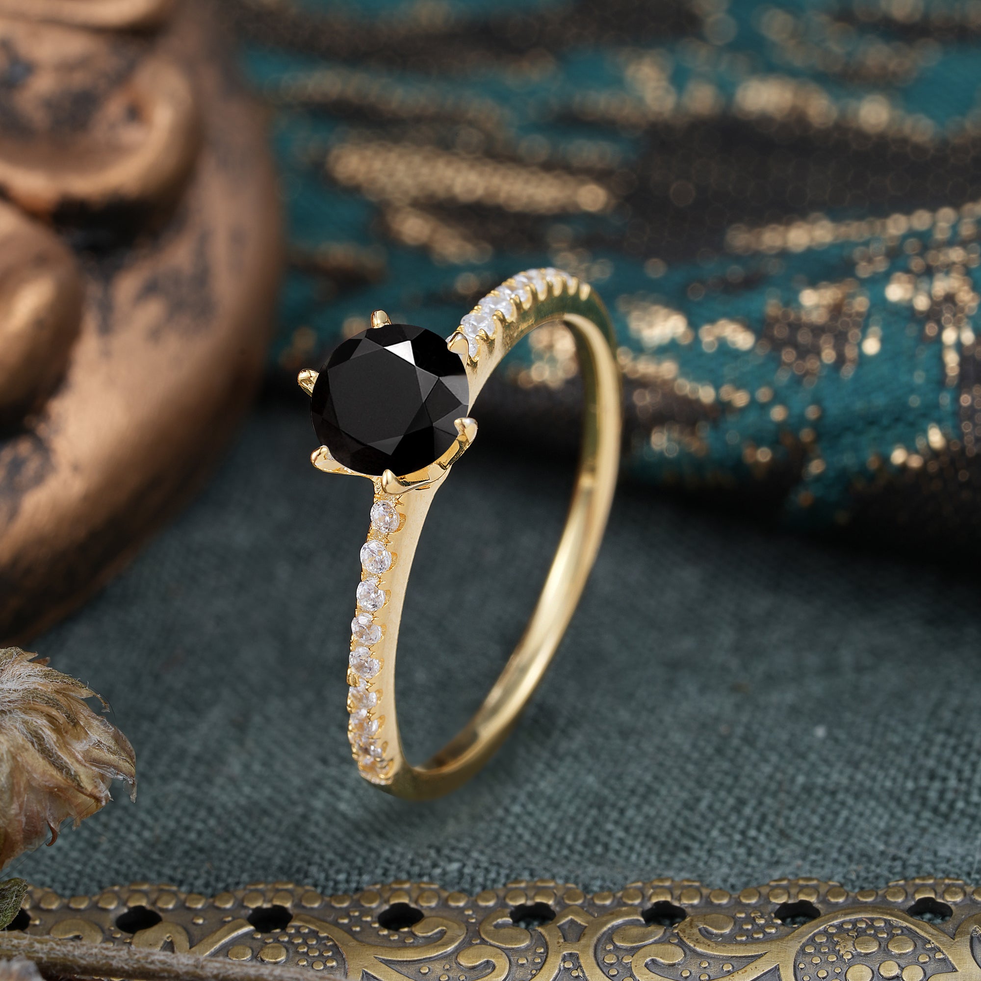 1 Carat Round Cut 6-Prong Black Onyx Wedding Ring Pave Milgrain Engagement Ring