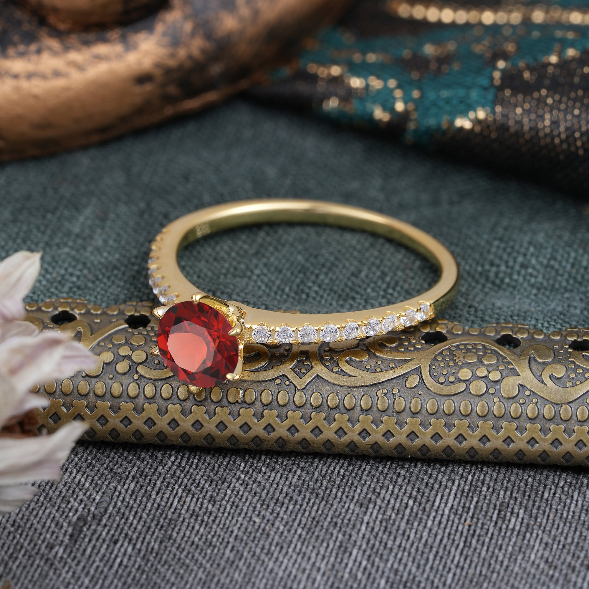 1 Carat Round Cut Garnet Wedding Ring Pave Milgrain Engagement Ring