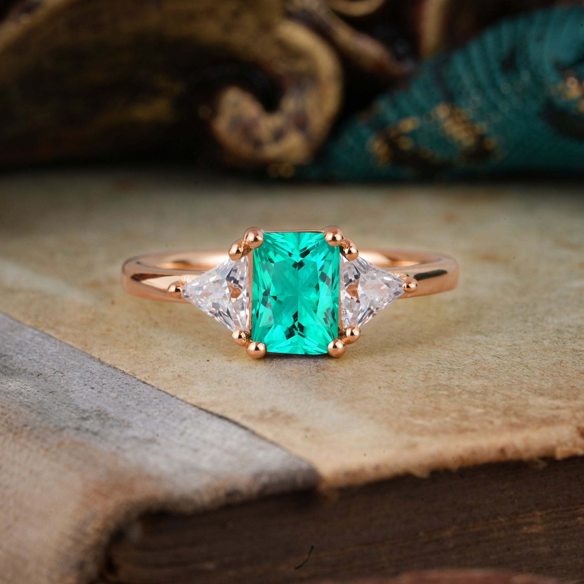1CT Emerald Cut 4 Prong Emerald Three Stone Engagement Ring