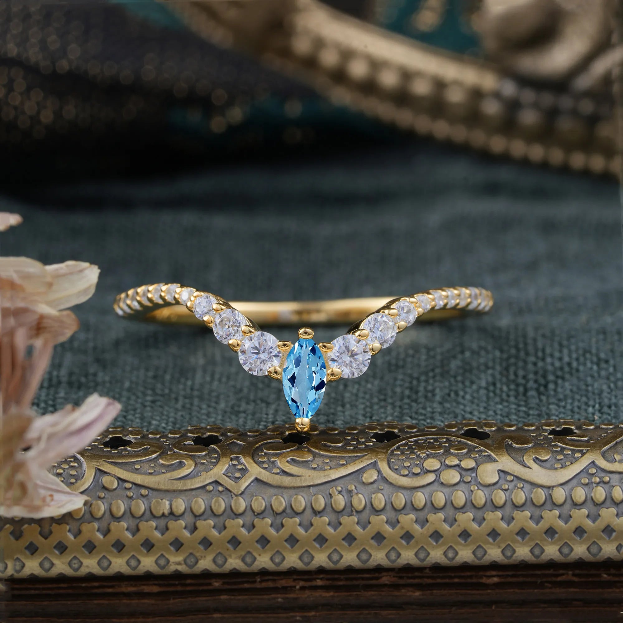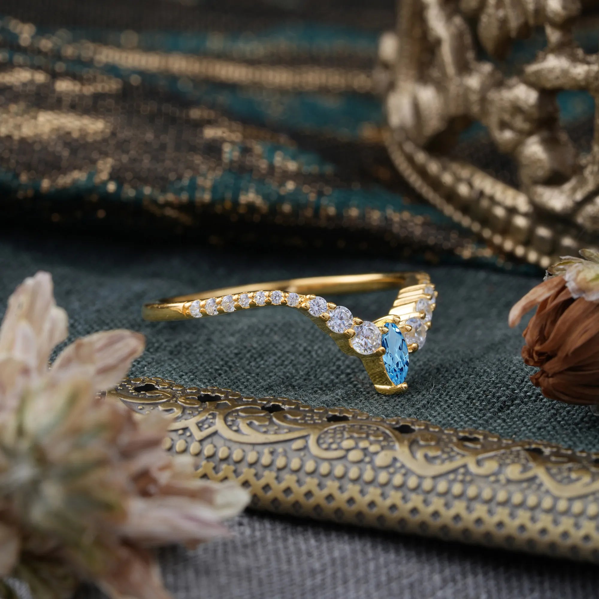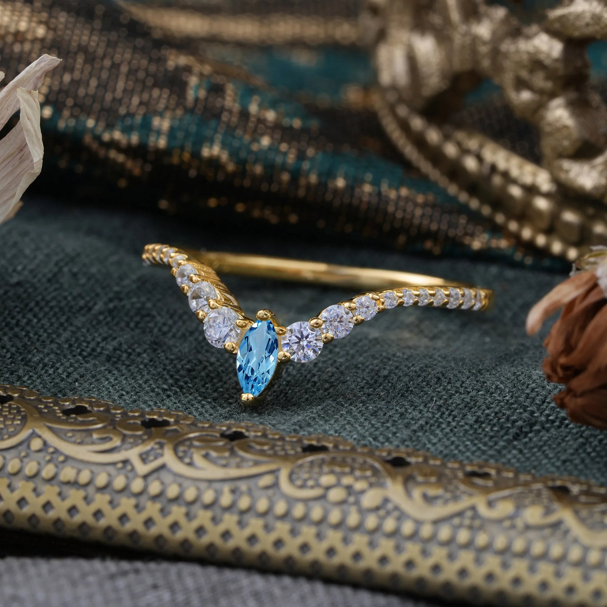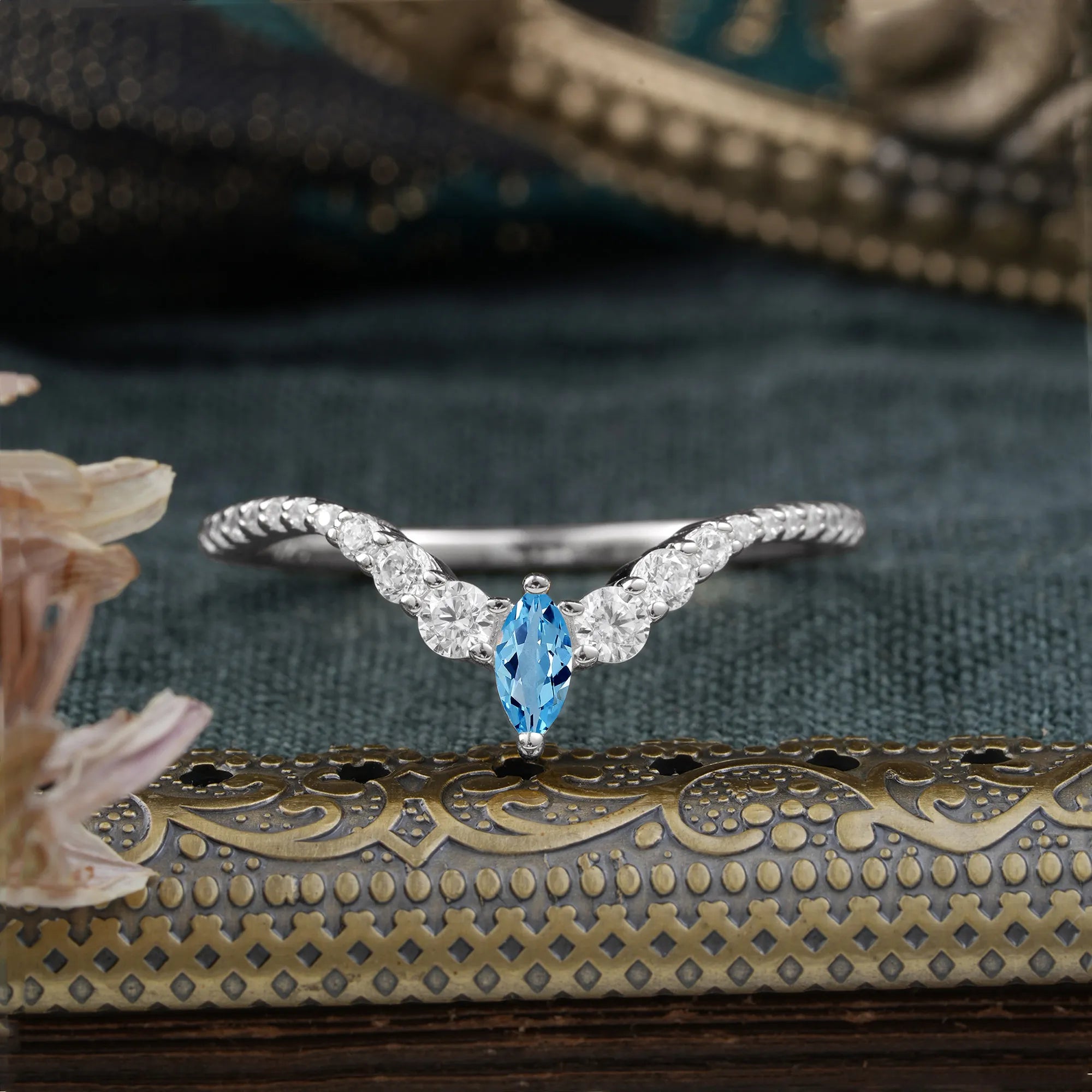 2 Prong Marquise & Round Cut Aquamarine Curved Wedding Band Stacking Ring