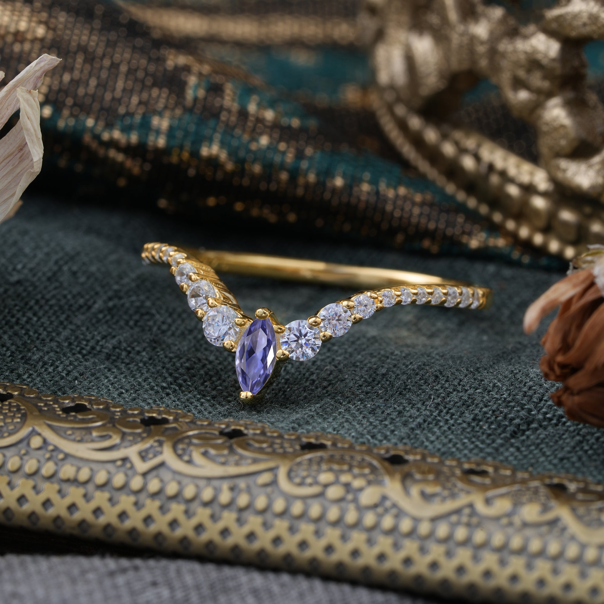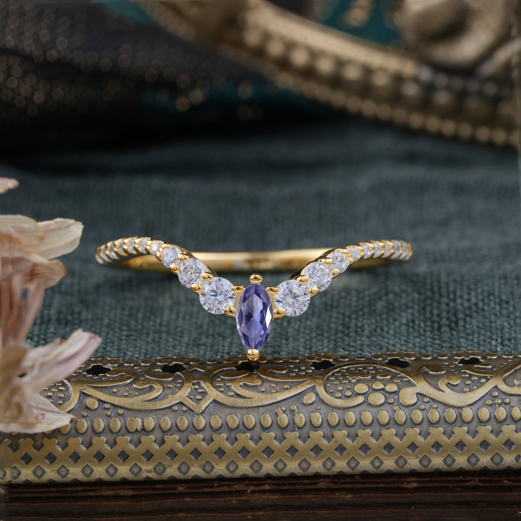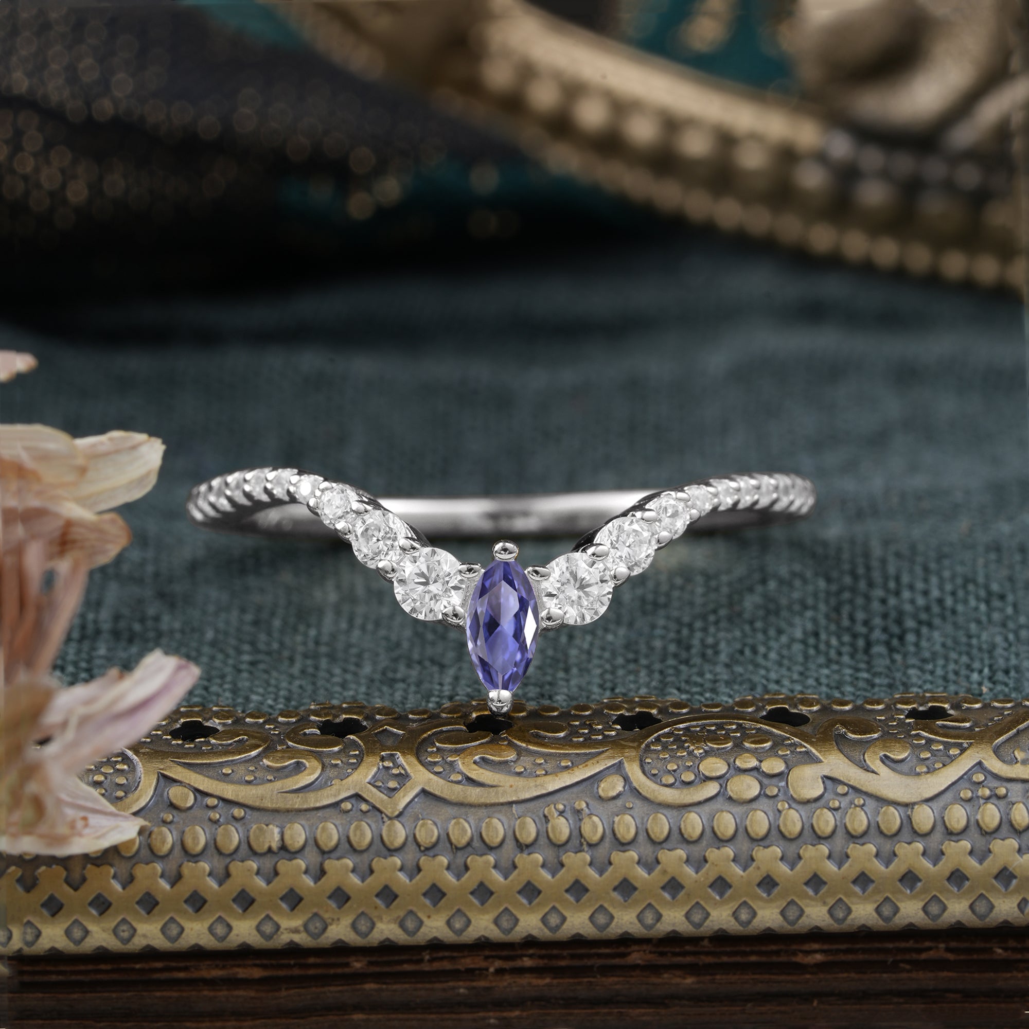 2 Prong Marquise & Round Cut Tanzanite Curved Wedding Band Stacking Ring