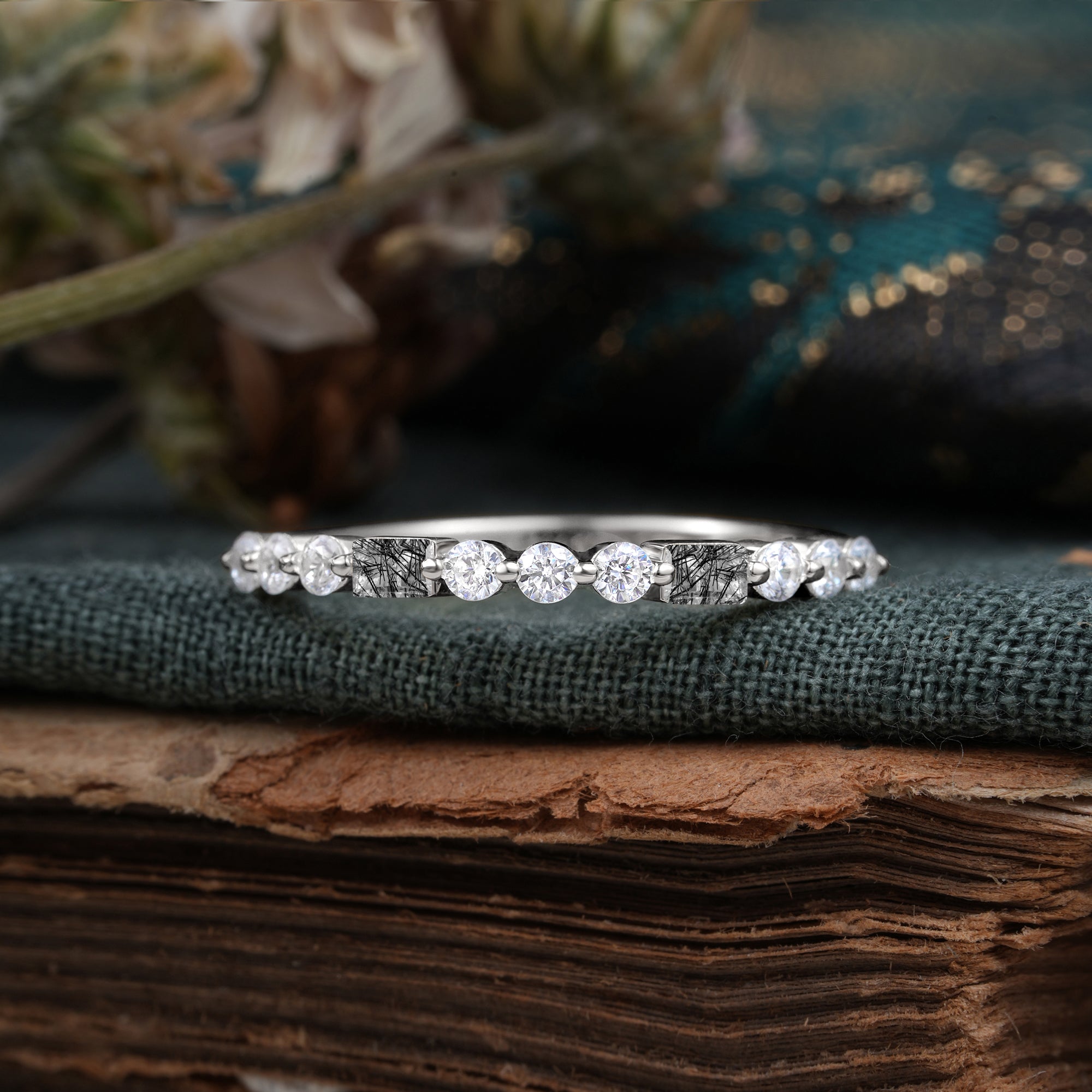 2 Prong Unique Black Rutilated Quartz Wedding Band Half Eternity Stacking Ring