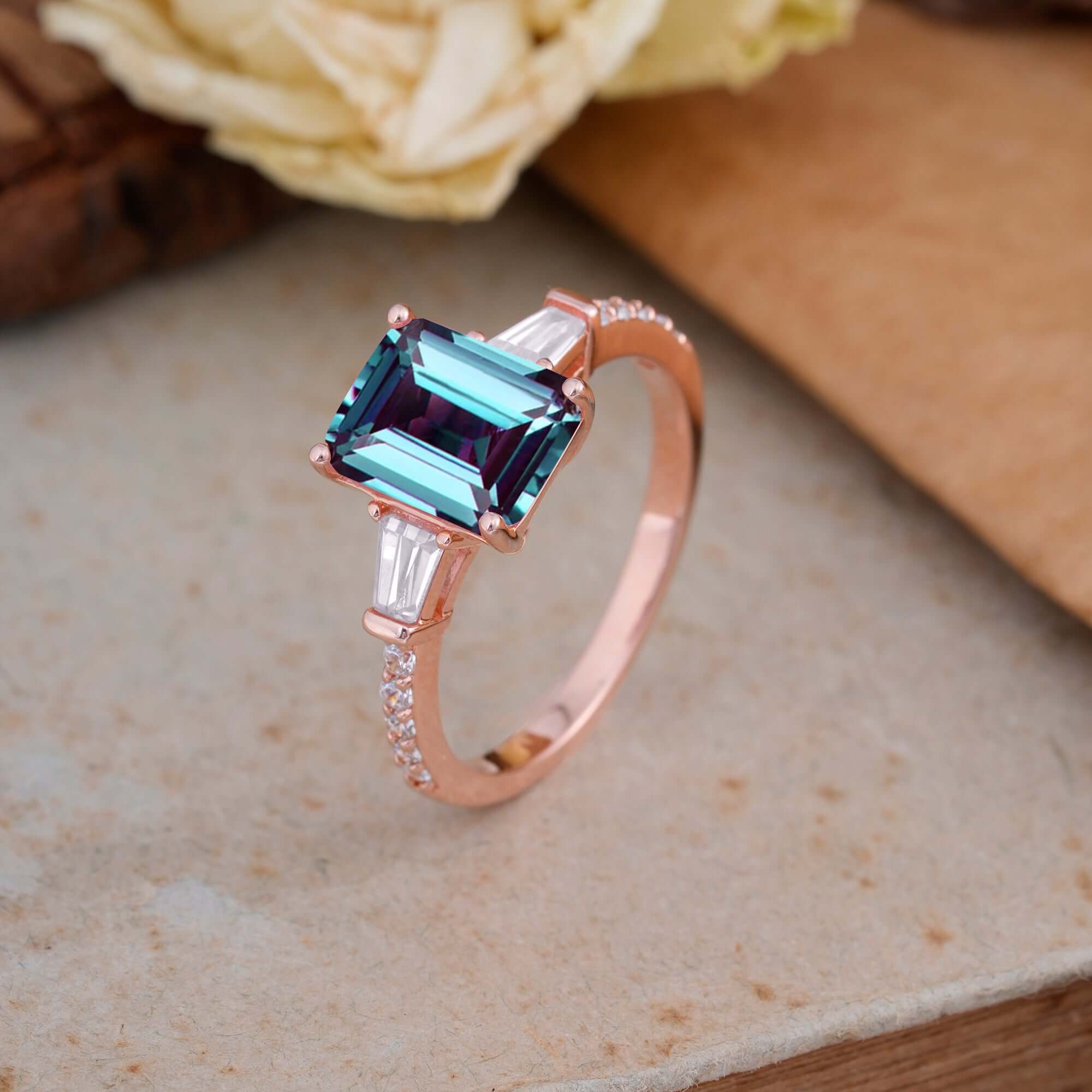 3 Carat Emerald Cut Alexandrite Ring Three Stone Engagement Ring