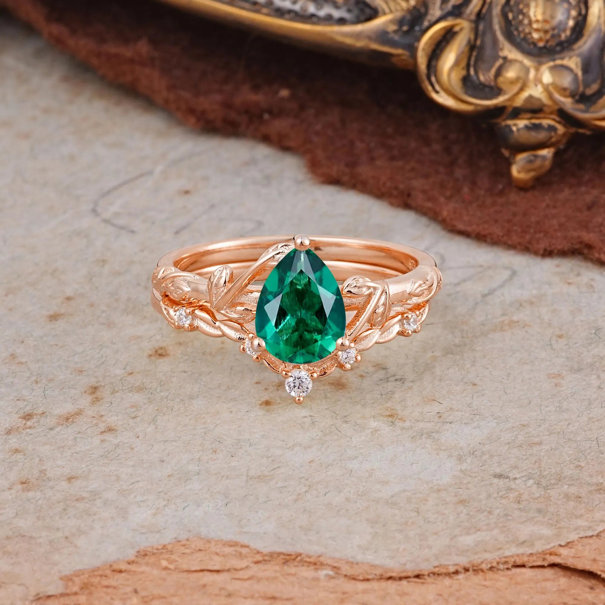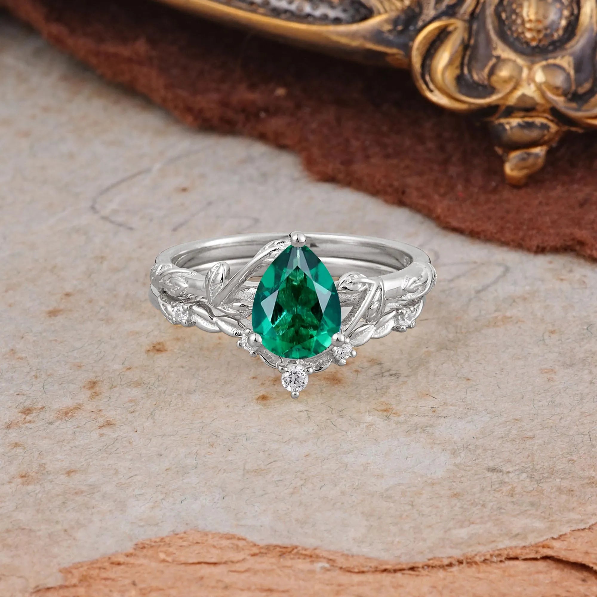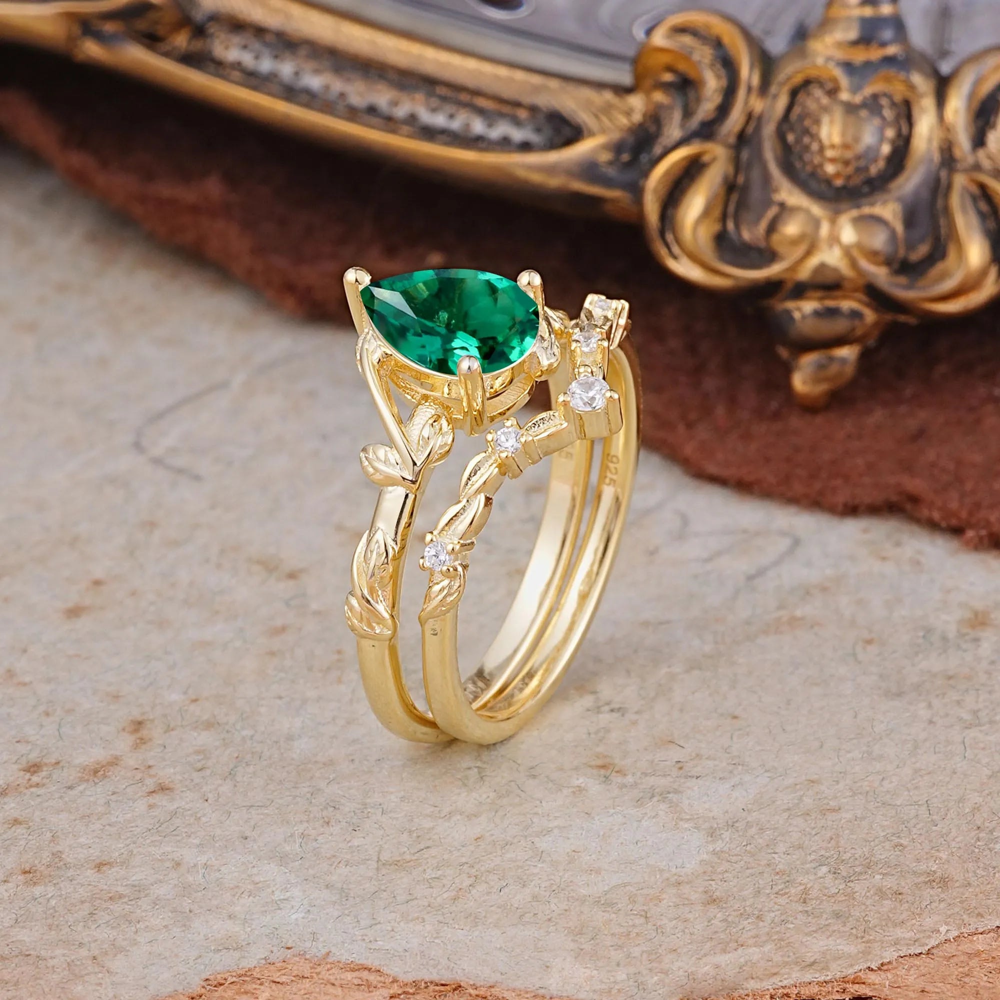 3 Prong Delicate Twisted Vine Wrapped Prong Pear Cut Emerald Stackable Rings