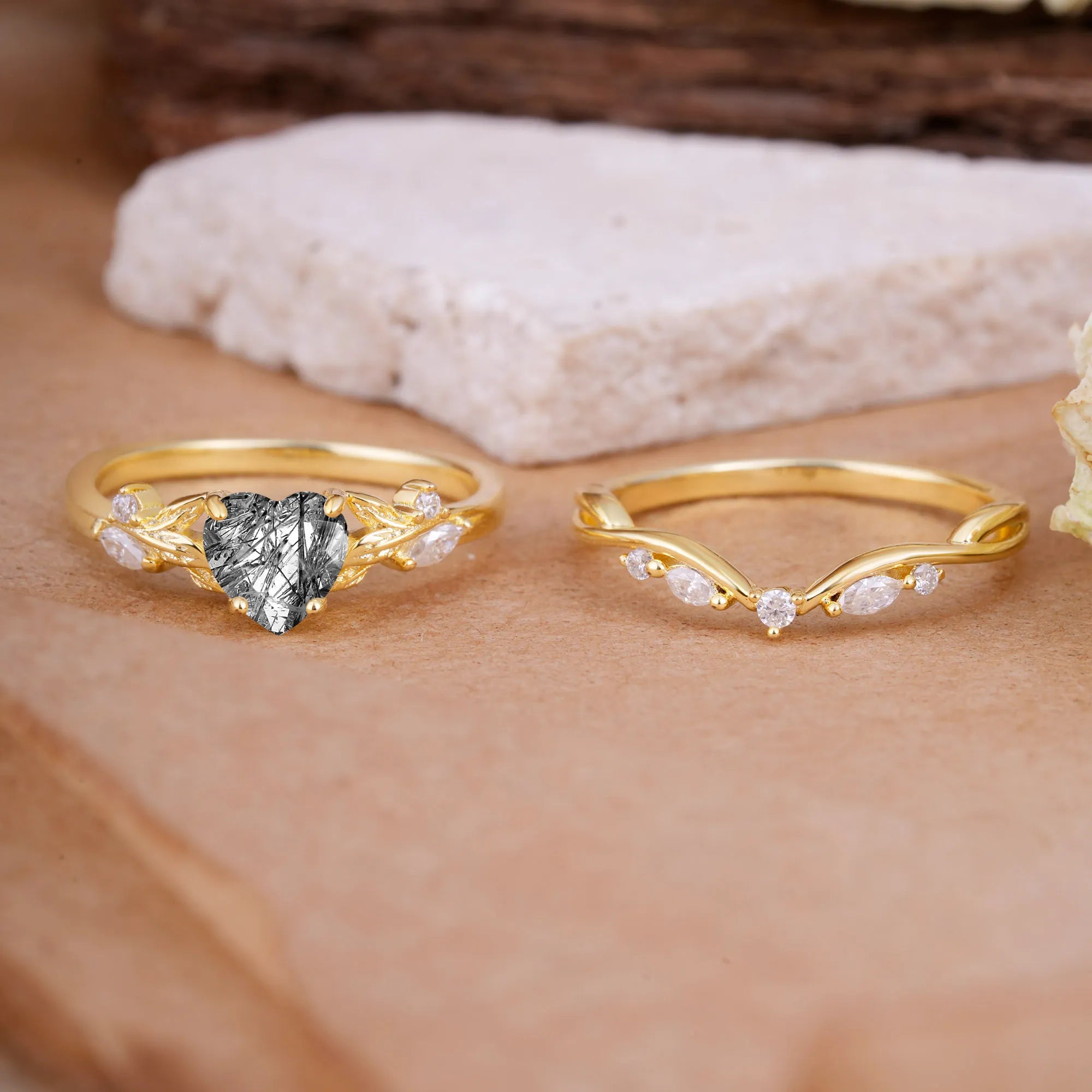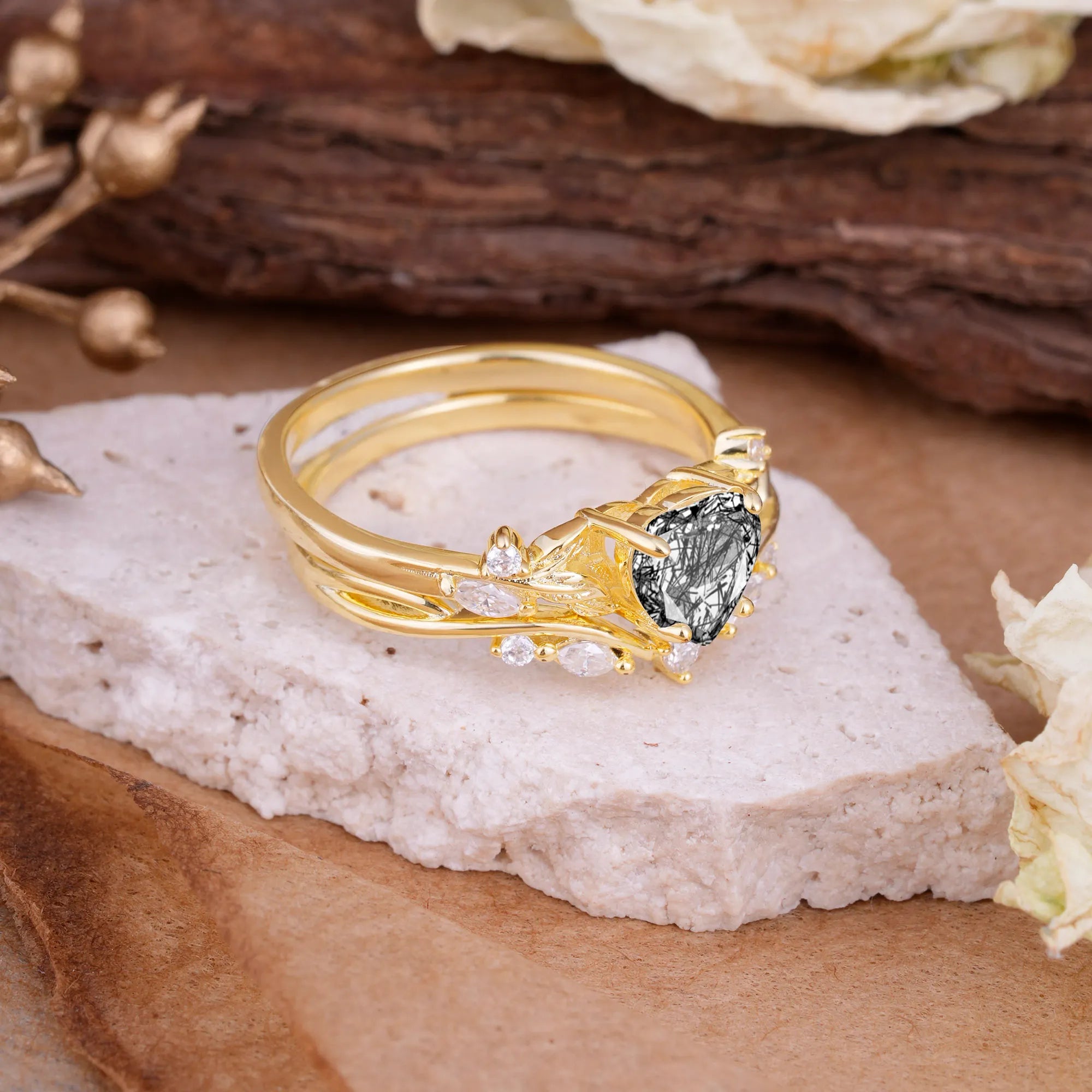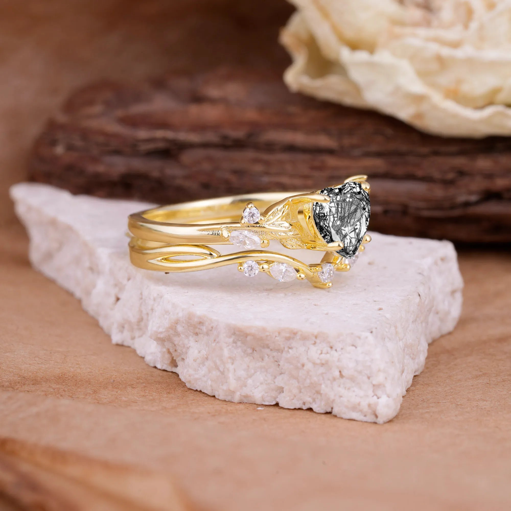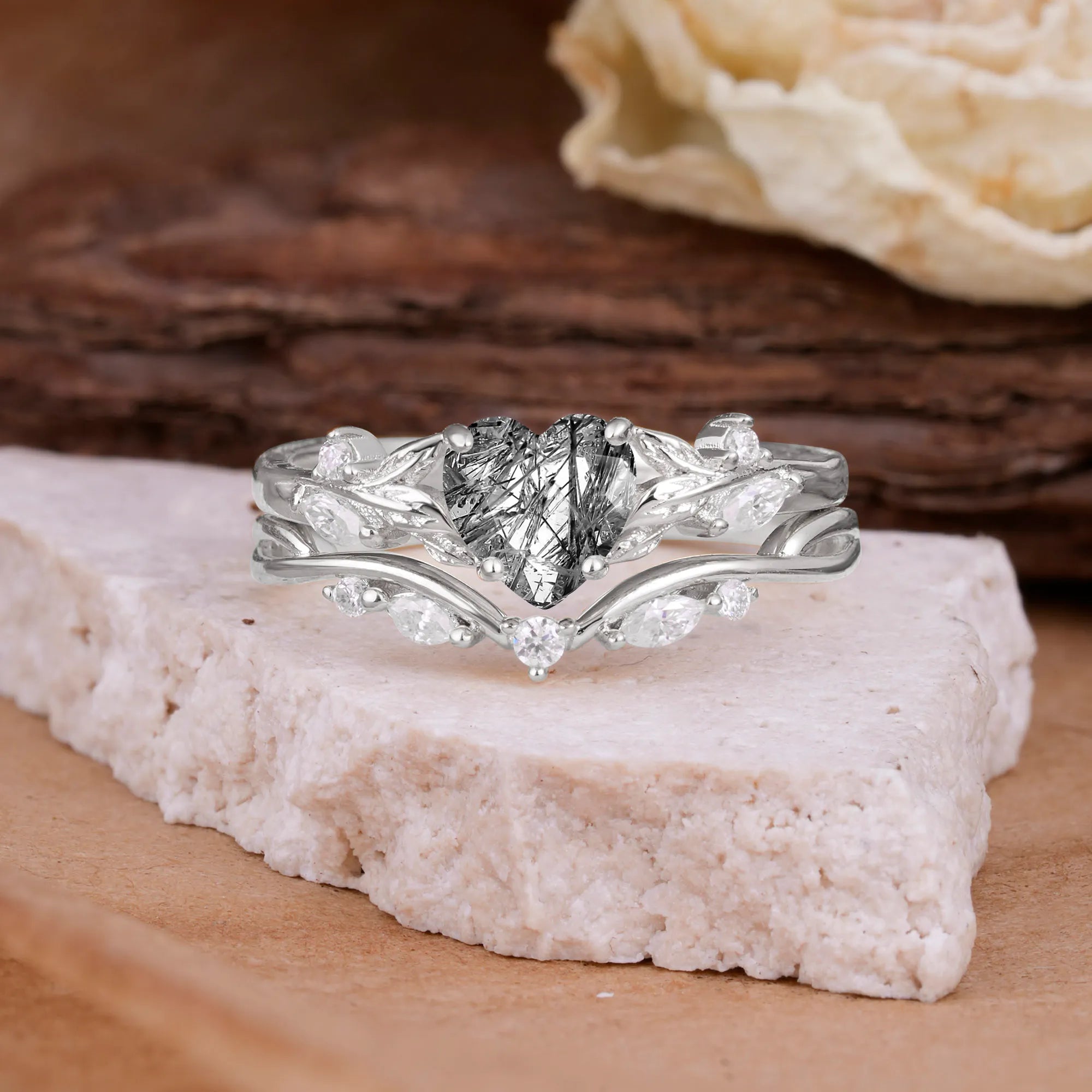 4-Prong Nature-Inspired Heart-Cut Black Rutilated Quartz Engagement Ring Set