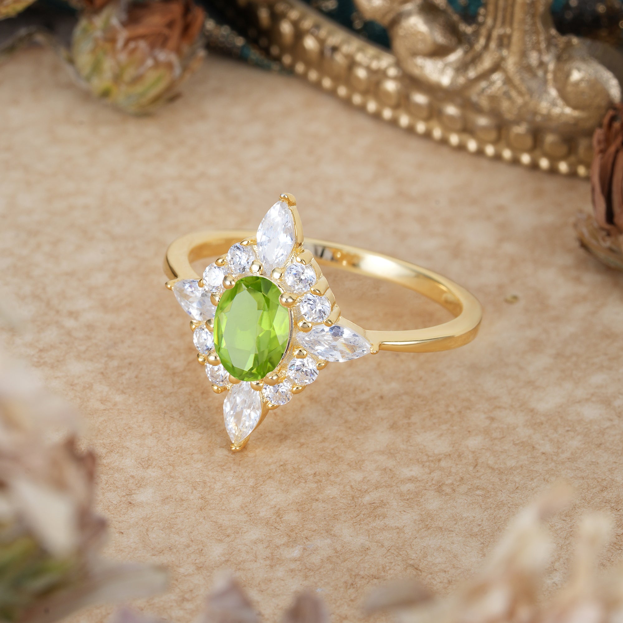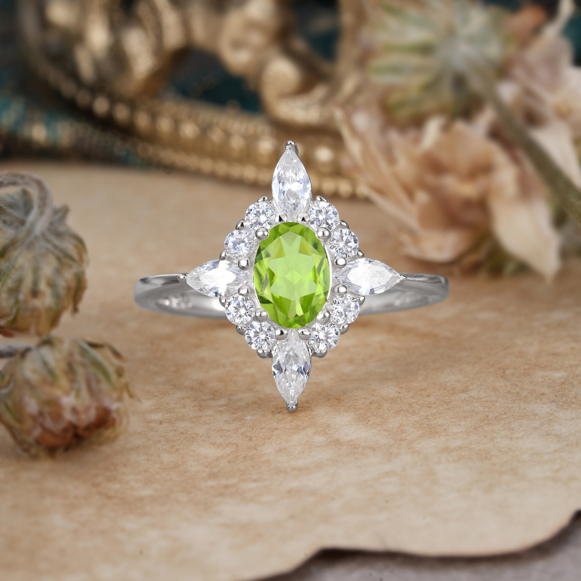 4 Prong Vintage 1 Carat Oval Cut Cluster Peridot Engagement Ring