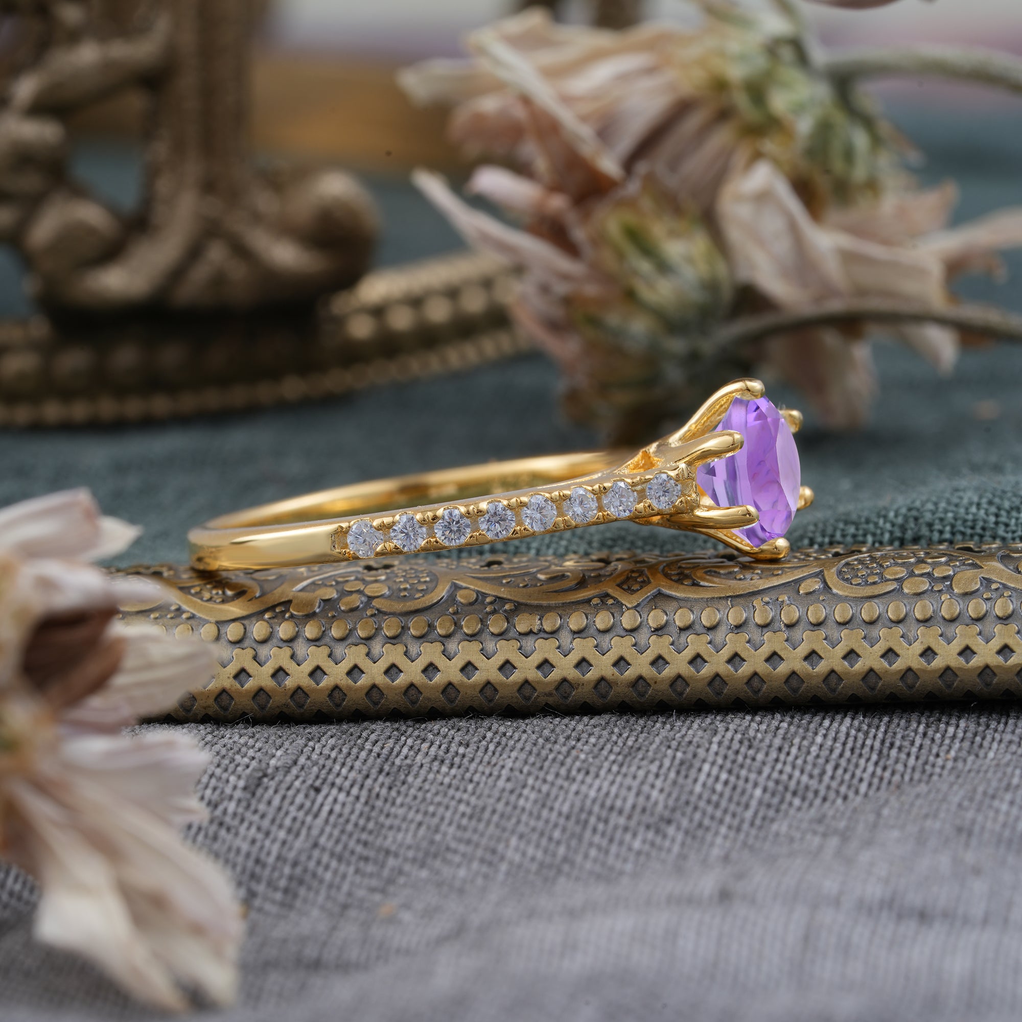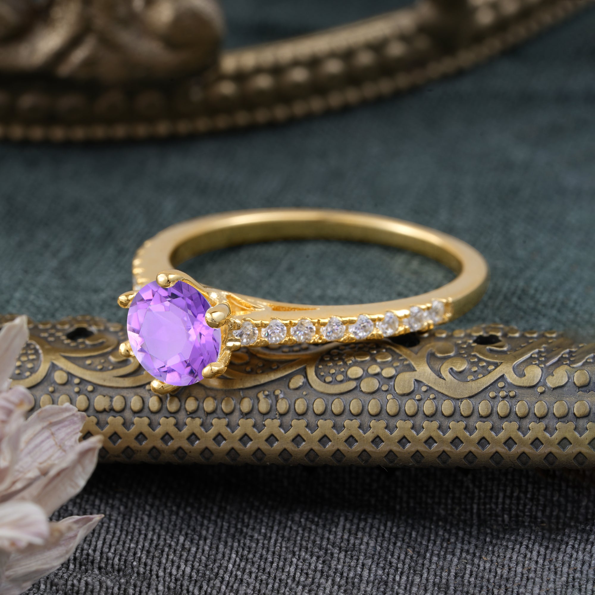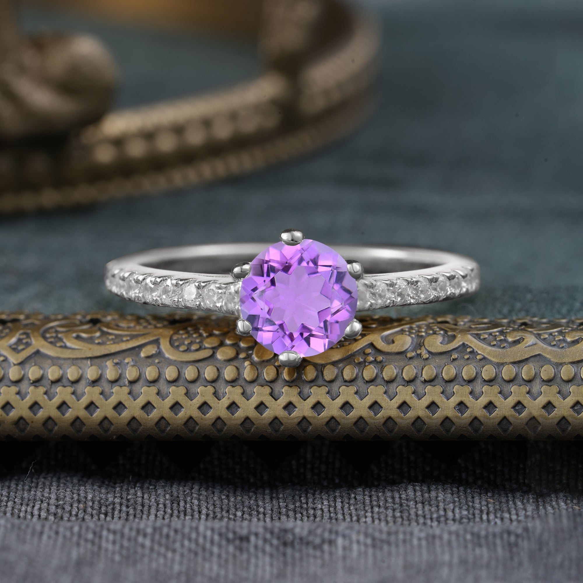 6-Prong Classic Round Cut Amethyst Engagement Ring Pave Bridal Ring