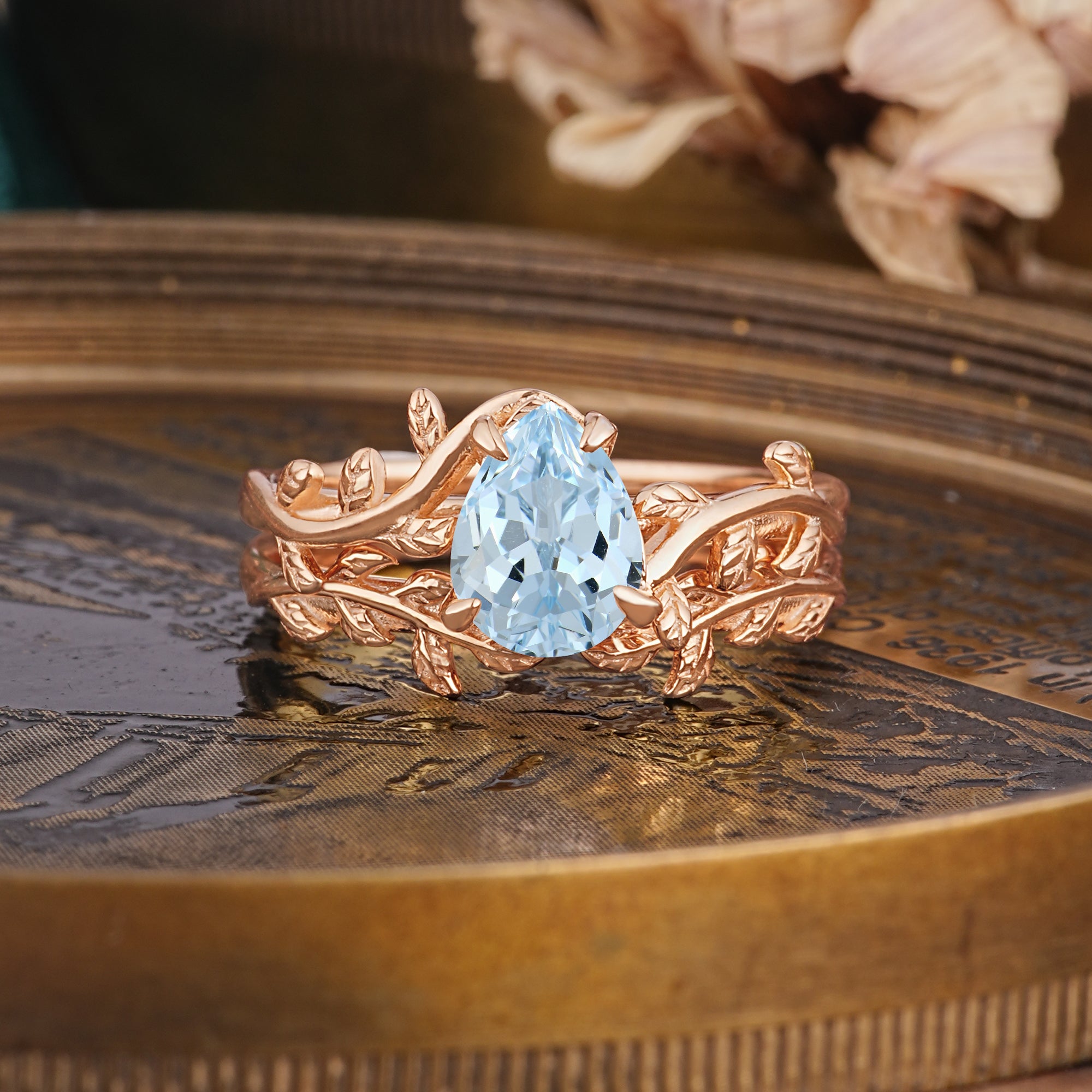 Artistic Vine Themed 4 - Prong Pear Cut Aquamarine Stackable Rings
