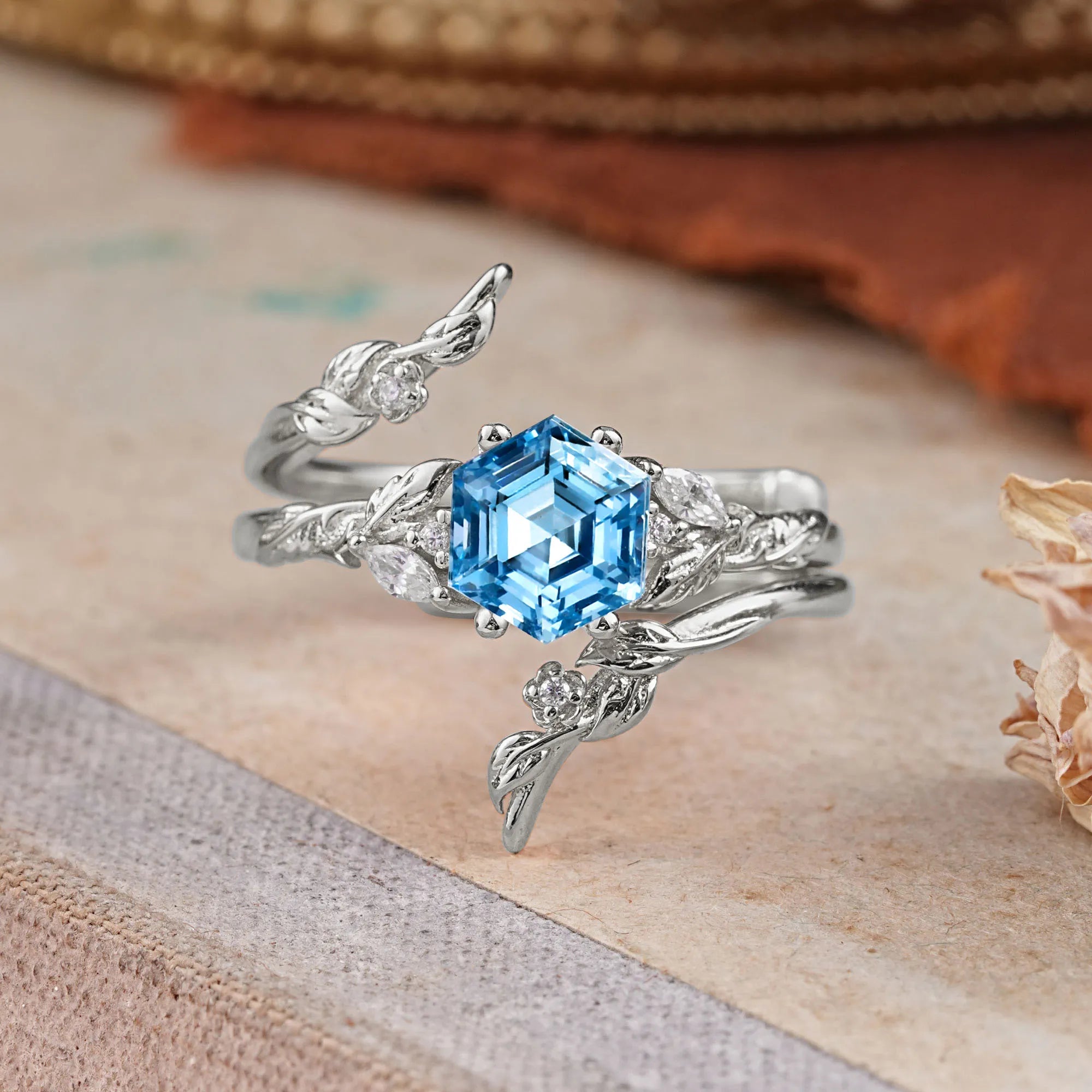💖Botanical Hexagon Aquamarine Engagement Ring Suite