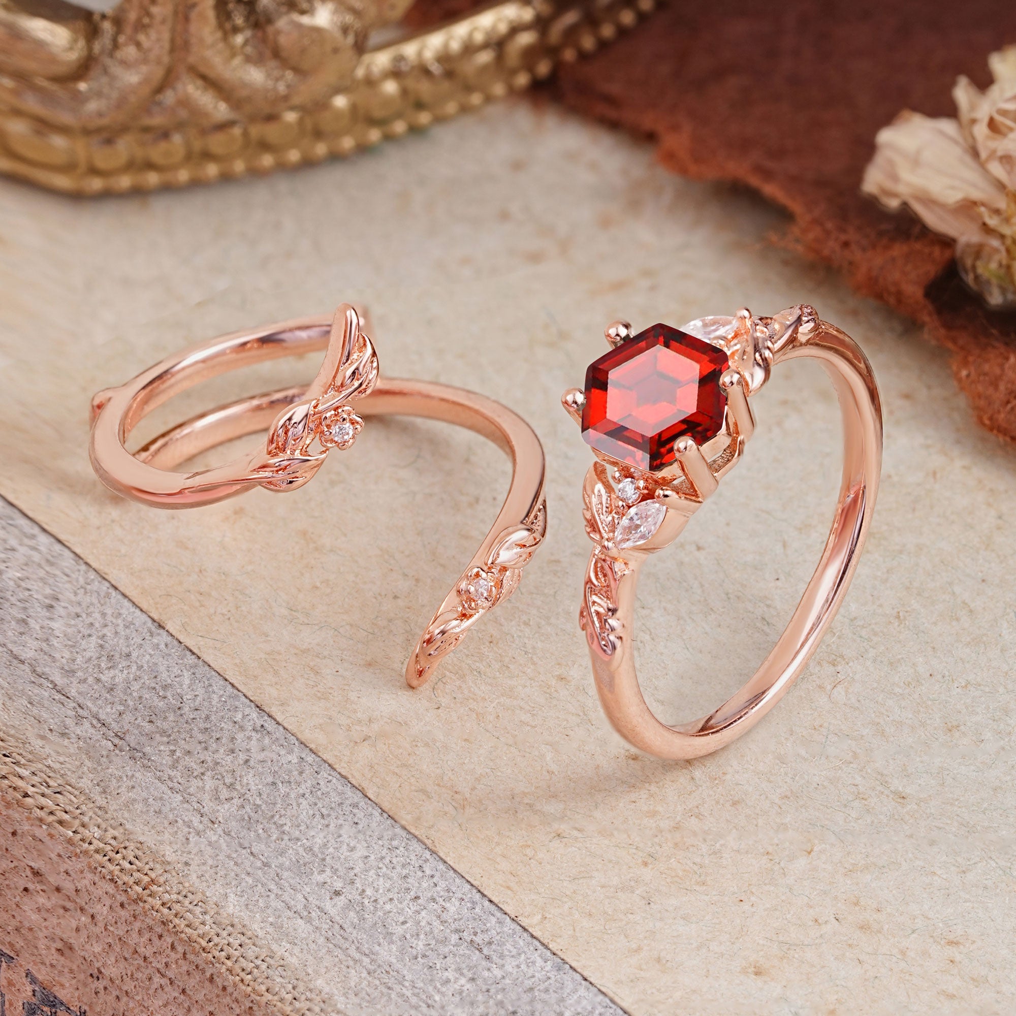 Botanical 4 Prong Hexagon Garnet Engagement Ring Suite