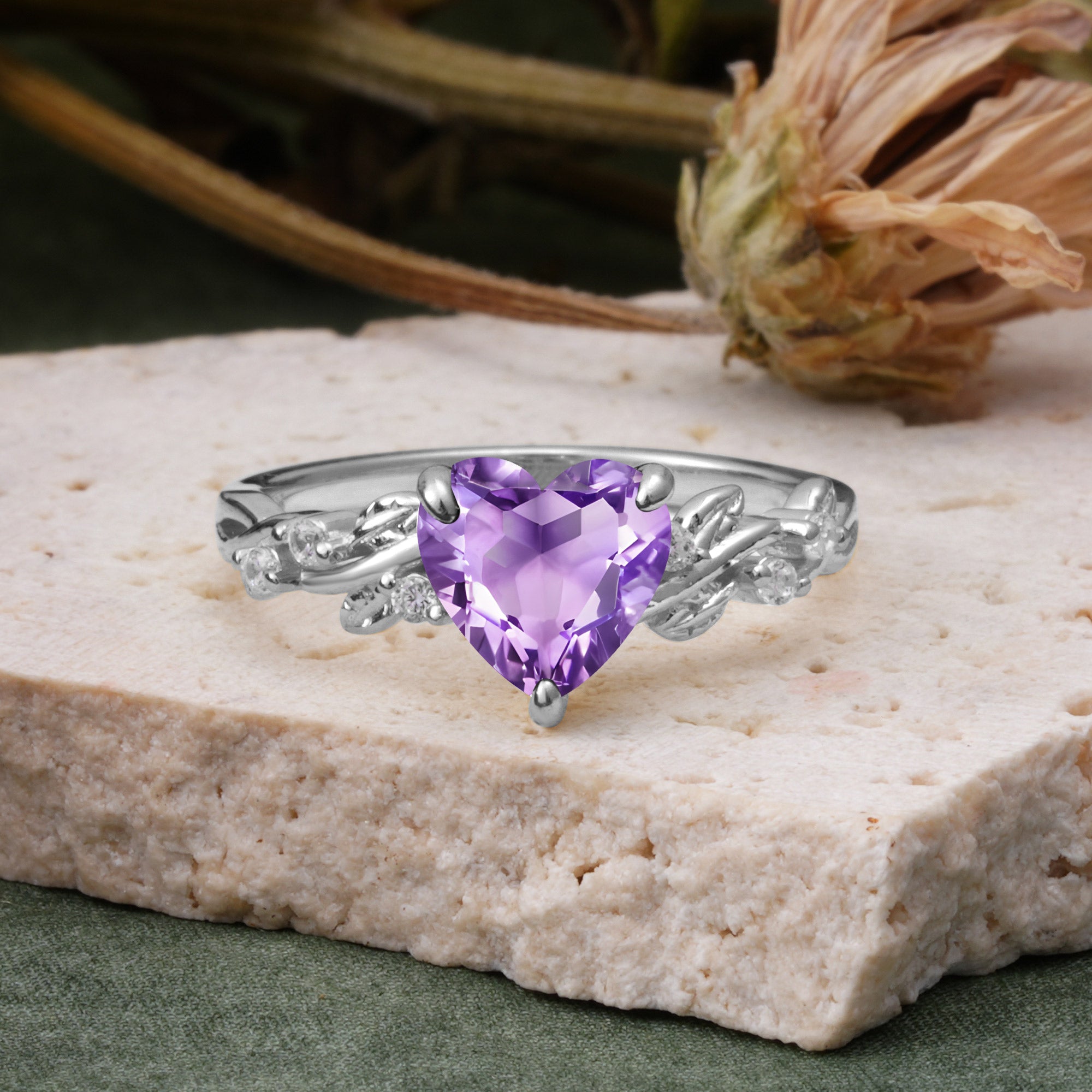 Classic 3 Prong Heart Cut Amethyst Leaf Engagement Ring