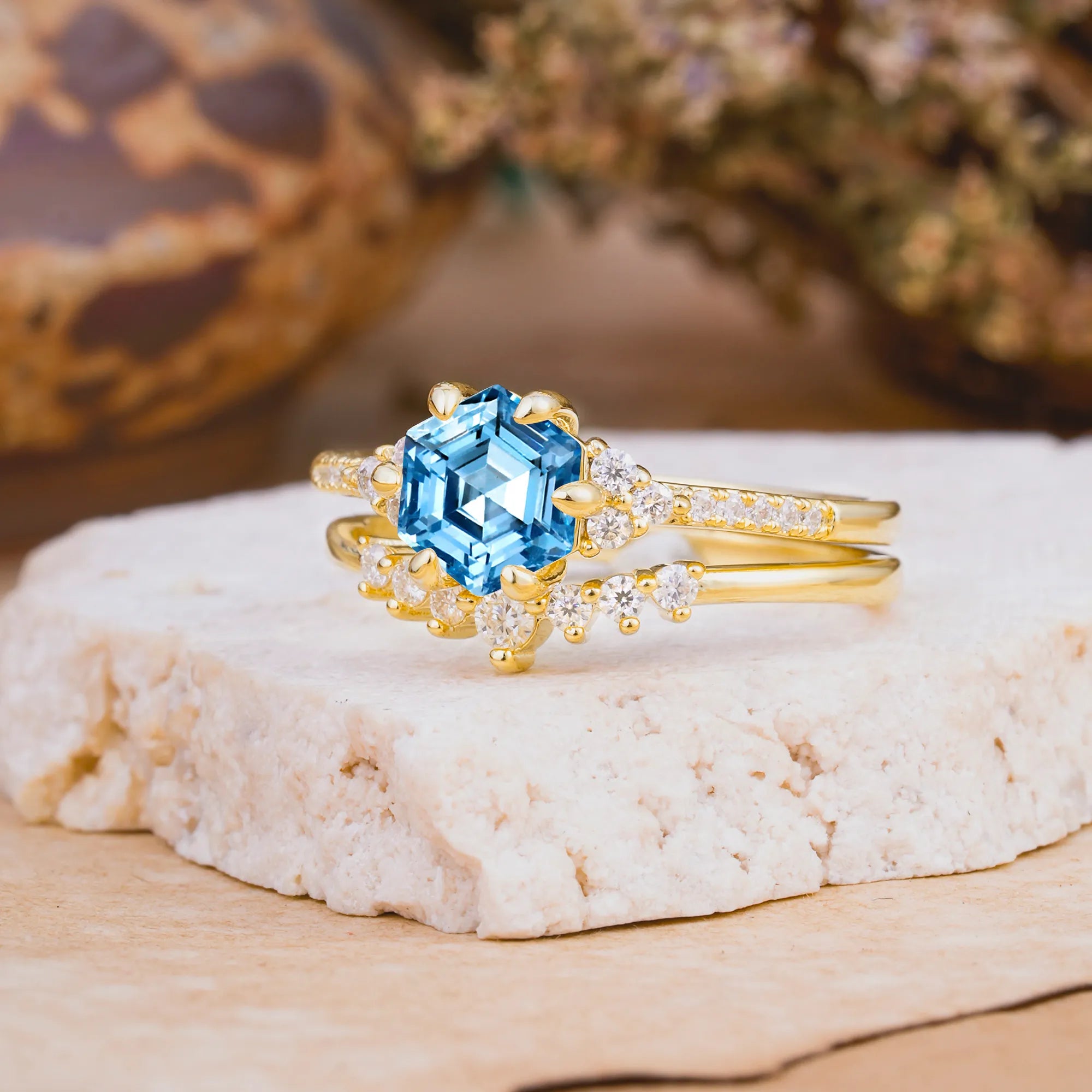 Classic 6-Prong Hexagonal-Cut Aquamarine Engagement Ring Set