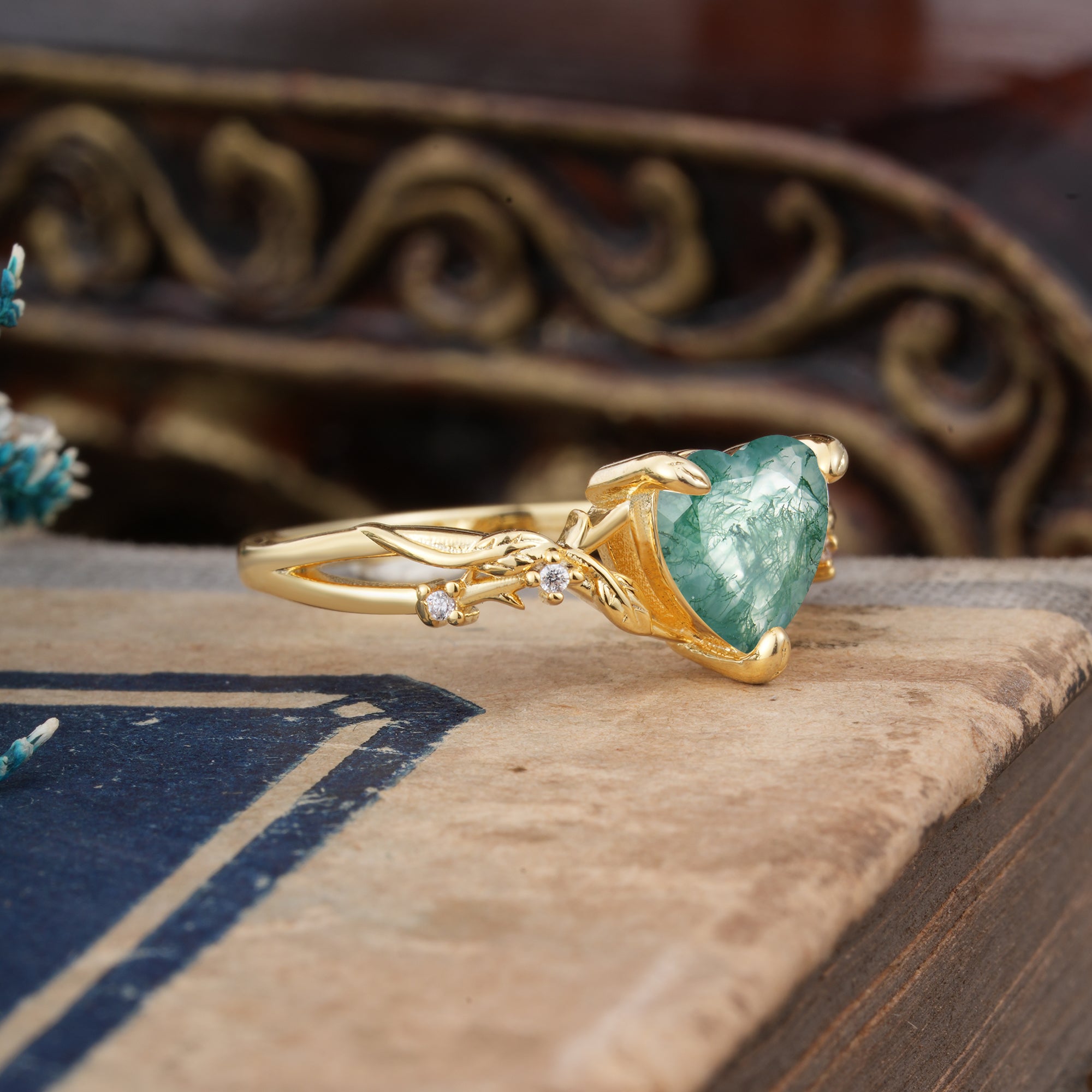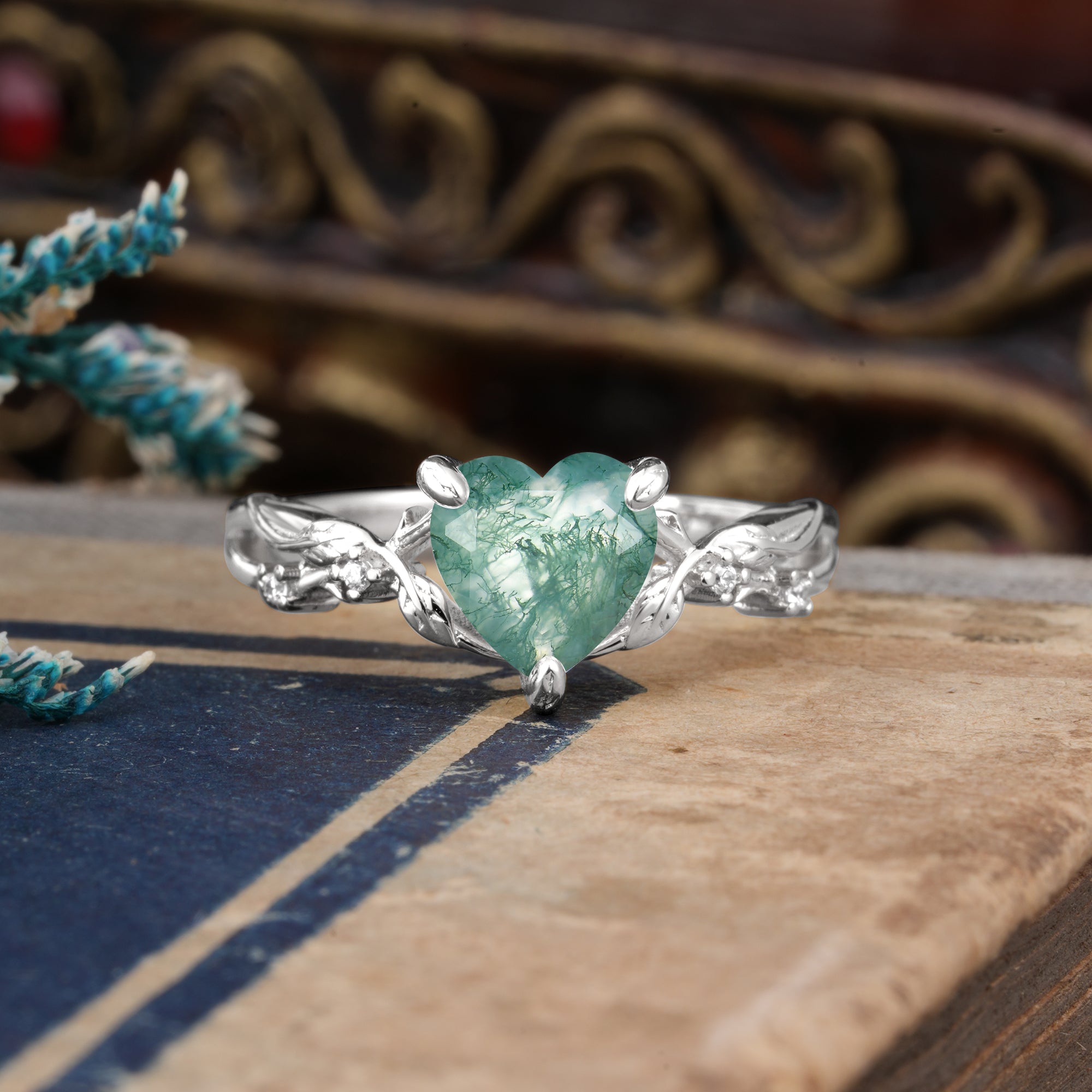 Classic Nature-Inspired 3-Prong Heart-Shaped Natural Moss Agate Engagement Ring