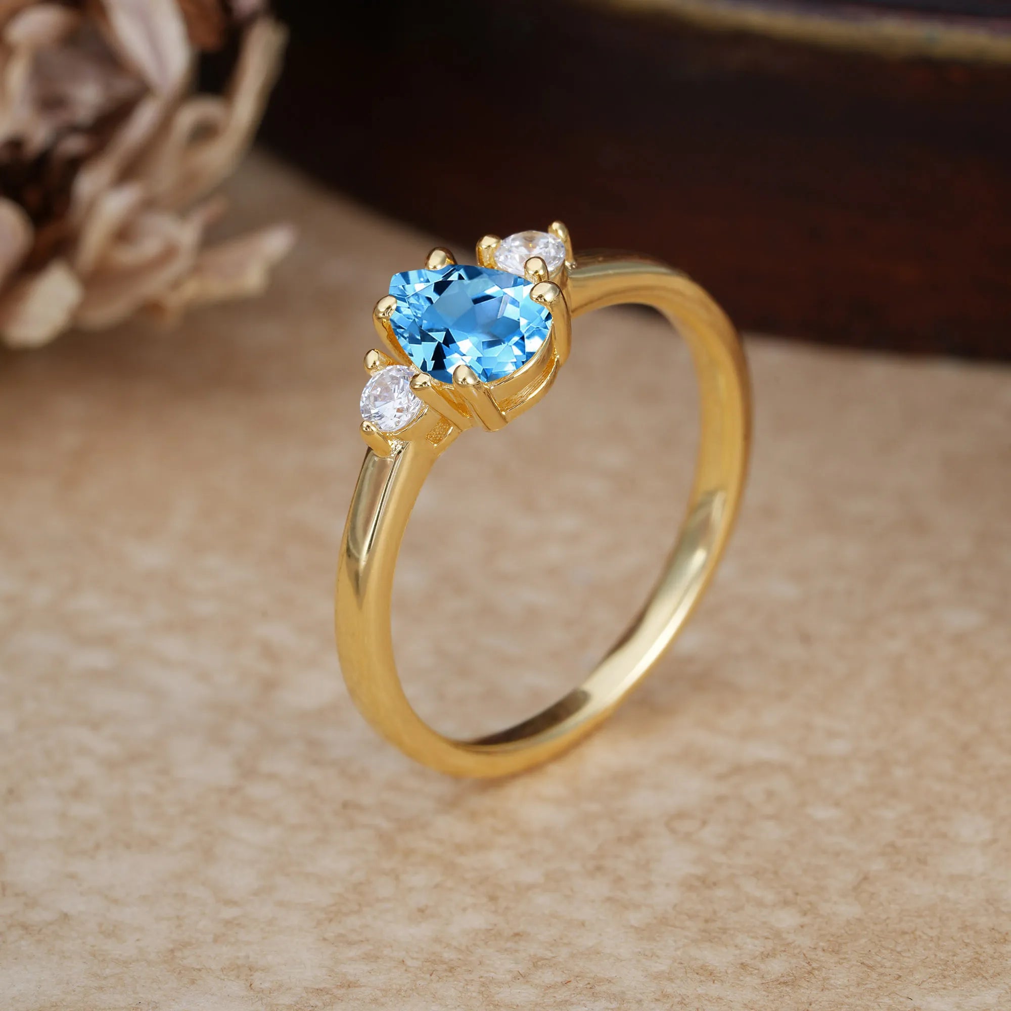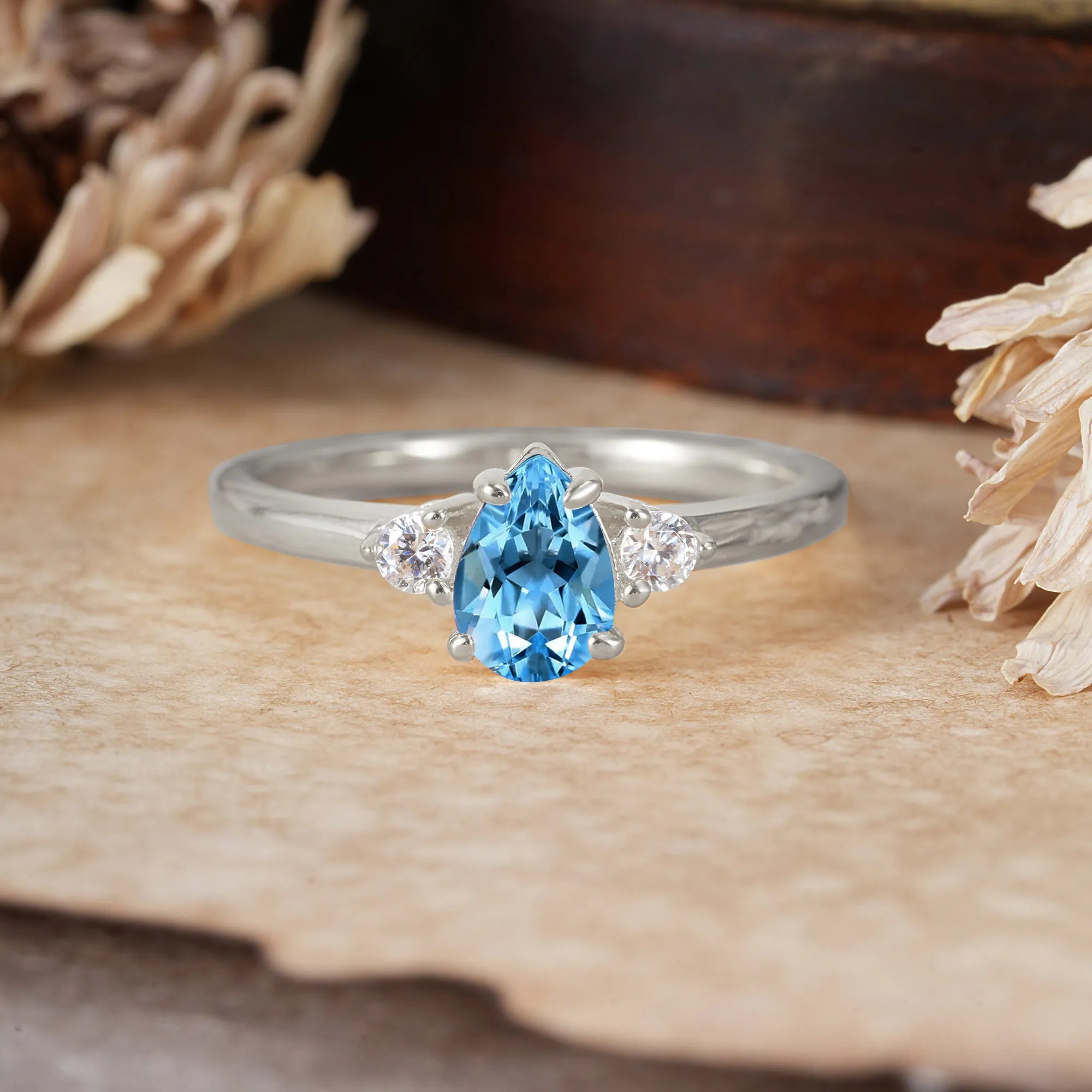 Classic Pear Cut Aquamarine Three Stone Promise Ring Four Claw Prong Setting