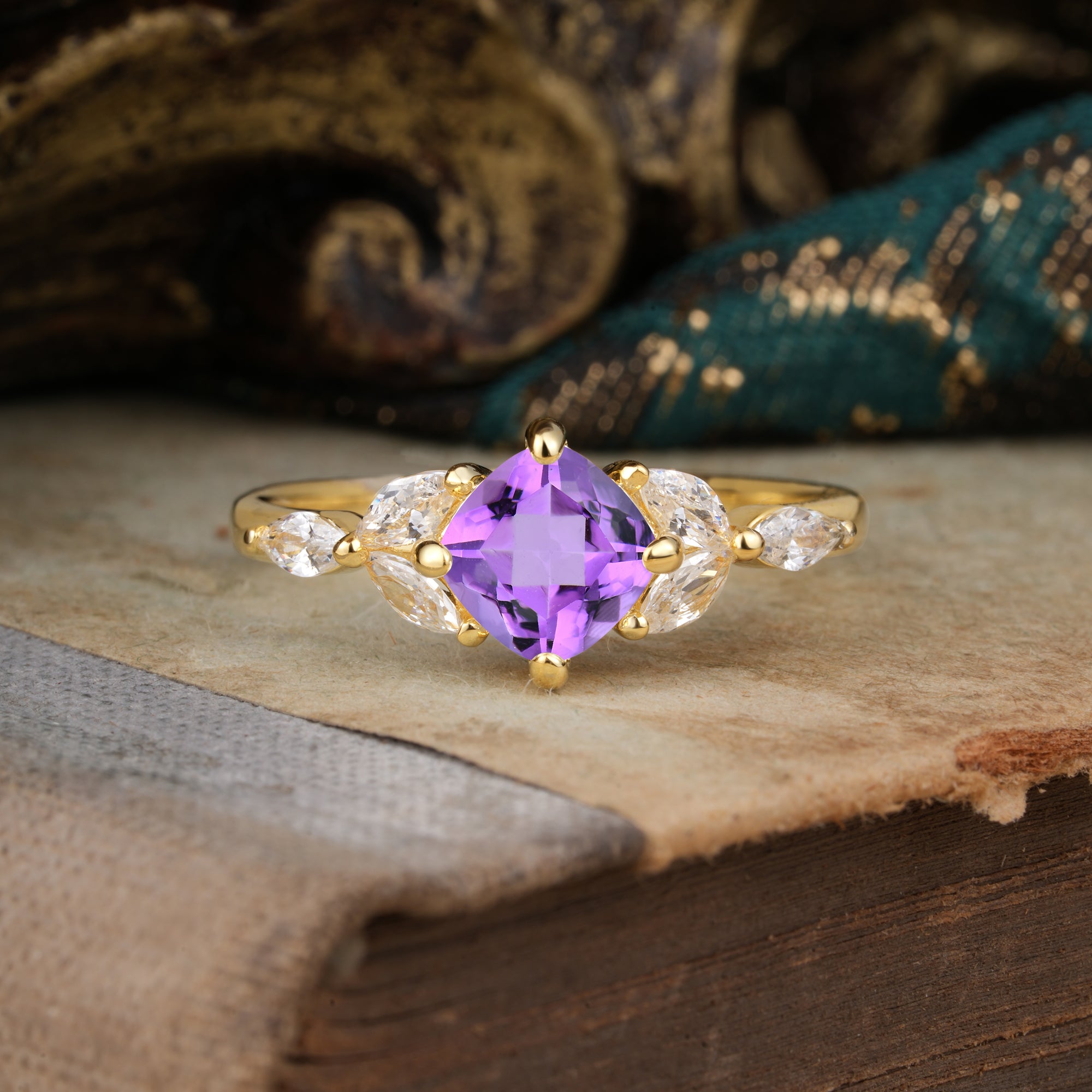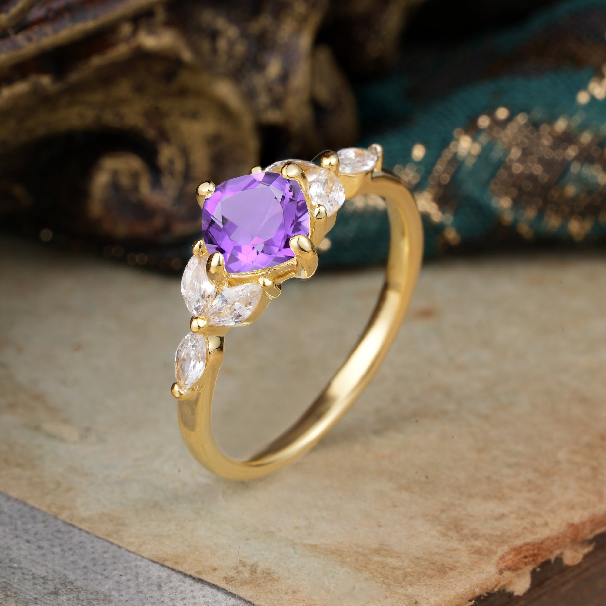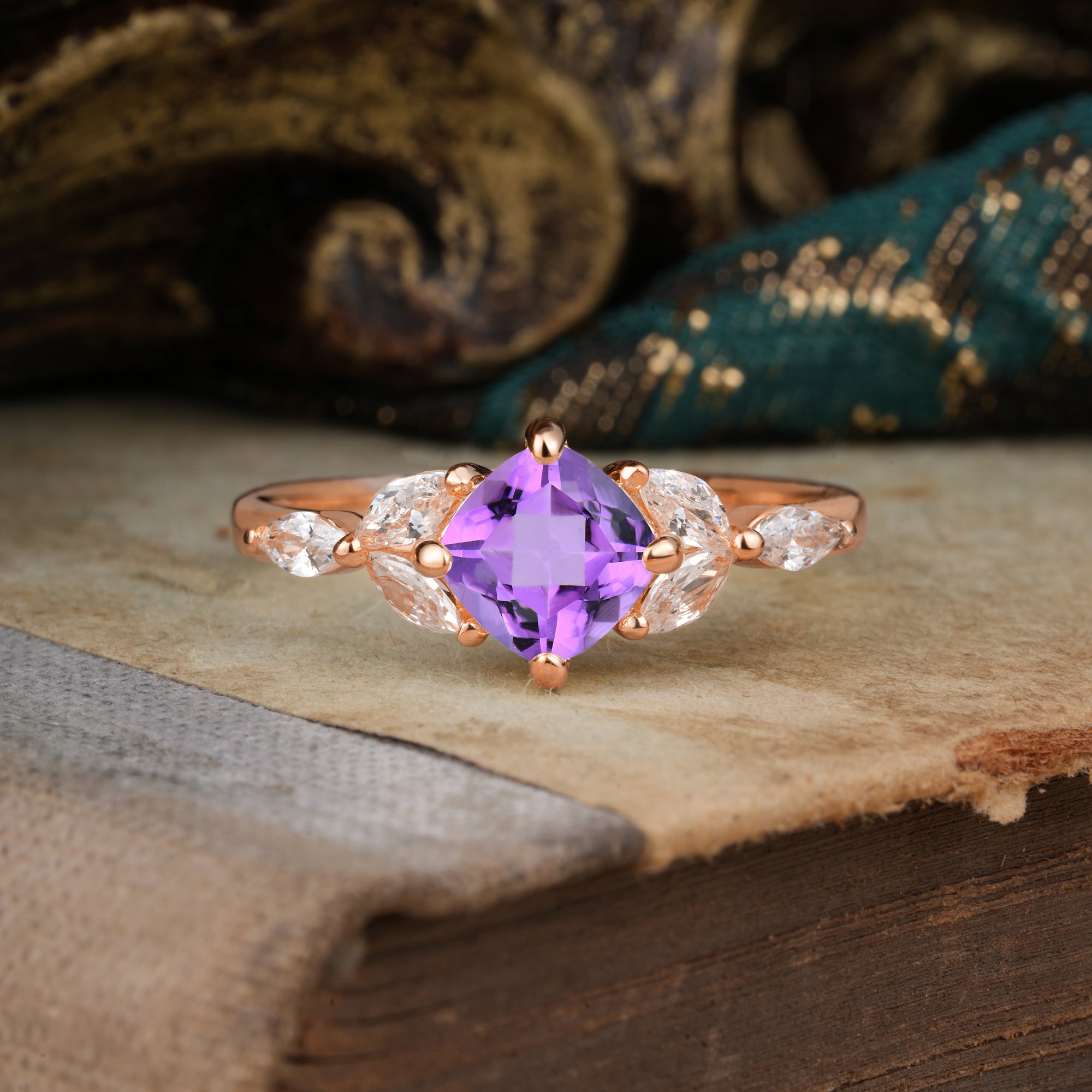 Cushion Cut 1 Carat Amethyst Anniversary Ring Classic Side Stone Ring