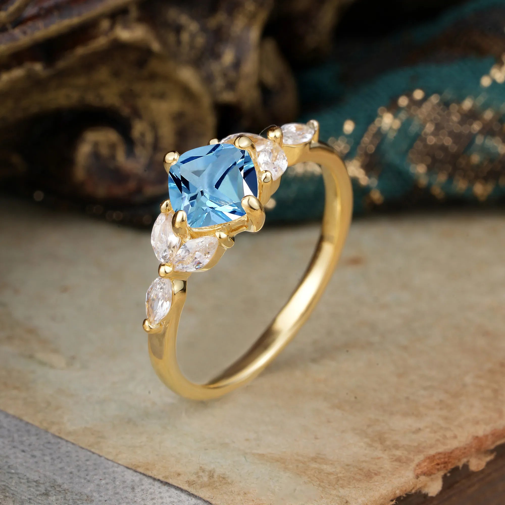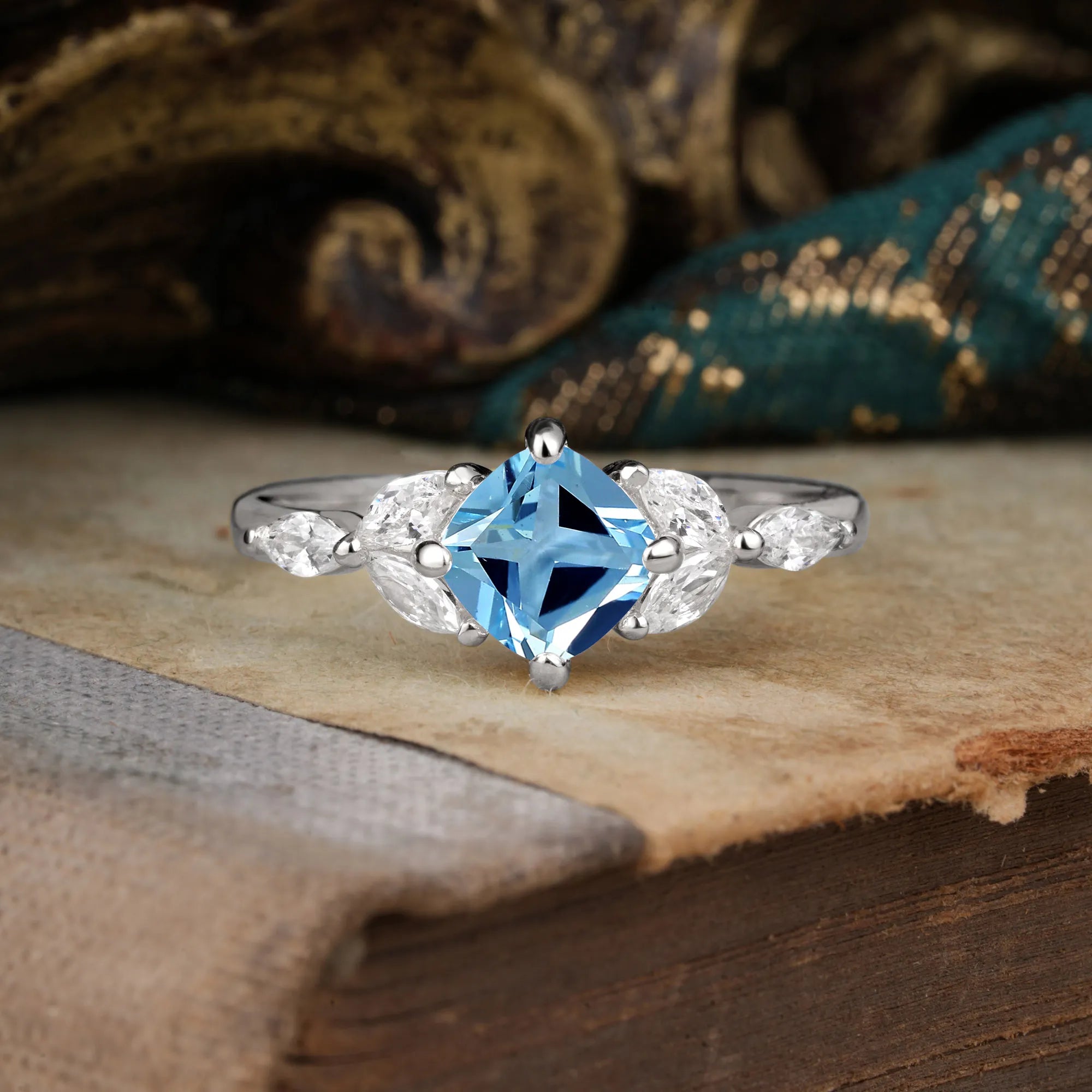 Cushion Cut 1 Carat Aquamarine Anniversary Ring Classic Side Stone Ring