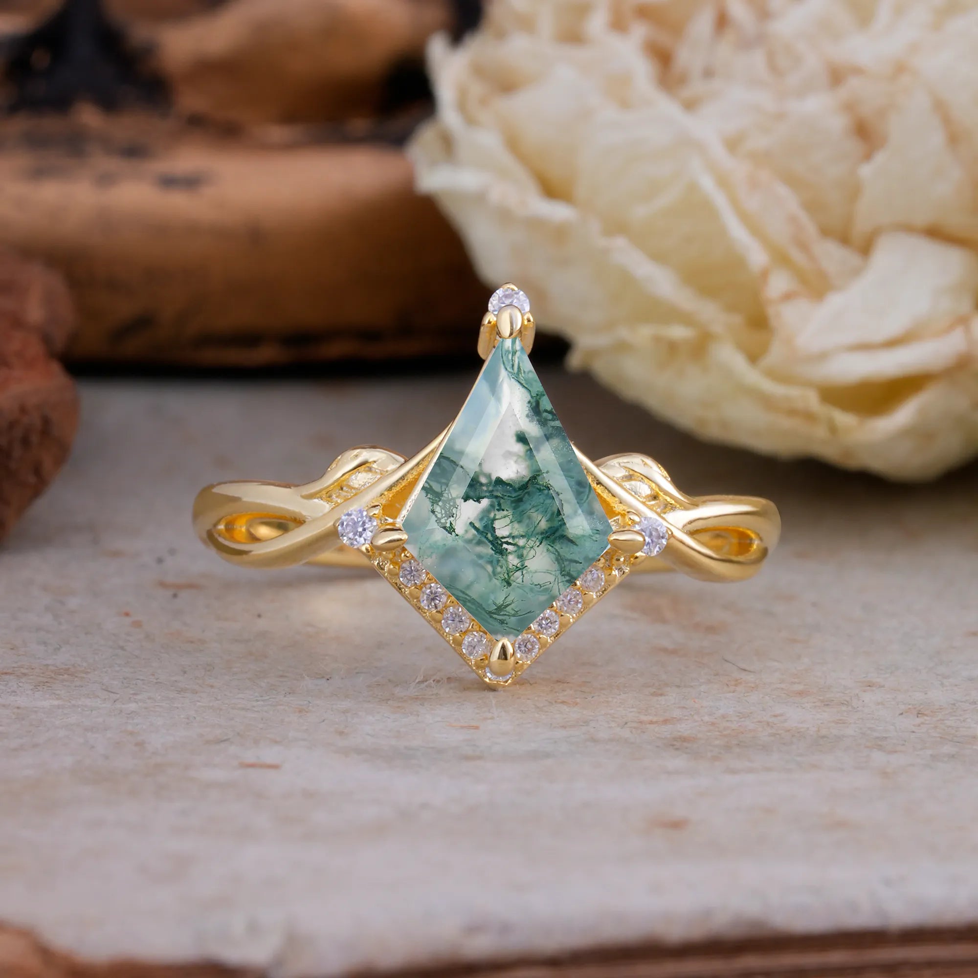 | Stone Material: Moss Agate | Stone Material: Moissanite |