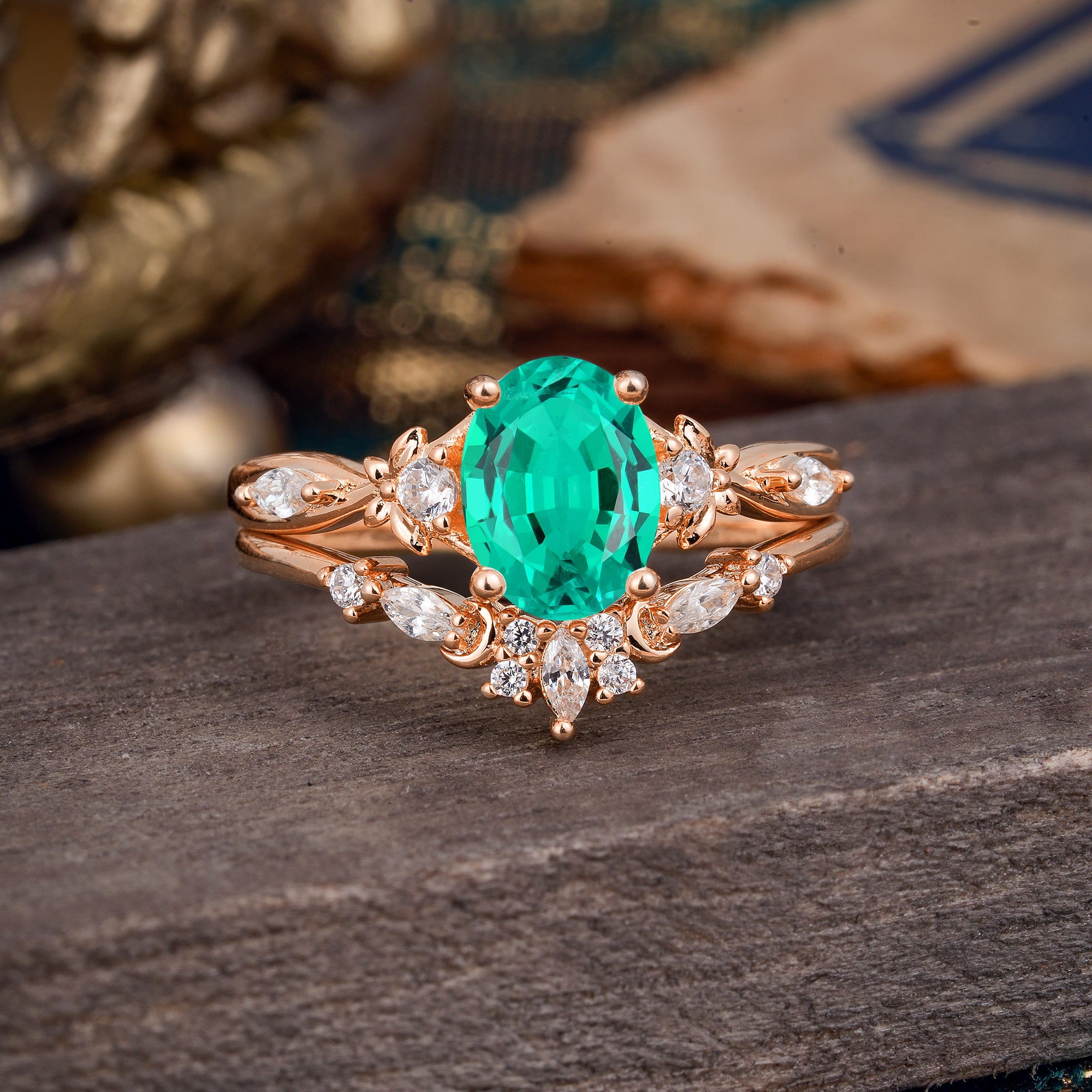 Elegant Oval Cut Emerald Engagement Ring Set – 2PC